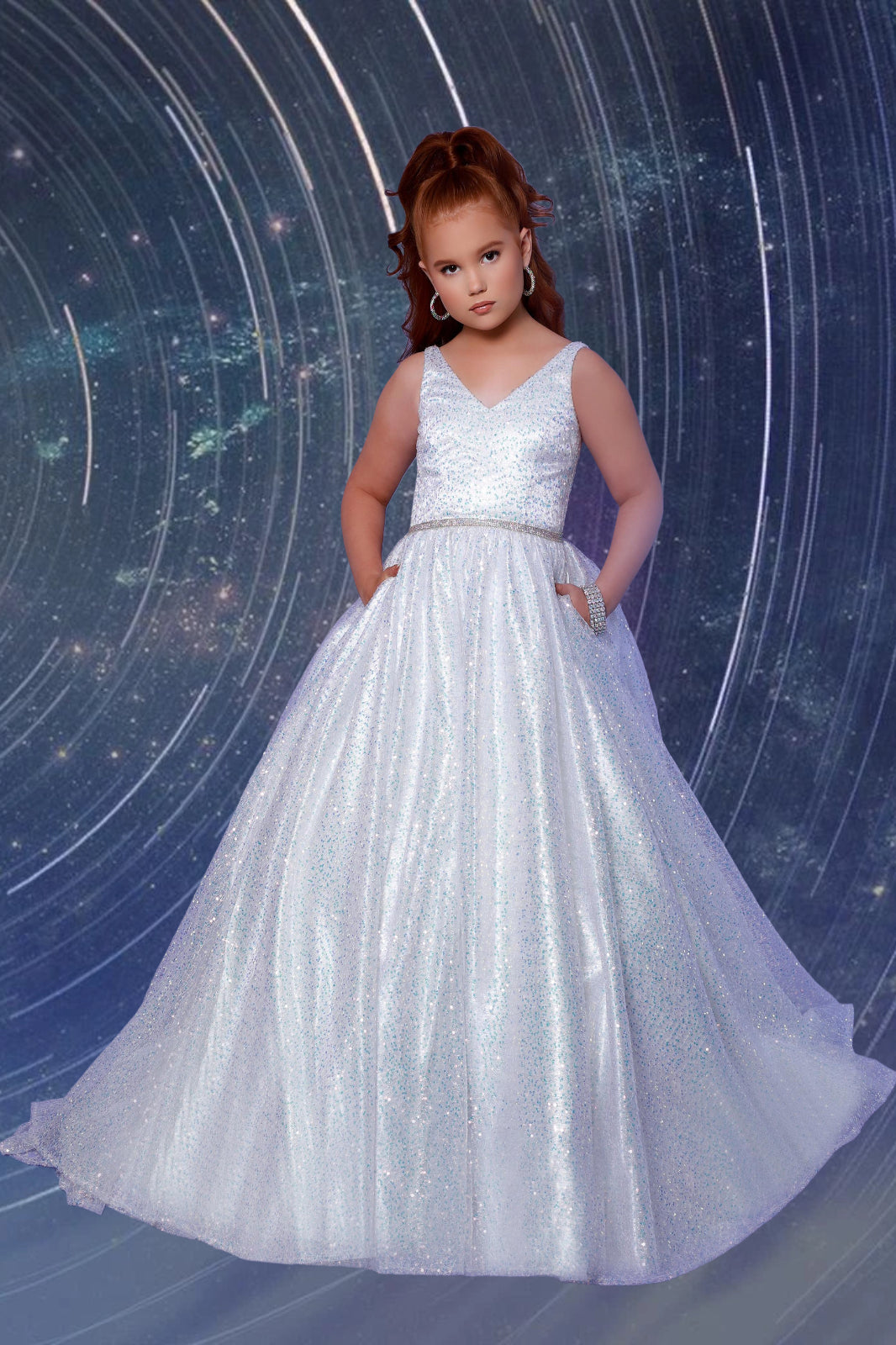 Radiate starry brilliance in the Adelina gown from the 2Cute Collection. This full-length glitter ball gown is a showstopper with its shimmering sparkle finish, elegant V-neck bodice, and matching waistband that accentuates the silhouette. Designed with practical side pockets and a smooth, voluminous skirt, this gown blends glamour and comfort effortlessly. Available in dazzling white, soft pink, icy blue, and shimmering silver, it's the perfect dress for pageants, birthdays, portraits, or any special celebration where she deserves to shine.