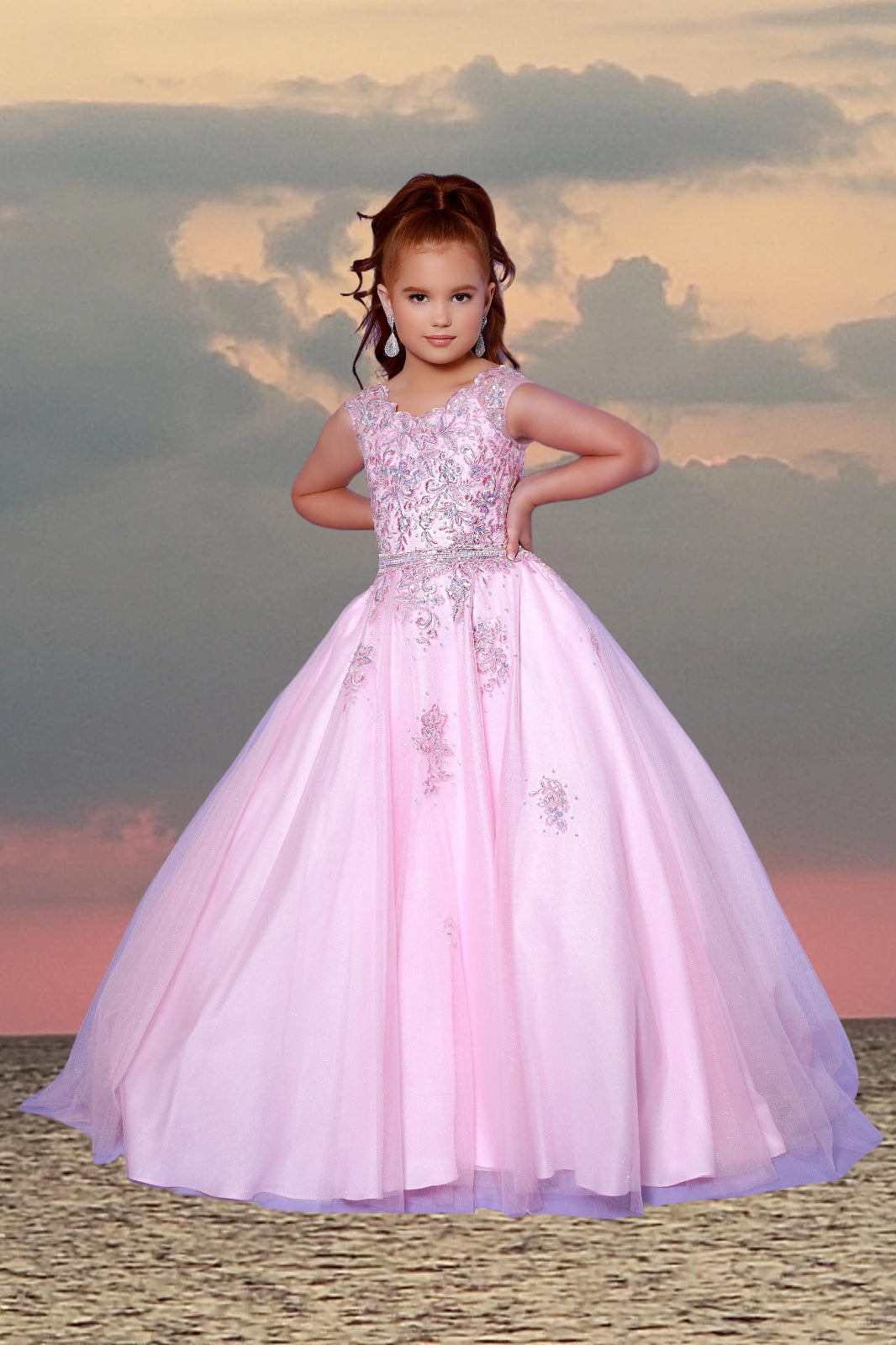 The Juliana Grace Gown from the 2Cute Collection is the definition of regal charm. With its beautifully embroidered bodice, floral appliqué details, and full-length glitter skirt, this gown makes a statement in both royal blue and blush pink. Whether she’s gracing the pageant stage, capturing timeless birthday portraits, or lighting up a formal celebration, this dress offers all the grandeur and sparkle a young fashion icon deserves. Designed for girls who love elegance with a hint of drama, this gown is a showpiece fit for unforgettable moments.