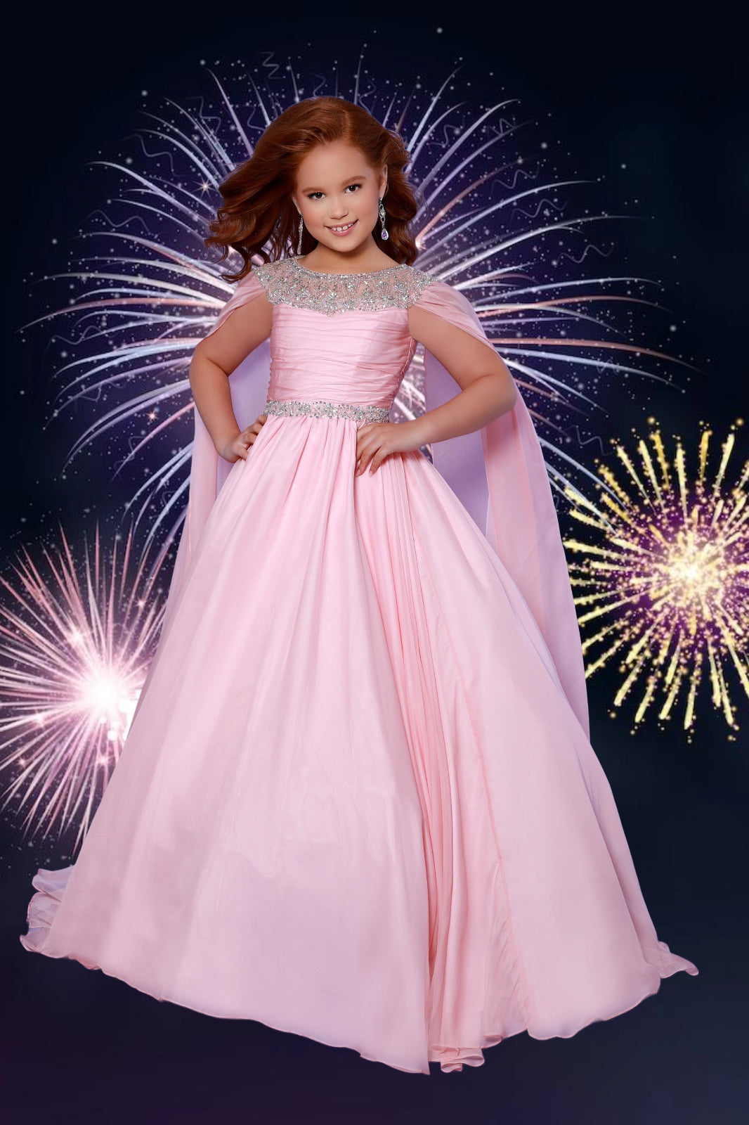 Make her moment unforgettable in the 2Cute Julissa gown—designed to turn heads and capture hearts. This breathtaking pageant dress features a ruched bodice adorned with sparkling crystal trim and elegant draped capes that flow effortlessly behind her. With a full-length ball gown skirt in vibrant pink or radiant orange, Julissa is perfect for birthdays, pageants, and standout special occasions. Let her shine with confidence and style in a gown that feels straight out of a fairytale.