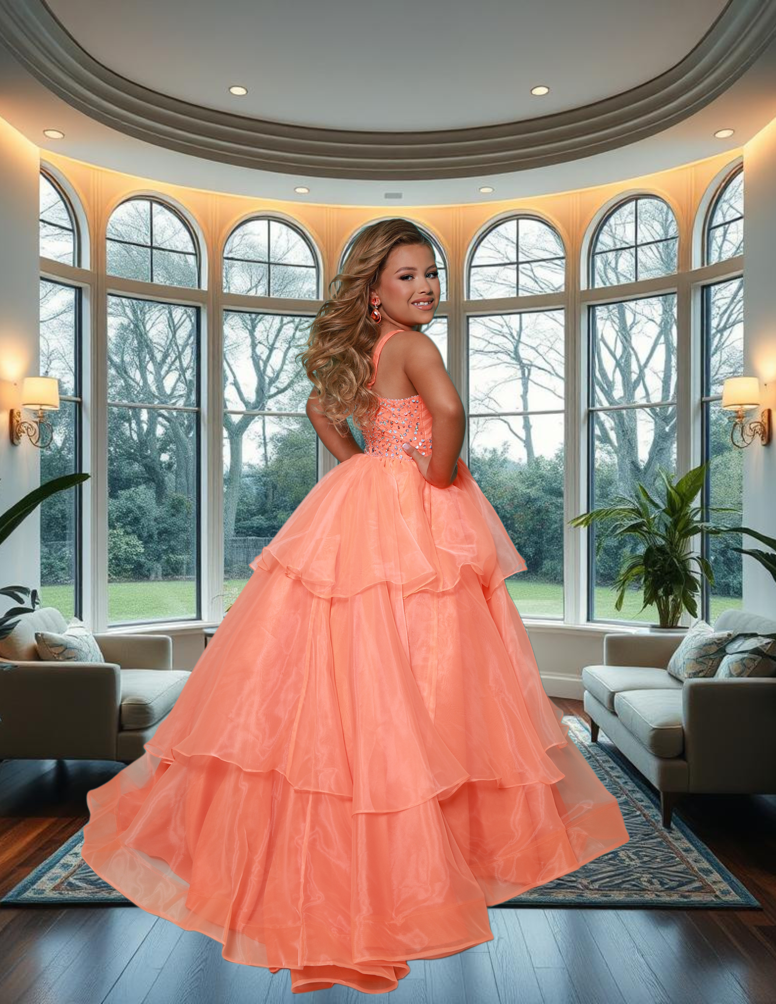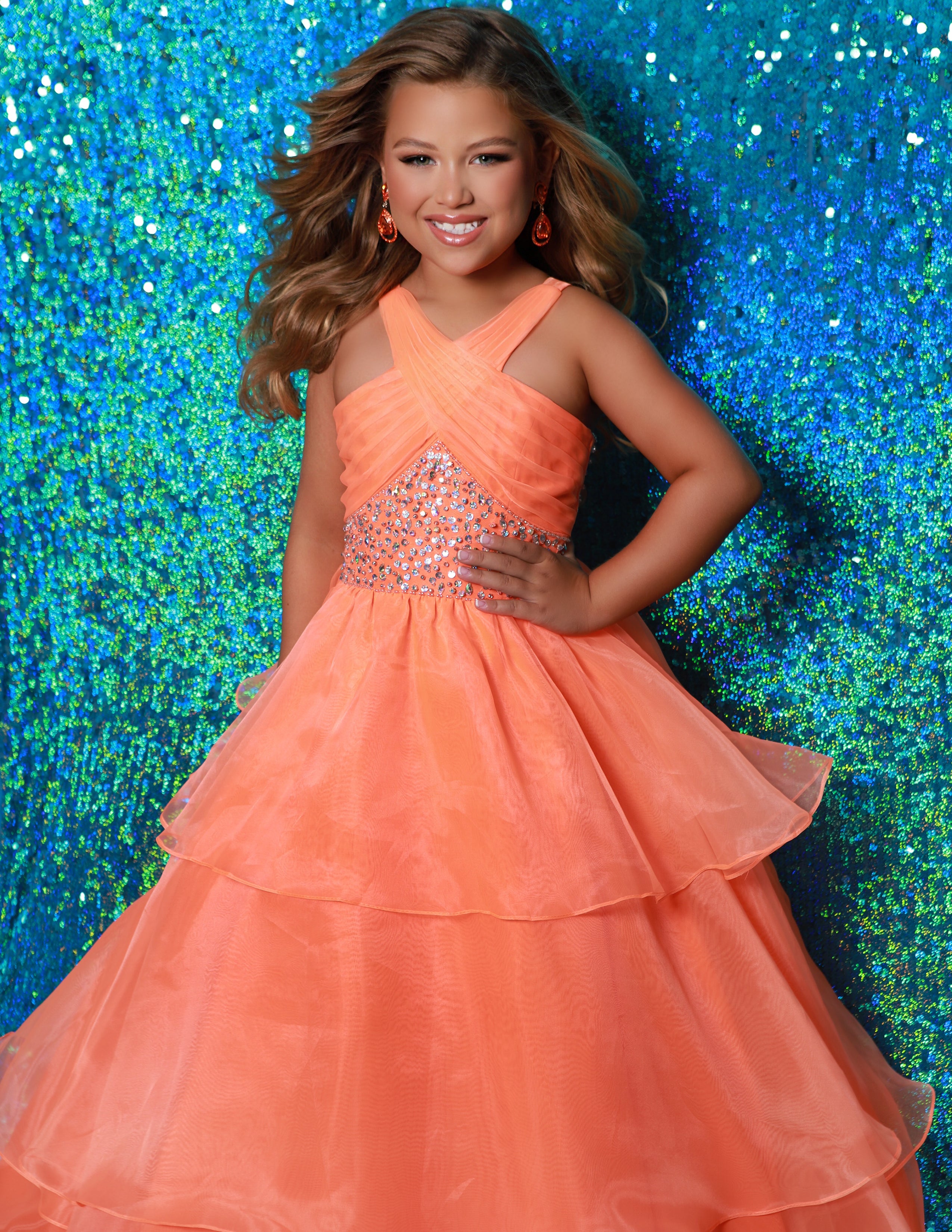 Designed to make a statement on the pageant stage, this stunning 2Cute by Kate Parker girls pageant gown blends youthful elegance with bold color and sparkle. Featuring a beautifully structured crisscross bodice adorned with shimmering crystal embellishments, this gown flows into a voluminous tiered organza skirt that creates breathtaking movement with every step. Available in vibrant orange and striking turquoise, this gown is perfect for little girls competing in pageants, attending formal events, walking in weddings, or shining at a father daughter dance. The layered skirt adds dramatic fullness while maintaining a lightweight, comfortable feel that allows confident movement throughout the event. Expertly designed for young pageant contestants, this gown delivers a polished, stage-ready look while still feeling playful, age-appropriate, and magical. A true showstopper for special occasions, portraits, and pageant competitions alike.