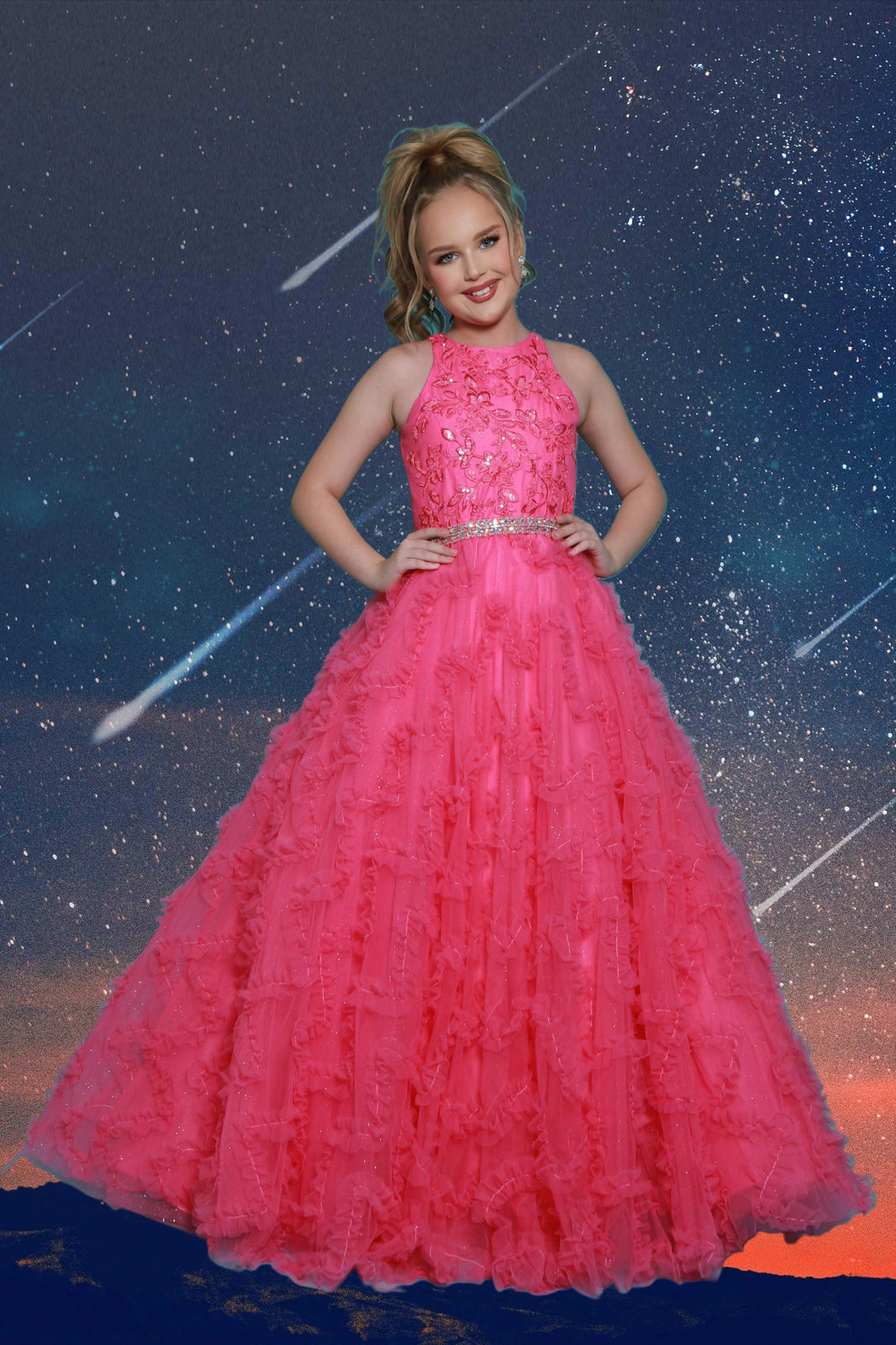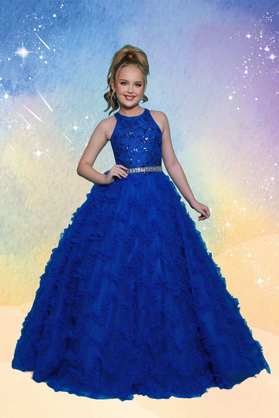 The Liora gown from the 2Cute Collection is designed to dazzle in either royal blue or vibrant fuchsia. Featuring a fully sequined bodice with a halter neckline and a rhinestone-embellished waistband, this glamorous gown flows into a dramatic ruffle-tiered skirt for maximum impact. Perfect for pageants, birthdays, or a magical father-daughter dance, the Liora gown brings confidence, elegance, and sparkle to every unforgettable moment.