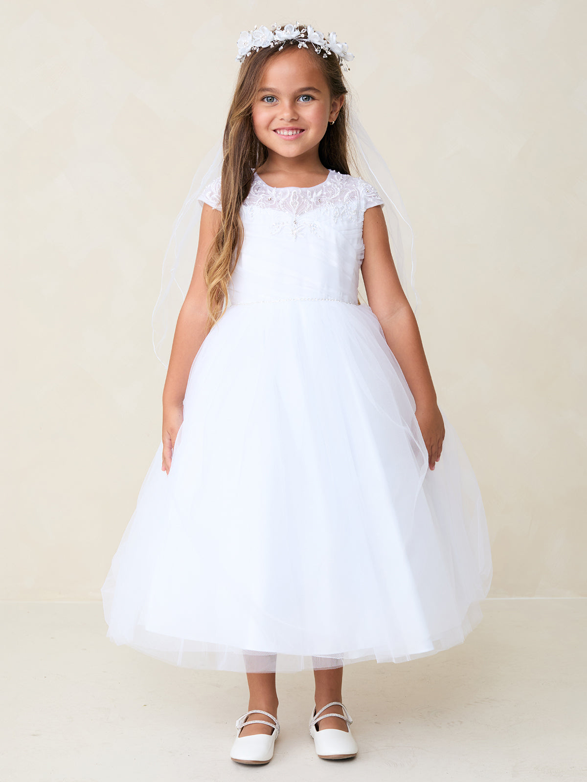 Elevate your child's special day with the Addison Special Occasion Communion Dress. This enchanting dress features a delicate lace bodice adorned with intricate beadwork and embroidery, creating a timeless and graceful look. The full tulle skirt adds volume and elegance, perfect for twirling moments. A satin bow at the back completes the design, adding charm and sophistication. Designed for comfort and beauty, this dress is ideal for first communions, flower girl duties, or any formal event where your little one deserves to shine.