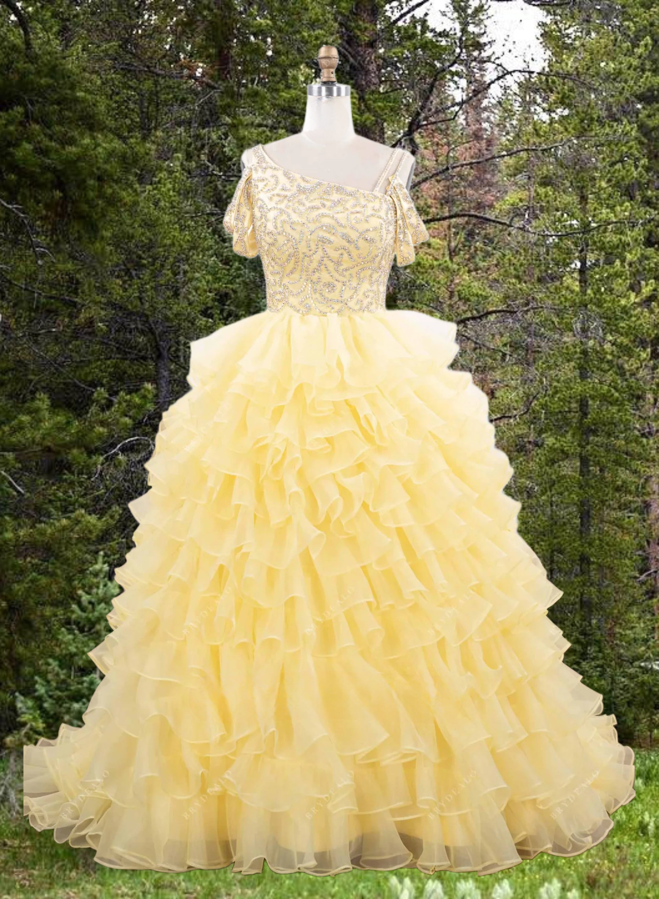 Make a bold entrance in the Adelina gown from Brydealo Couture, a radiant yellow pageant dress designed to captivate. Featuring an asymmetrical neckline with elegant off-shoulder straps, this gown dazzles with hand-sewn crystal embellishments on a structured bodice. The full skirt cascades in layers of soft organza ruffles, creating dramatic volume and graceful movement—perfect for stage, portraits, and special events. A fairytale-worthy design for girls who love to shine.