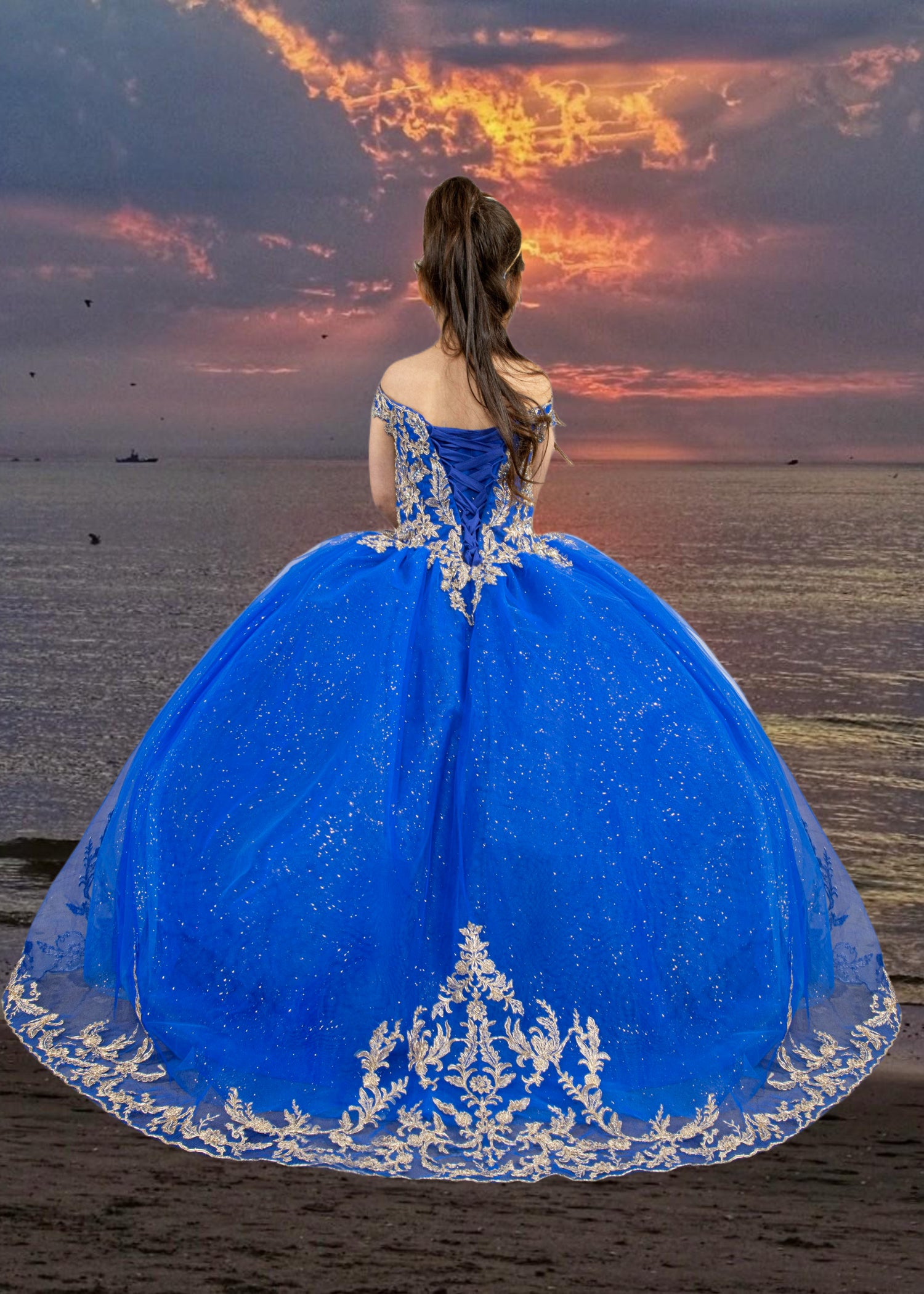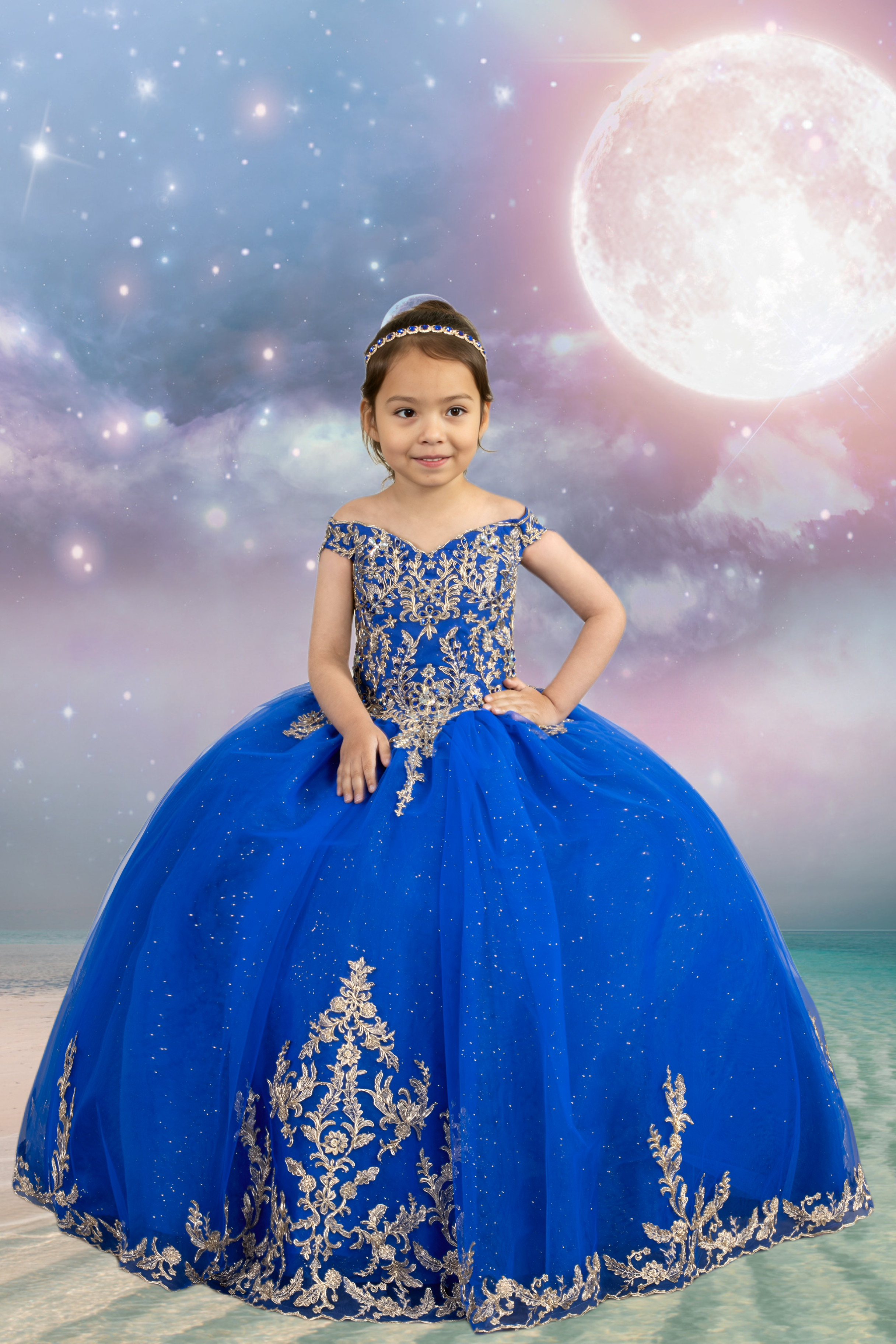 Let her shine like royalty in the Alessia gown, a breathtaking navy pageant dress adorned with intricate gold embroidery and sparkling glitter tulle. The elegant off-shoulder neckline and full ballgown skirt create a timeless silhouette, perfect for pageants, birthdays, portraits, and flower girl moments. Finished with a lace-up back for a flexible fit, this gown ensures every little girl feels like a queen.