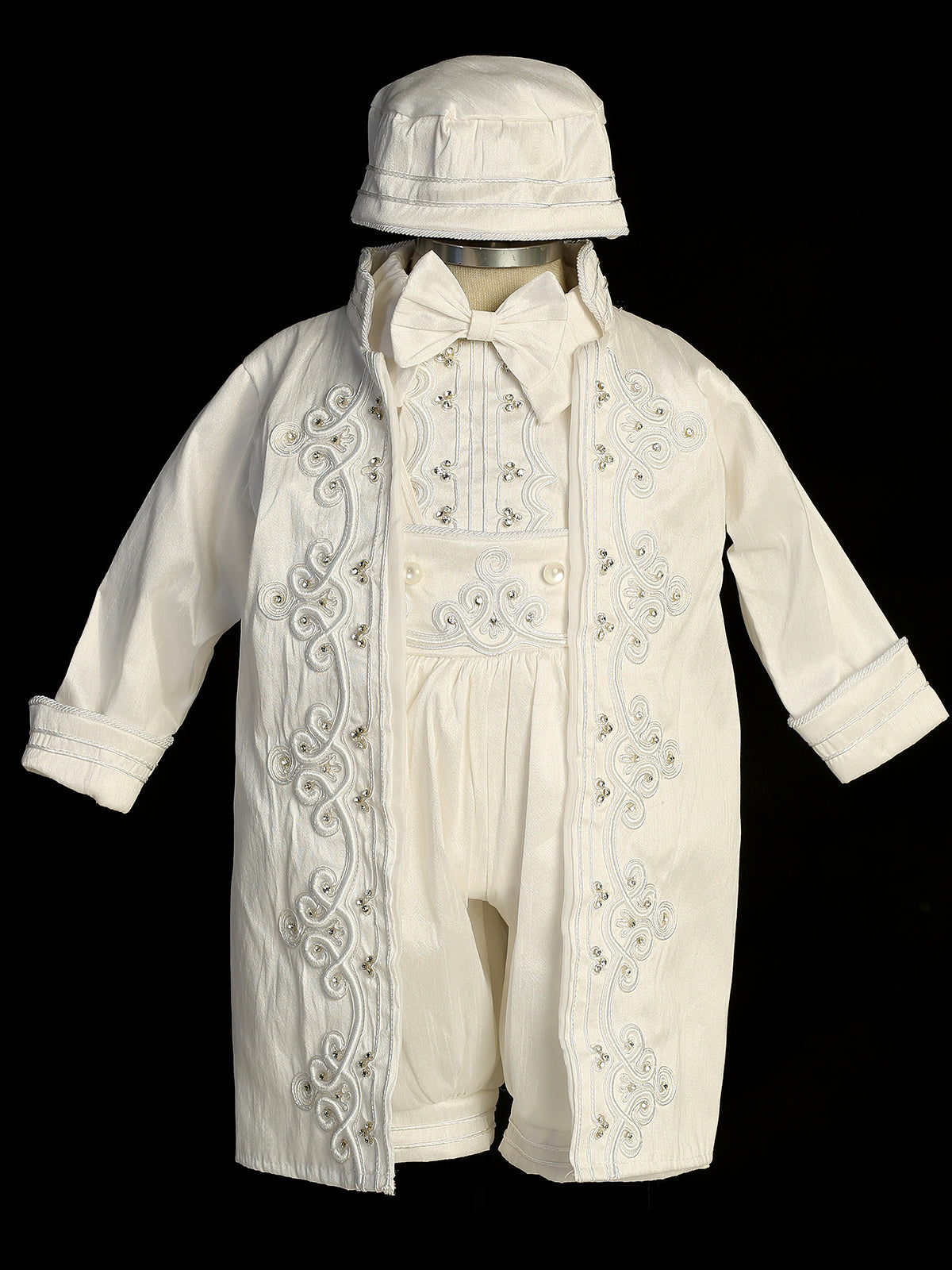 The Alessio Boys Silk Christening & Baptism Suit is a refined heirloom ensemble designed for sacred moments and timeless celebrations. Crafted from luxurious silk fabric, this elegant set features a tailored silk shirt with delicate embroidery, softly gathered silk shorts, and a coordinating long silk jacket adorned with intricate scroll detailing. A classic silk bow tie and matching cap complete the look with understated sophistication. Silk’s natural breathability and smooth texture ensure comfort throughout baptism and christening ceremonies, while the refined construction offers a polished appearance perfect for formal religious events, dedications, and after-christening gatherings. The Alessio suit photographs beautifully and delivers a traditional yet elevated aesthetic that parents seek when choosing a boys baptism outfit meant to be cherished. An ideal choice for families searching for a silk christening suit that blends tradition, craftsmanship, and timeless elegance.