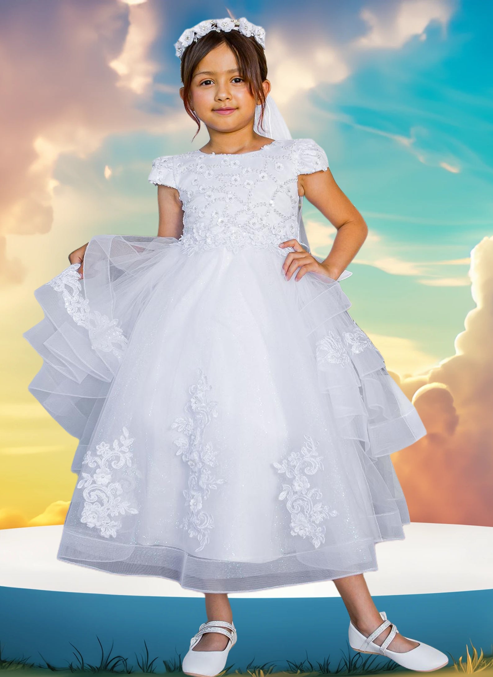 Graceful and full of charm, the Aliana Pearl Dress features a stunning layered hi-lo skirt, delicate cap sleeves, and intricate floral embroidery adorned with pearls and sequins. The shimmering tulle overlay adds just the right amount of sparkle, while the satin bow at the back completes the look with elegance. A perfect choice for first communion, flower girl moments, or any special occasion that calls for something unforgettable.