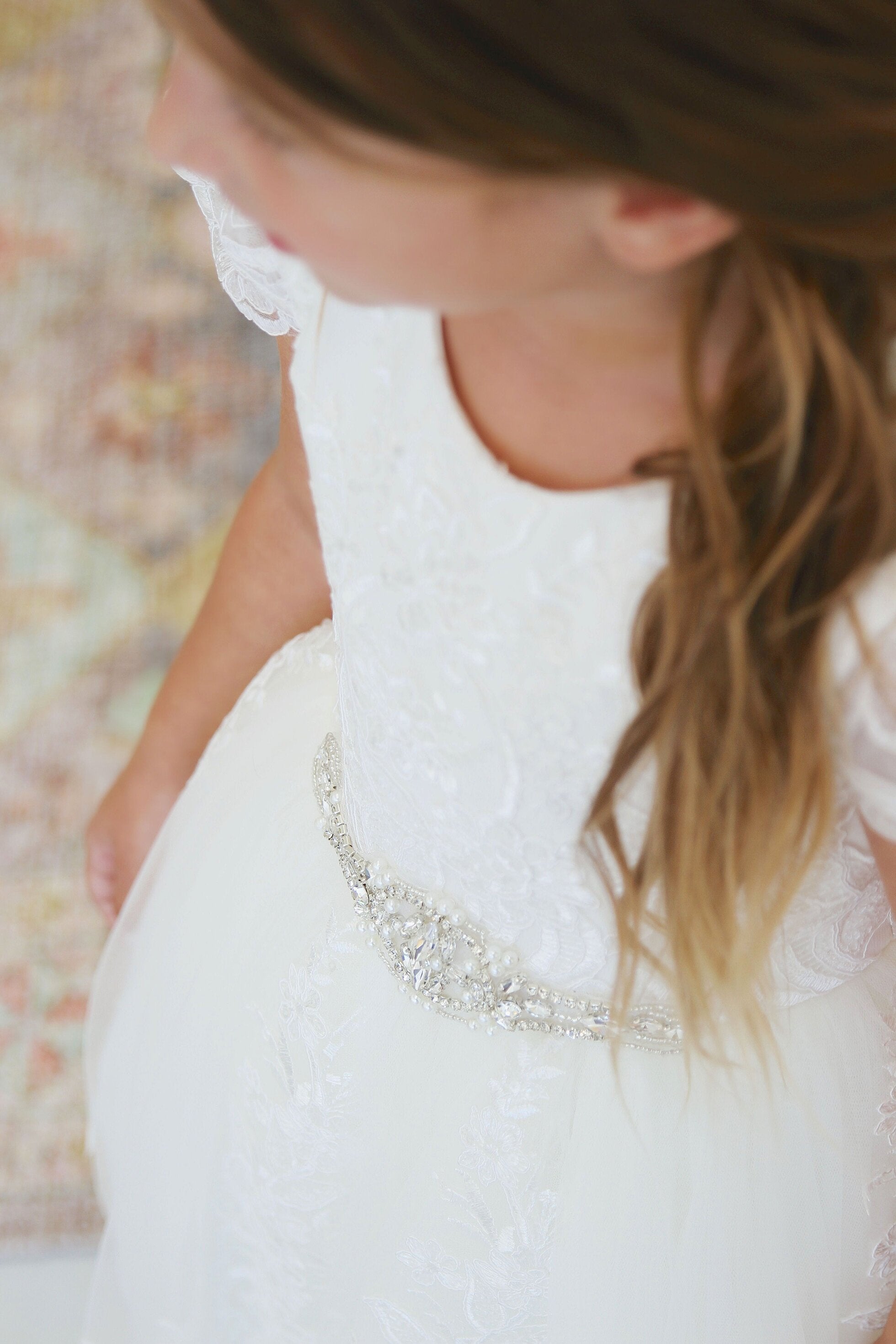 At the waist, a stunning crystal belt cinches in, accentuating the silhouette and providing a focal point that draws the eye. The skirt cascades to the floor in a gentle sweep, with lace trim at the hem adding a final, exquisite detail. This dress is not just an outfit; it's a statement piece that ensures any young lady wearing it will feel like the belle of the ball.