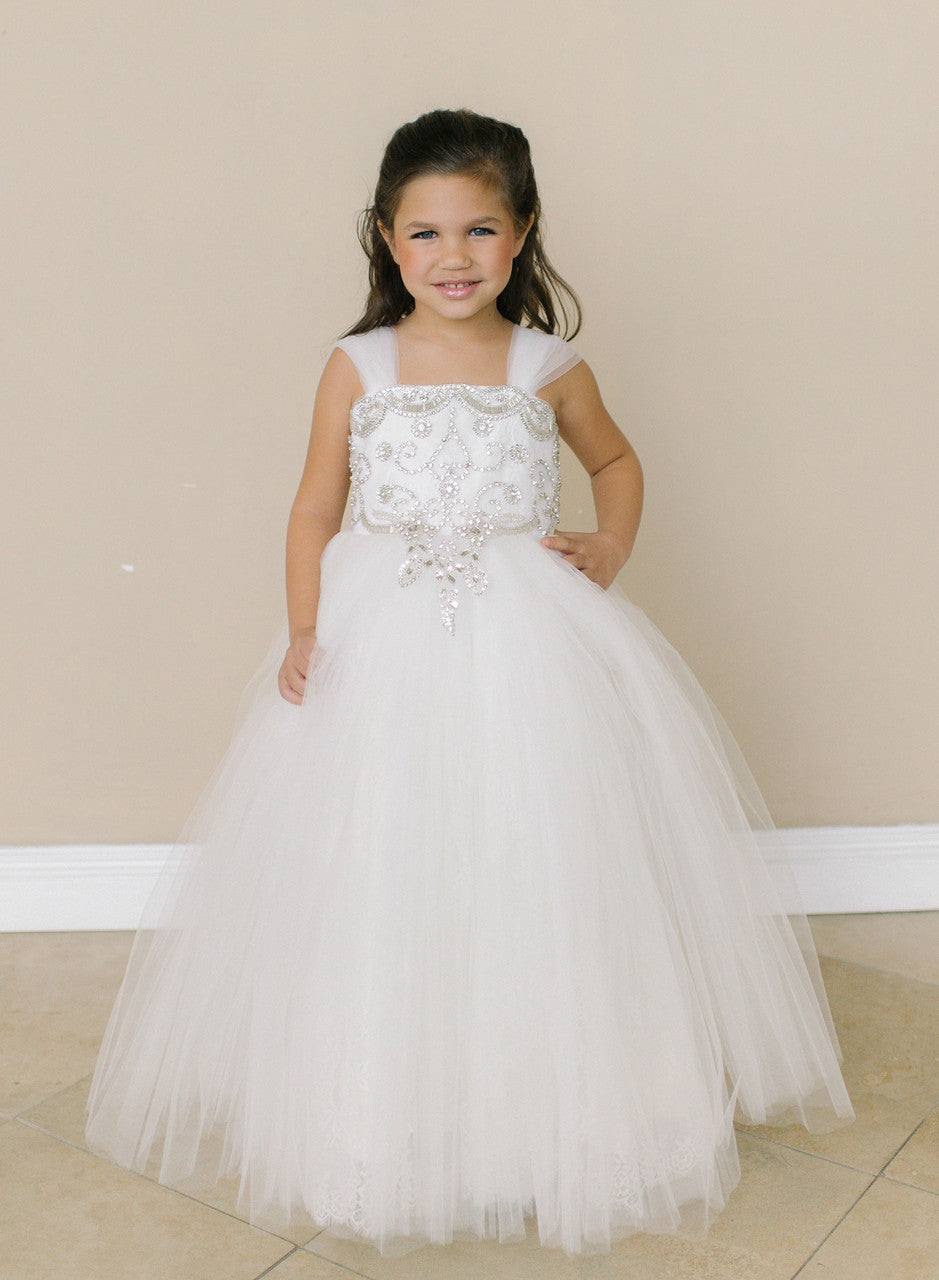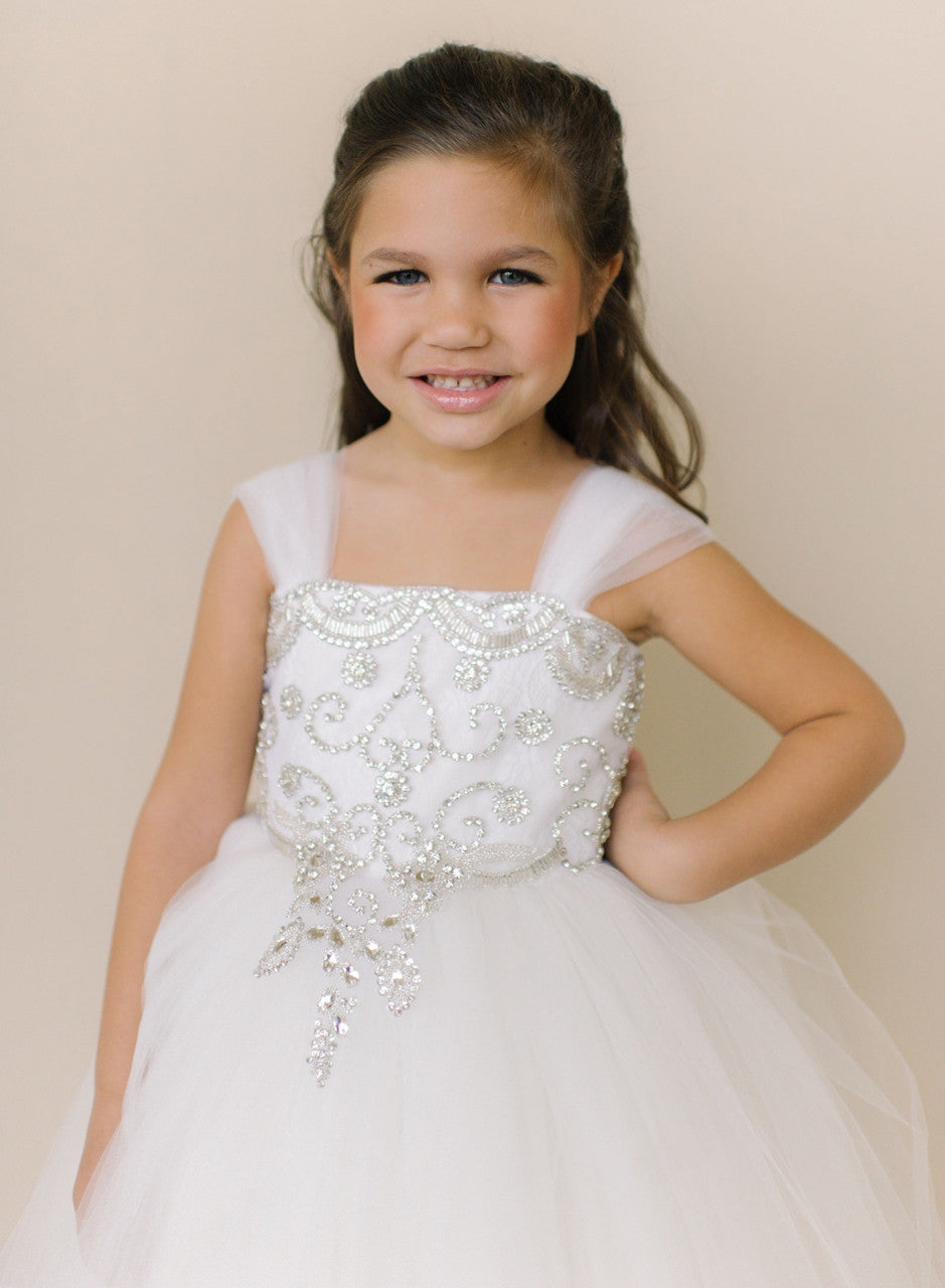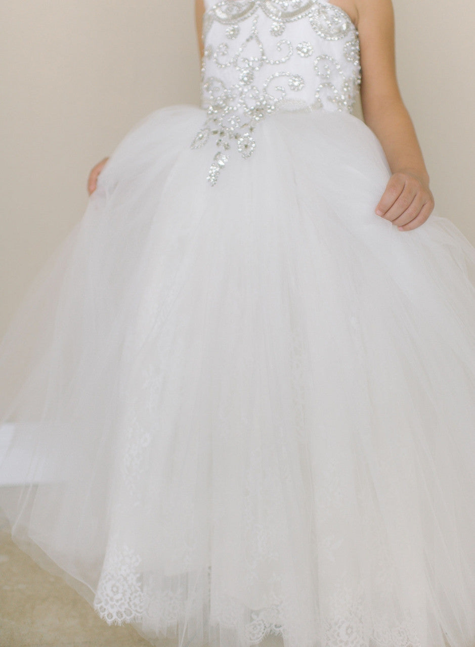 The Piper Flower Girl Dress by Amalee Couture is a dreamy confection, ideal for accentuating the magic of any special occasion. The bodice is a masterpiece of design, embellished with crystals that catch the light and sparkle magnificently, making every little flower girl feel like a fairy tale princess. The tulle sleeves are whisper-soft, adding an ethereal quality to the dress. Beneath the voluminous floor-length tulle skirt, a hint of lace peeks through, offering a delicate contrast that is both charming and sophisticated.