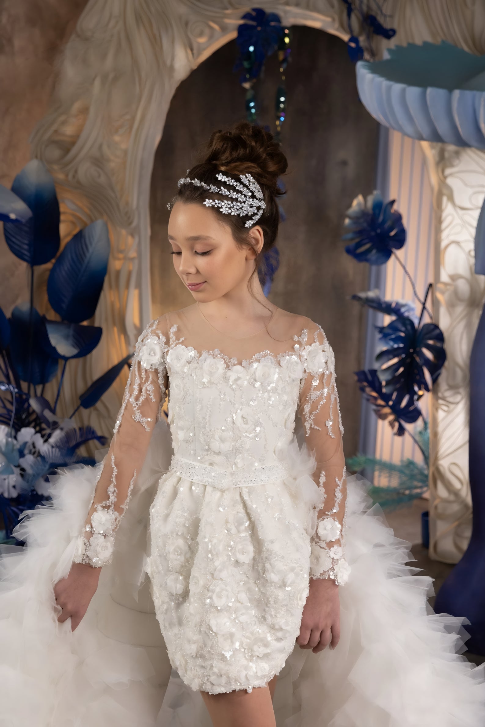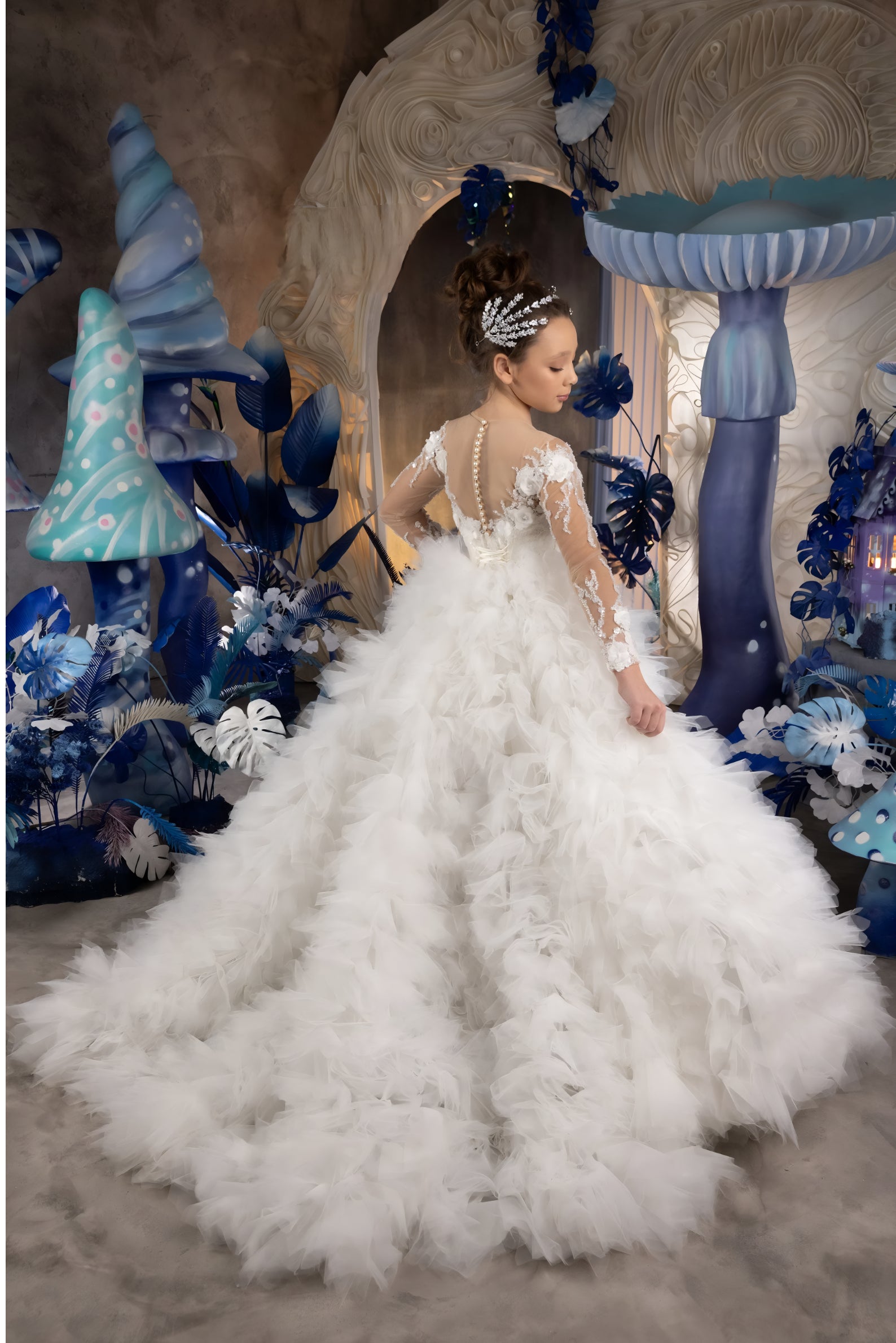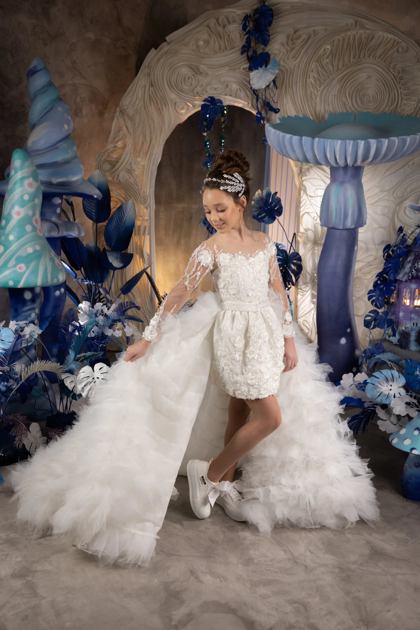 The Amalfi Couture Gown redefines elegance with a modern twist. Featuring a breathtaking detachable feathered train and a lace-embellished mini dress, this gown is a harmonious blend of glamour and sophistication. Its illusion neckline, sheer lace sleeves, and pearl-buttoned back exude timeless charm, making it perfect for red carpet events, pageants, flower girl roles, or any special occasion. Fully customizable for the perfect fit, the Amalfi Gown promises unforgettable moments of style and grace.