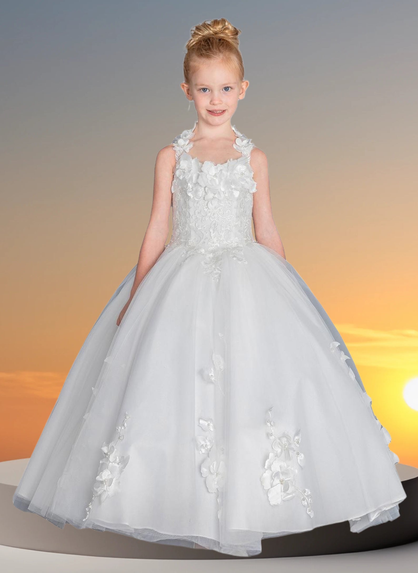 The Amara Bloom Gown is a vision of timeless charm, designed to make her feel like a true princess on her special day. This off-white dress features dimensional floral appliqué blooming along the bodice and full tulle skirt, creating a soft, garden-inspired silhouette. Delicate lacework trails down into the voluminous layers, while floral shoulder accents add a couture finish. A lace-up back ensures an adjustable, flattering fit. Whether for her first communion, pageant, or an unforgettable special occasion, this gown blends sophistication and whimsy effortlessly.