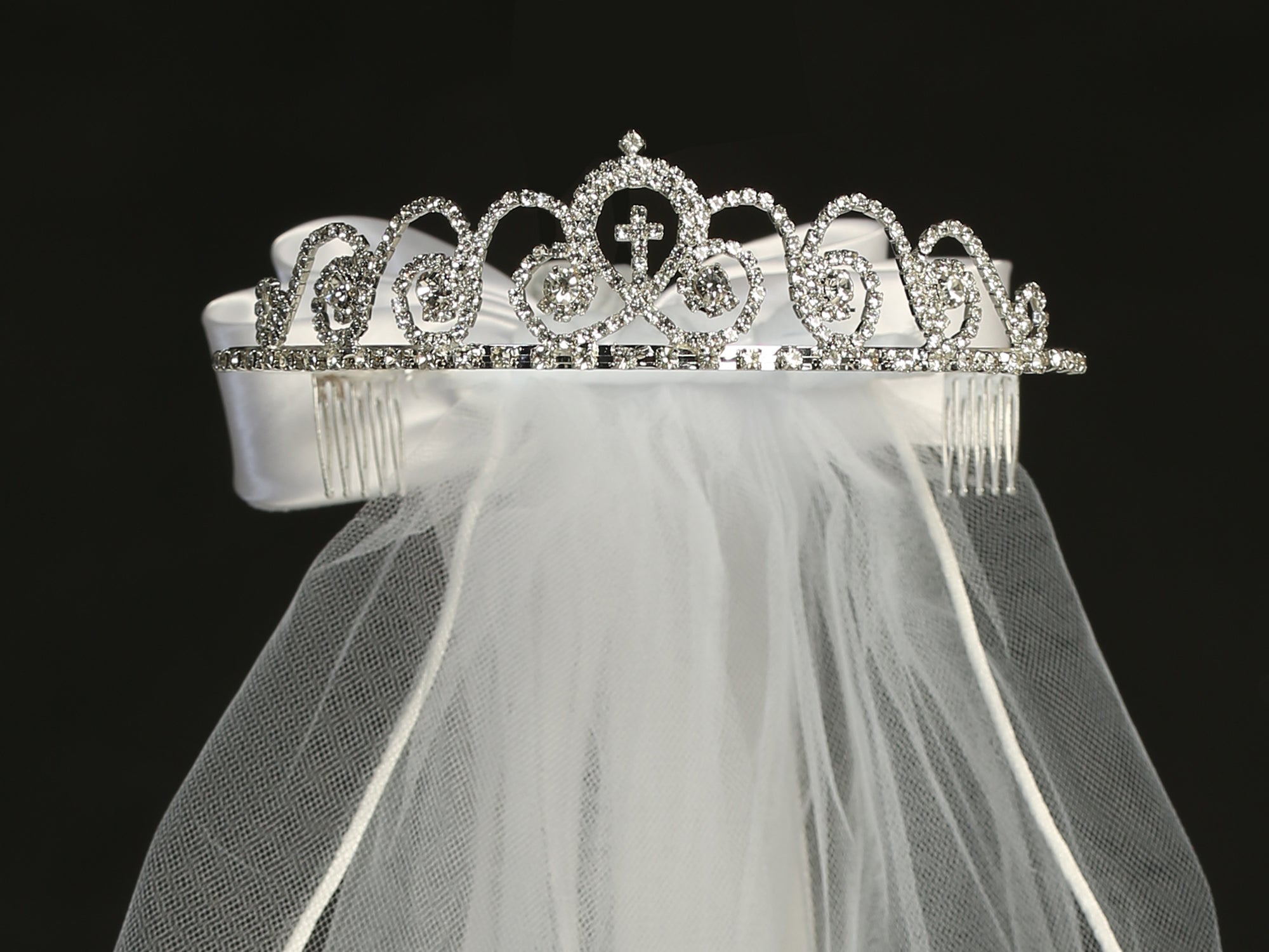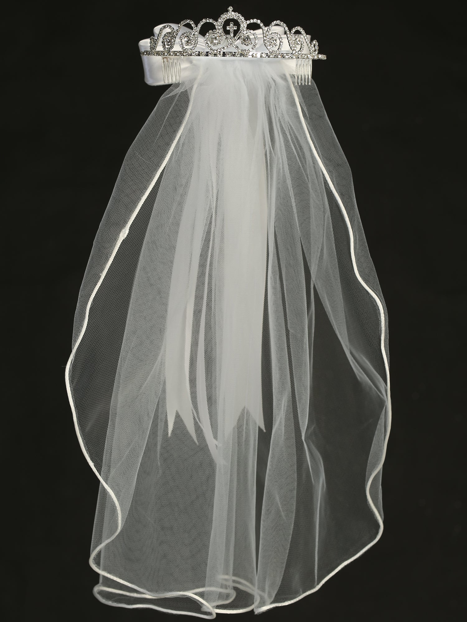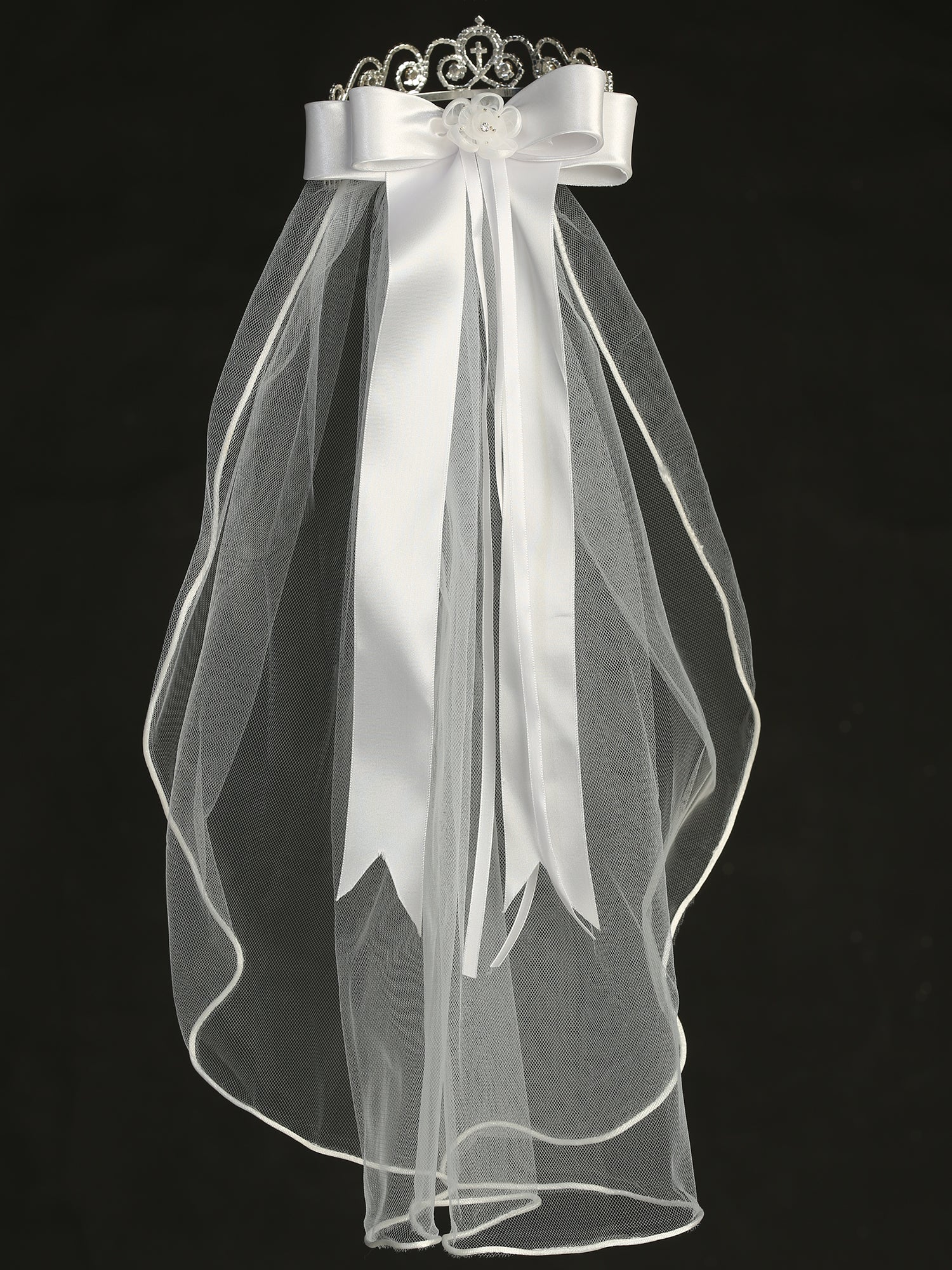 Elevate your little girl's First Communion look with the Amelia Kids Rhinestone Tiara and 18" Single Layer Veil. Featuring a dazzling rhinestone tiara that exudes elegance, this veil is perfectly draped for a graceful finish. Crafted for young girls, it offers a secure fit with an attached comb and ribbon accents. This timeless accessory is ideal for First Communion or other special occasions, adding a sparkling charm to any outfit.