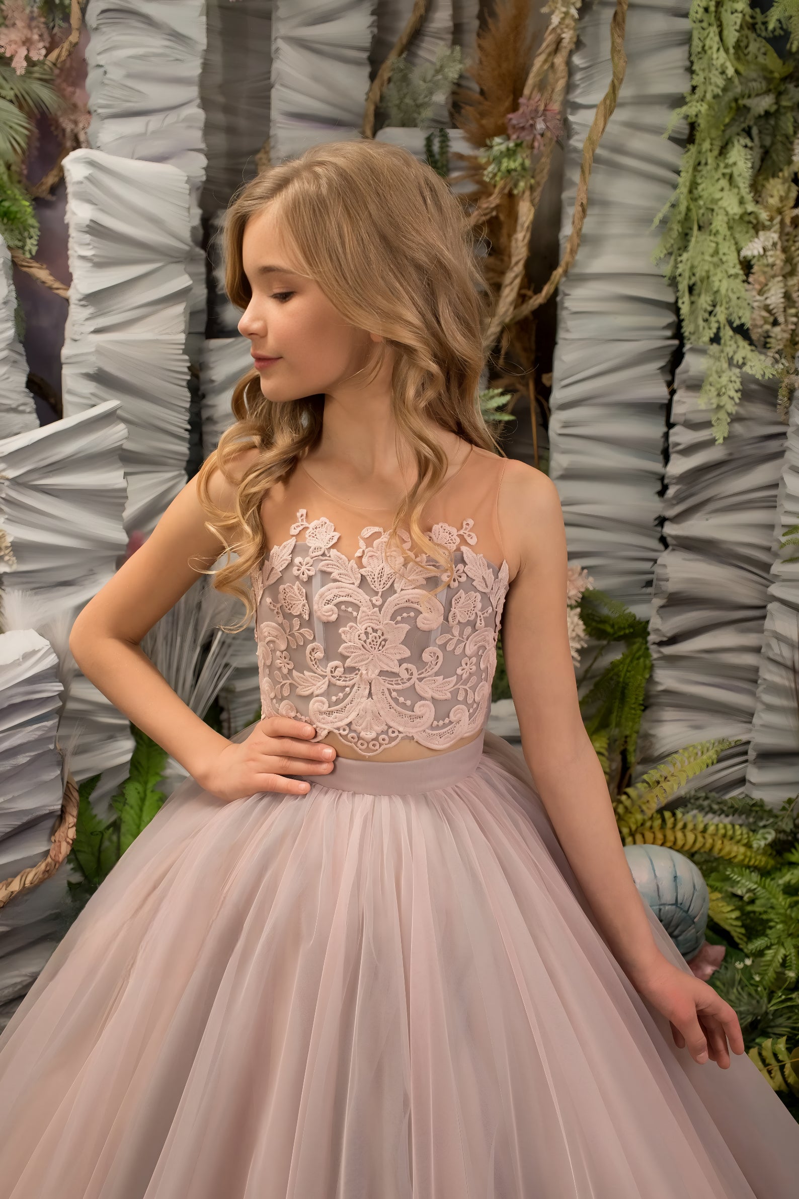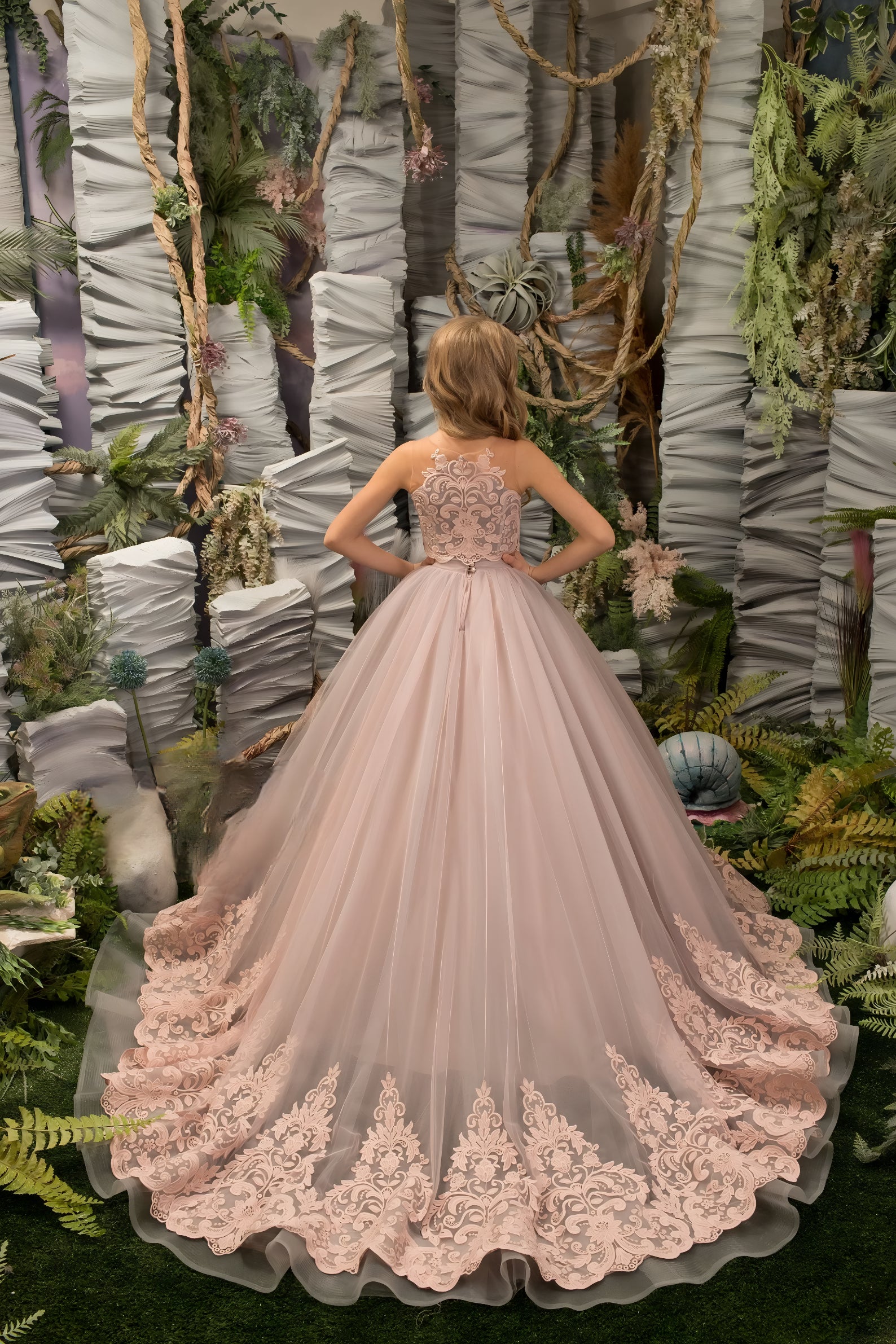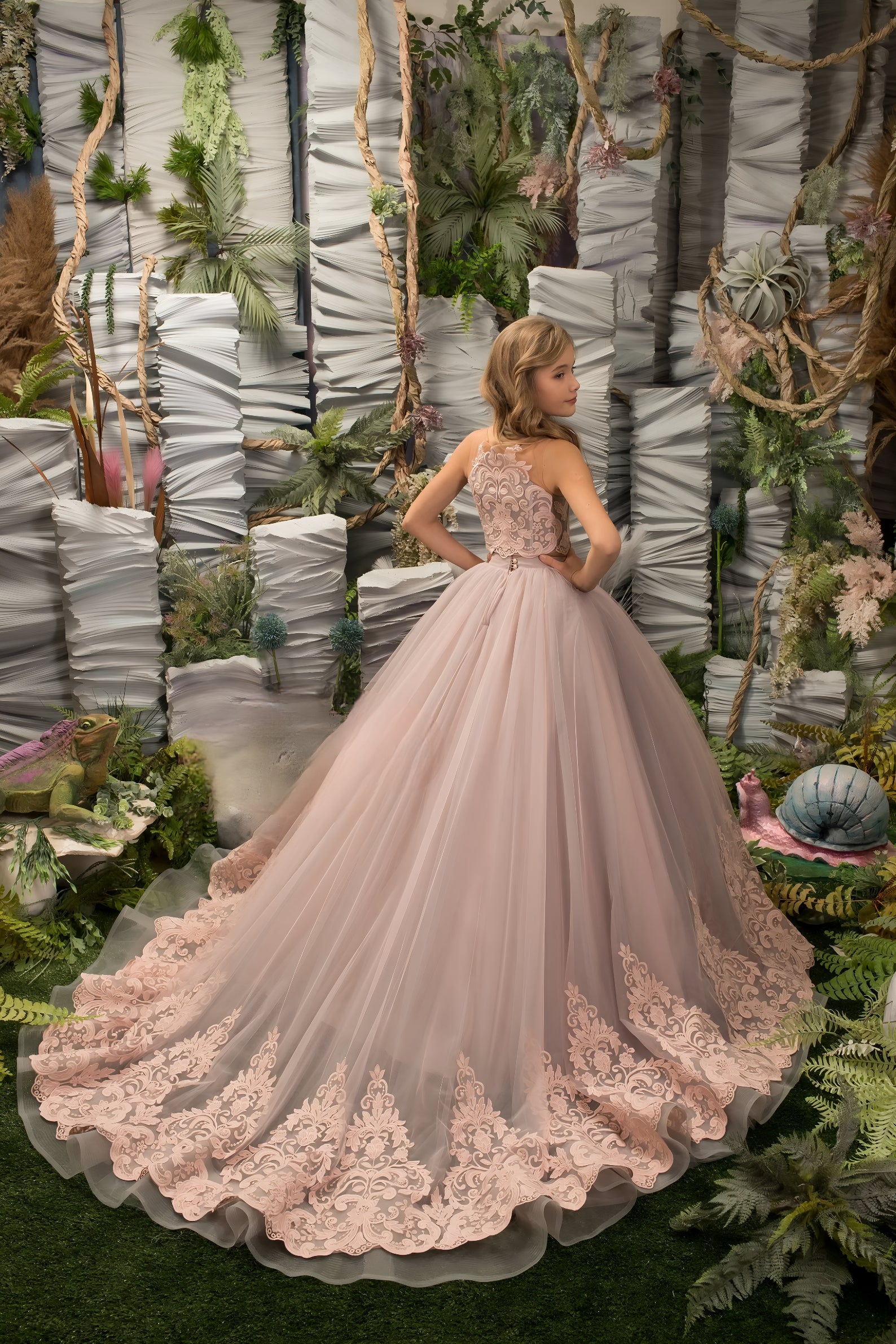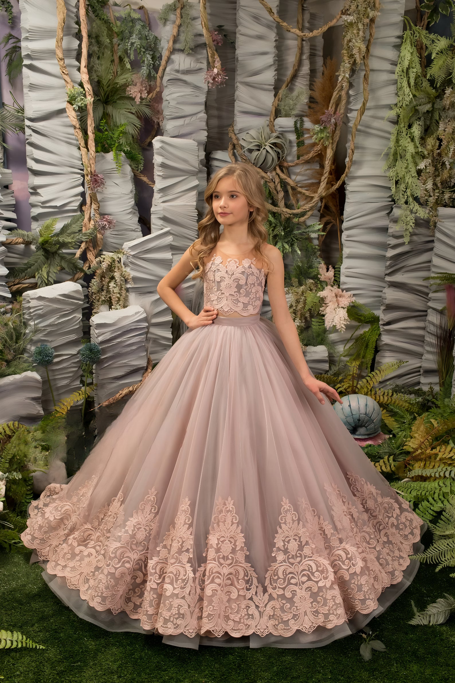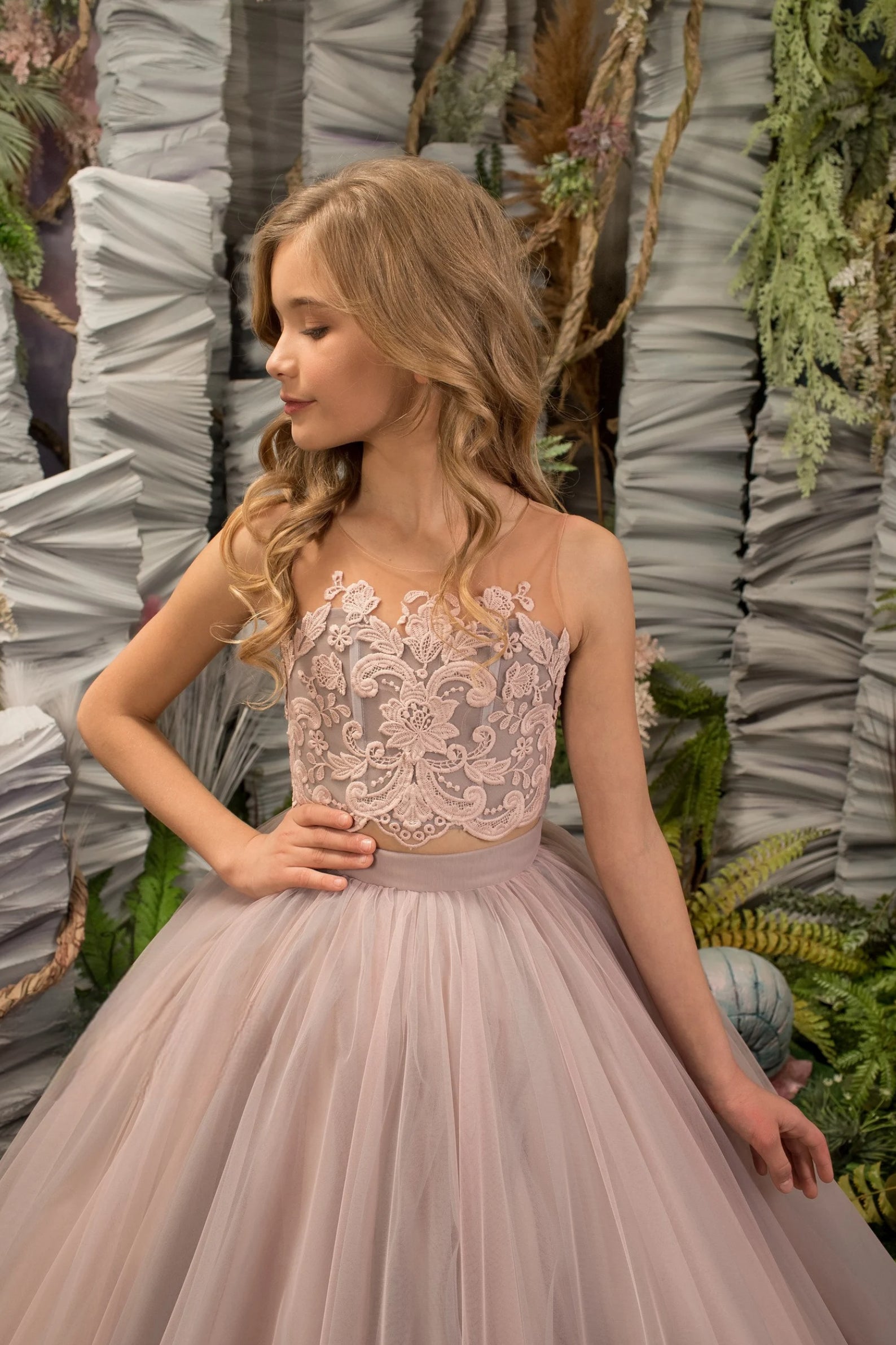Indulge in the breathtaking elegance of the Amélie Royale Gown, a masterpiece of refined beauty. This luxurious couture dress features a flowing tulle skirt adorned with intricate lace appliqués that cascade gracefully along the hemline. The delicately embroidered illusion bodice adds a regal touch, making this gown perfect for communions, flower girl moments, or any unforgettable special occasion. Designed for those who appreciate timeless elegance, this dress offers a flawless blend of grace and grandeur.