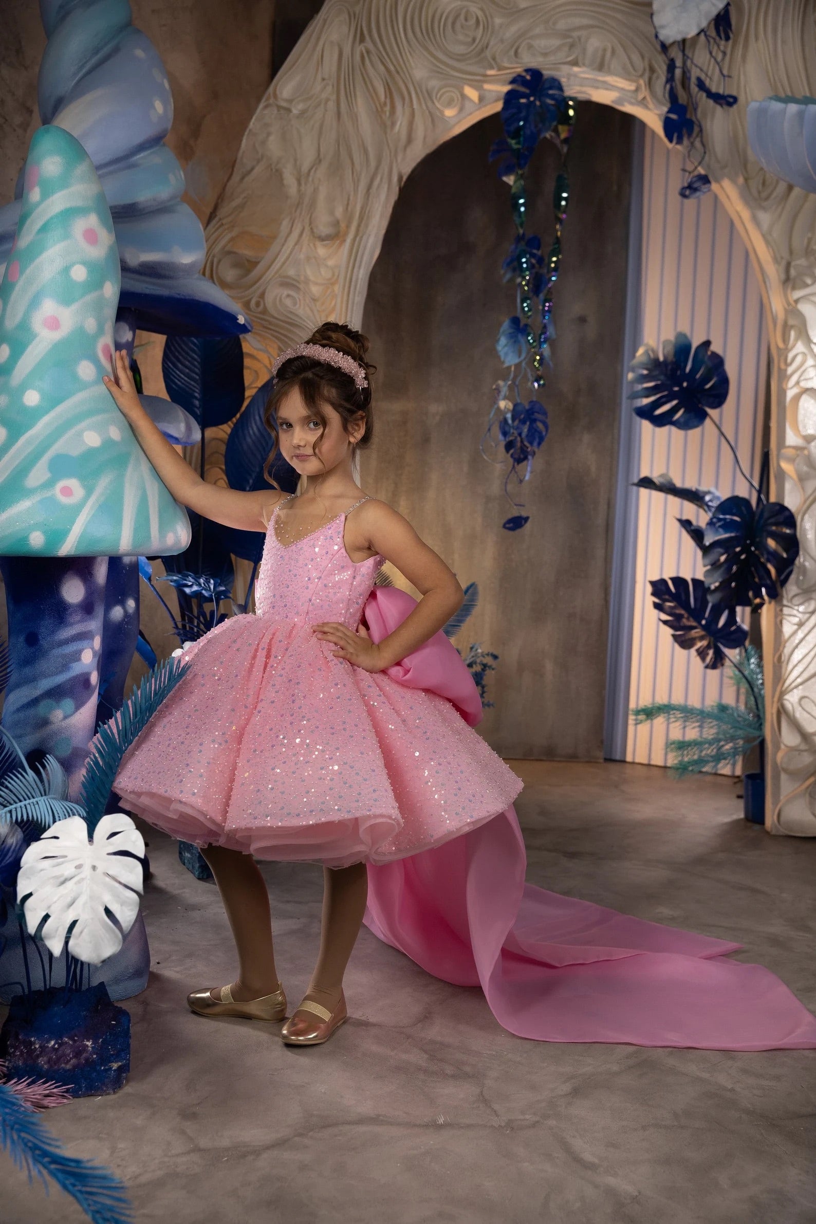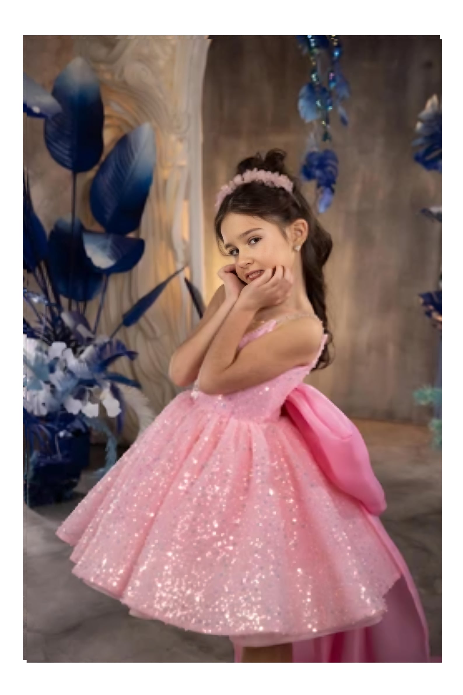 The Angelica Couture Dress is a dazzling masterpiece that combines elegance and playful charm, perfect for making unforgettable memories. This radiant pink gown features sparkling sequins, voluminous puff sleeves, and a dramatic detachable train that flows with grace. Whether for pageants, flower girl duties, portraits, or other special occasions, the Angelica Dress ensures your child feels like royalty. Customizable for a perfect fit, this dress is where sophistication meets whimsical delight, captivating parents and enchanting kids alike.