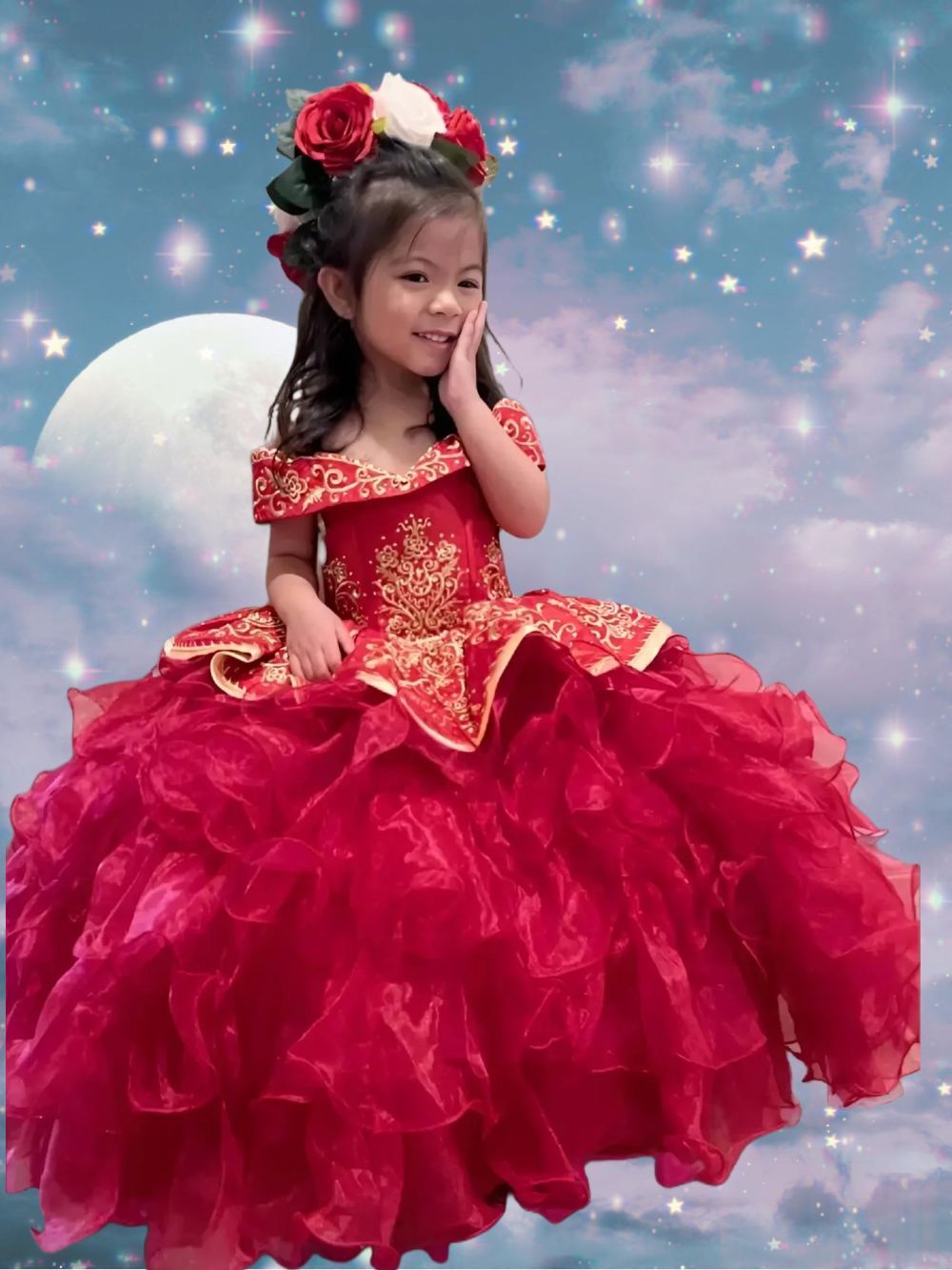 Introducing the Annalisa Girls Off the Shoulder Floor Length Pageant Dress - the perfect gown for the belle of the ball! This stunning dress features an off the shoulder bodice with delicate embroidered straps for a touch of elegance. The open lace-up back adds a modern twist, while the zipper closure ensures a secure fit. Your little princess will feel like royalty in the floor length A-line skirt, complete with tiered ruffles that add a touch of whimsy and flair.