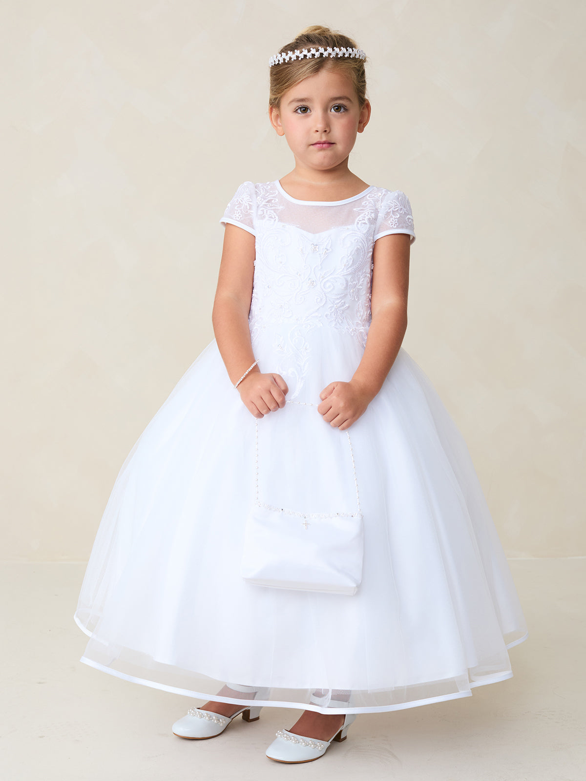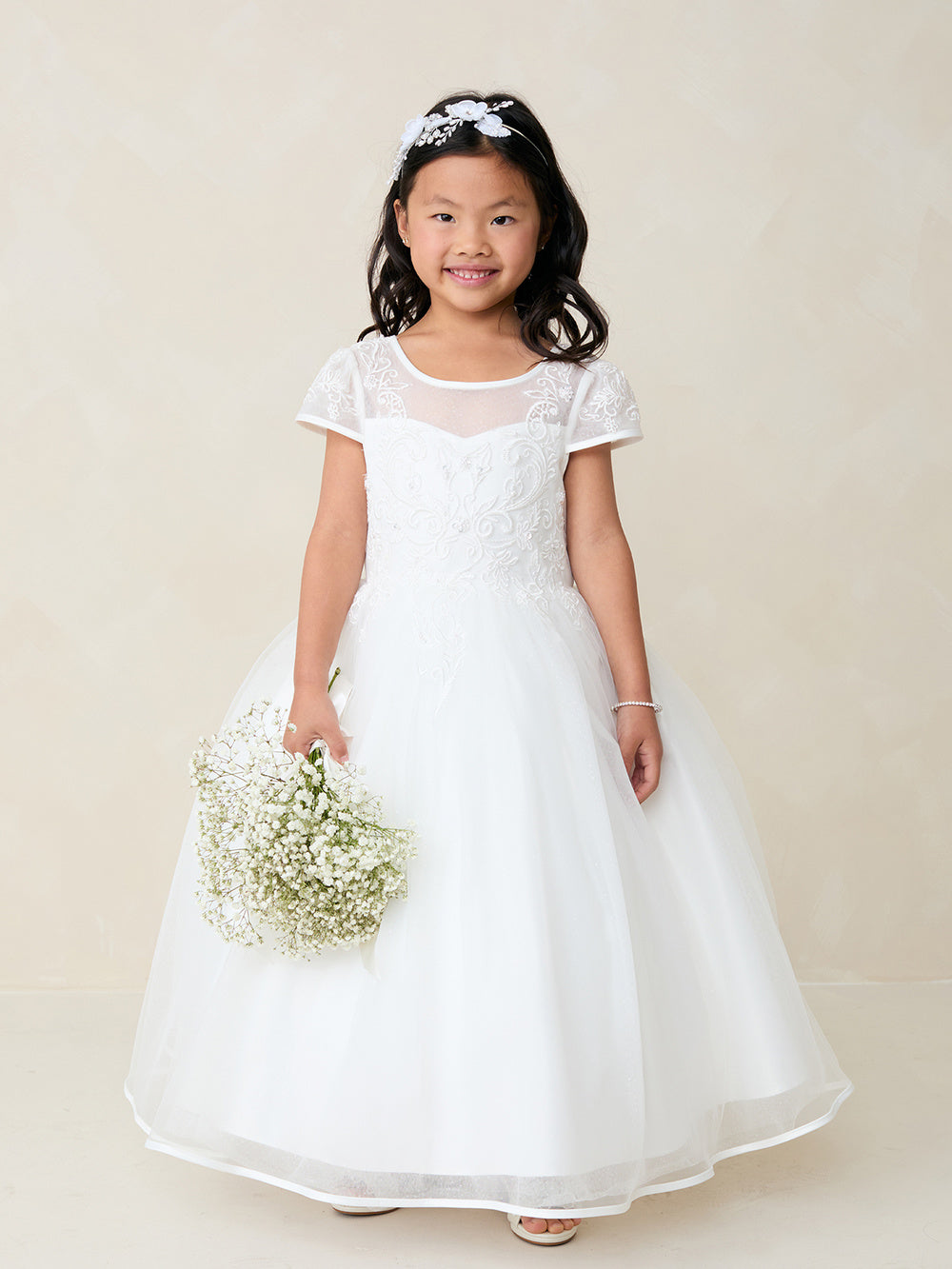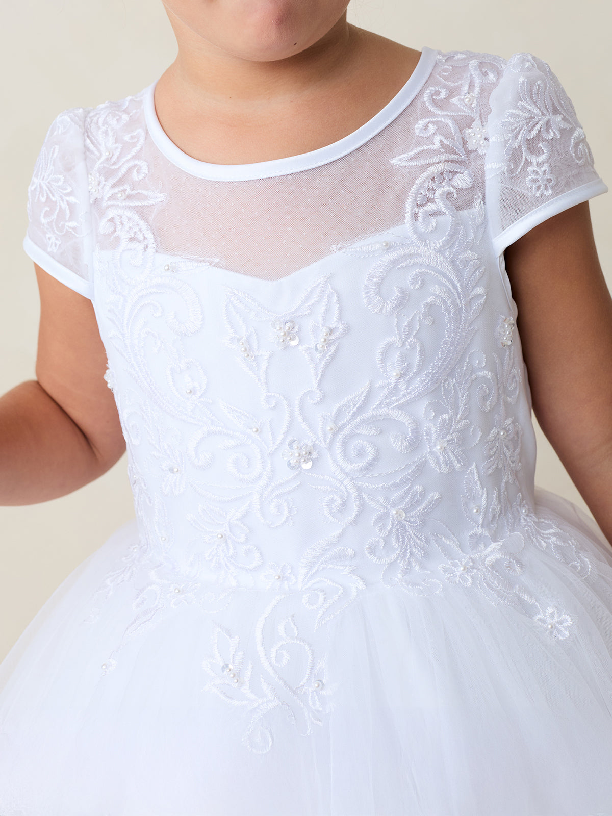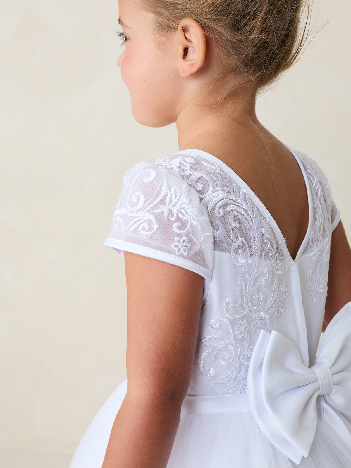 The Annalise Pearl Lace Dress is a captivating blend of elegance and charm, perfect for your little one’s most treasured events. Featuring a sheer lace bodice with intricate embroidery and delicate pearl accents, this dress is a timeless masterpiece. The soft tulle skirt flows gracefully, while a charming bow at the back adds a finishing touch of sophistication. Ideal for first communions, flower girl roles, or other memorable celebrations, the Annalise Dress ensures she shines with poise and grace. A perfect balance of style and comfort, this gown is designed to create unforgettable moments.