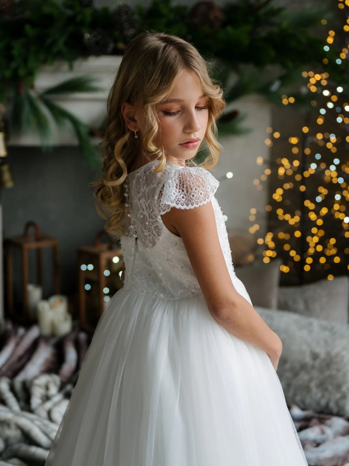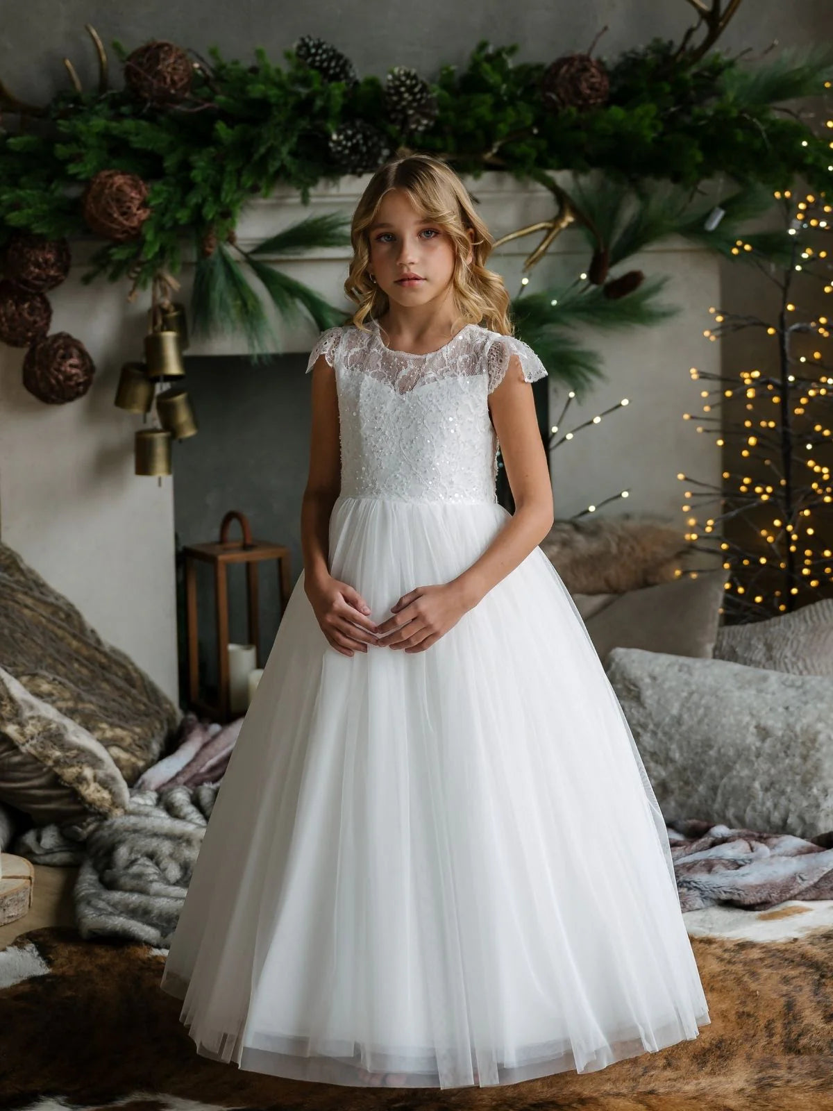 The Annalise Teter Warm Gown blends timeless elegance with delicate detailing, making it a perfect choice for first communion, flower girl moments, or other cherished celebrations. Featuring soft flutter lace sleeves, a sheer illusion neckline, and a beautifully beaded bodice with subtle floral embroidery, this full-length tulle gown flows into a voluminous skirt that captures grace in every step. The back showcases a classic V-cut with dainty button accents and a sash tie for a charming finish.