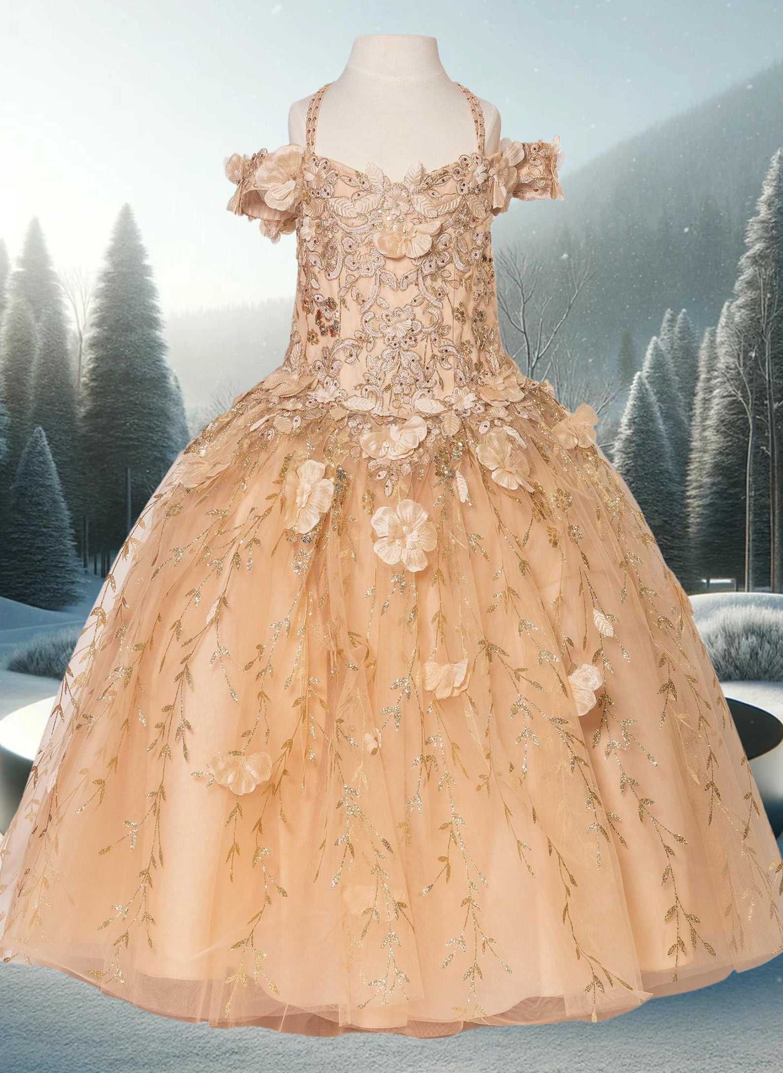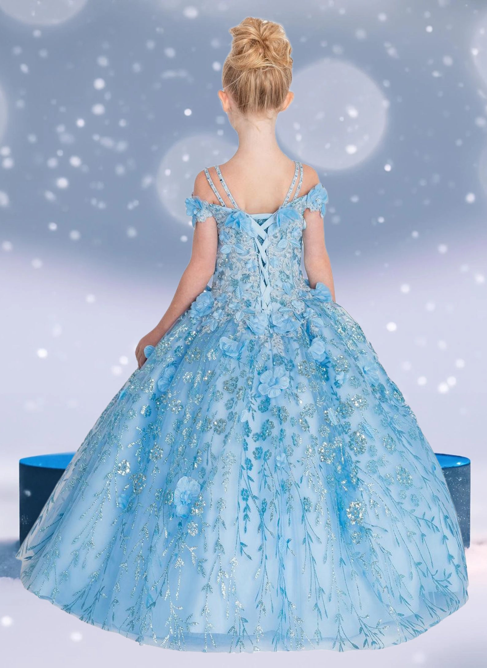 Let her enchant the room in the Arabella Gown, a breathtaking Bahama Blue creation designed for pageants, communion, and magical occasions. This dreamy gown features dazzling sequin florals cascading across the full skirt, delicate 3D appliqué on the bodice, and whimsical double shoulder straps with off-the-shoulder blooms. A lace-up back ensures a custom fit and comfort. Available in Bahama Blue, Champagne, and Sage, this gown is made for little girls who love to shine.
