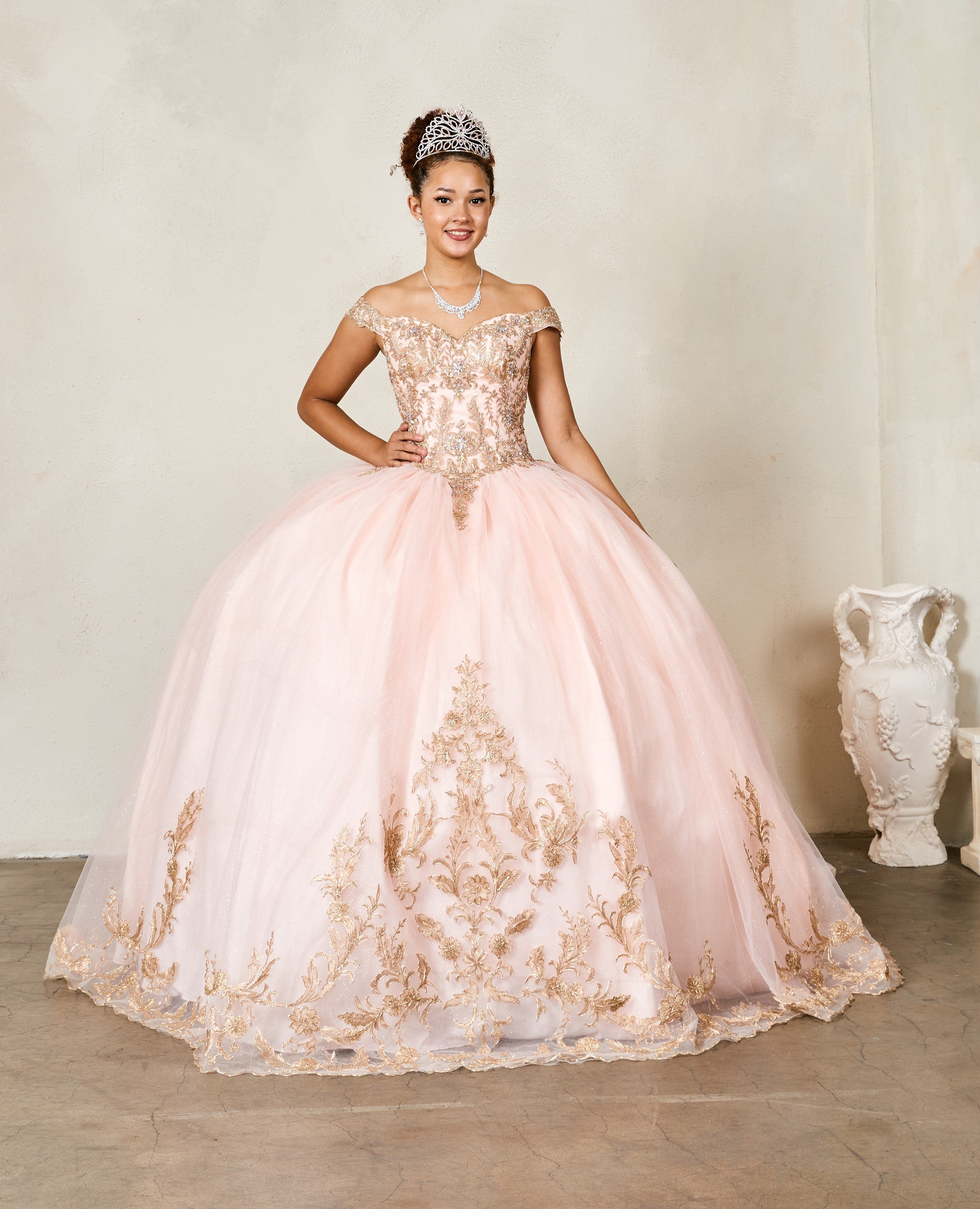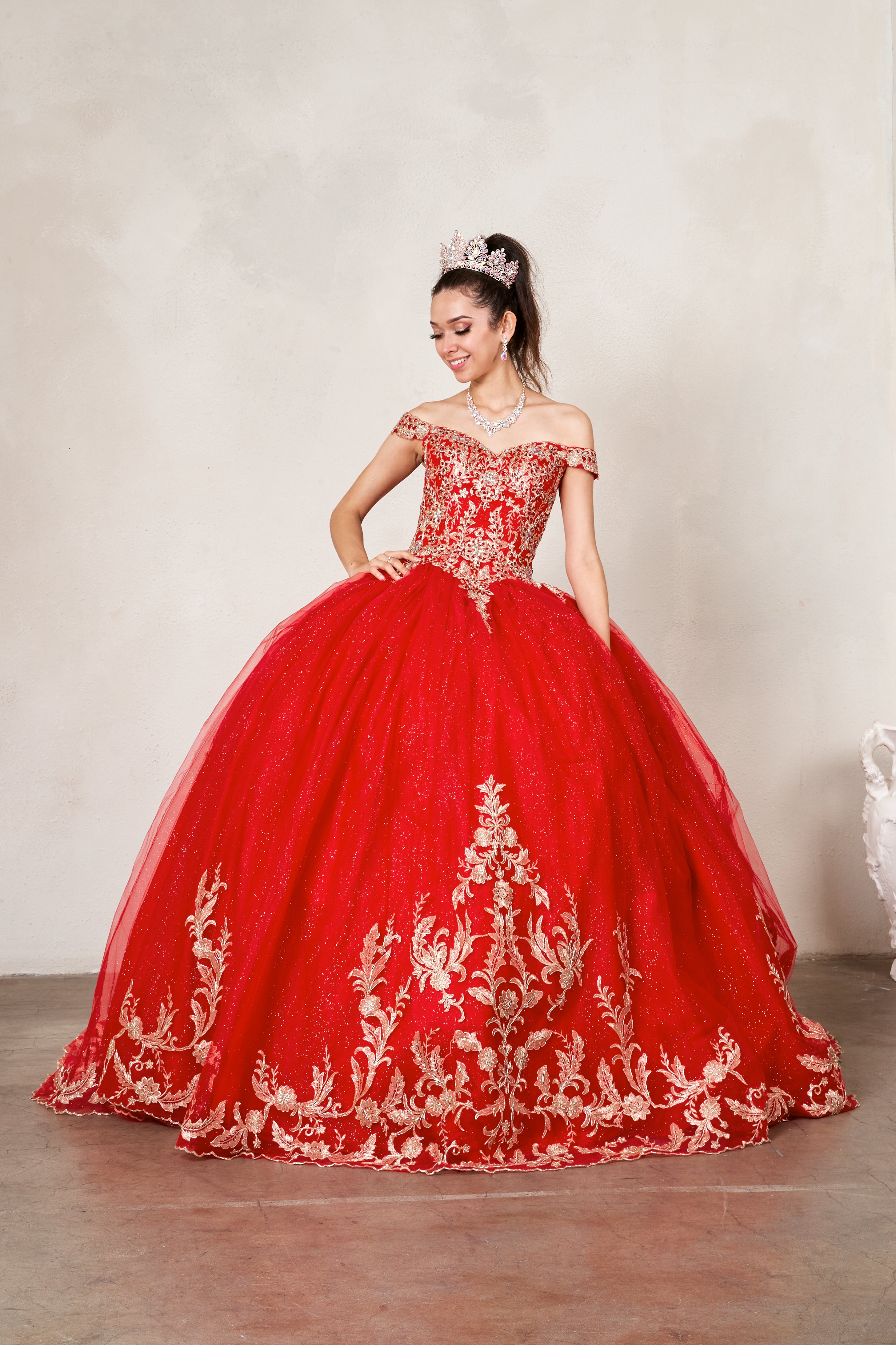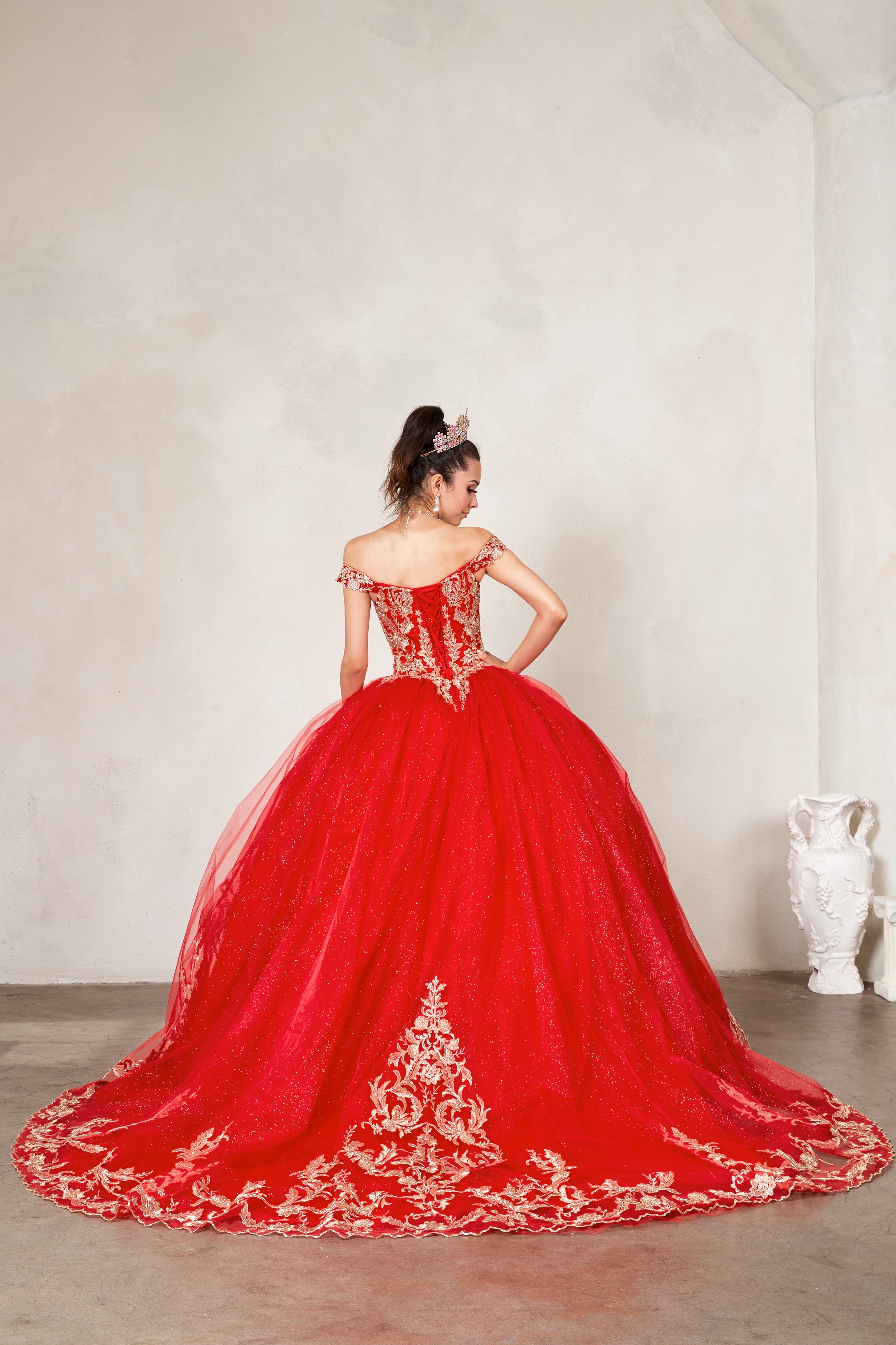 Fit for a queen, the Arabella Royale Gown is a masterpiece of regal elegance. This off-shoulder ball gown features a structured corset bodice adorned with exquisite gold embroidery and glittering details that cascade throughout the voluminous tulle skirt. The dramatic train and ornate detailing make this gown a standout choice for any quinceañera celebration. Available in striking colors including black, red, blush, and navy, this gown is designed to leave a lasting impression from the first grand entrance to the final dance.