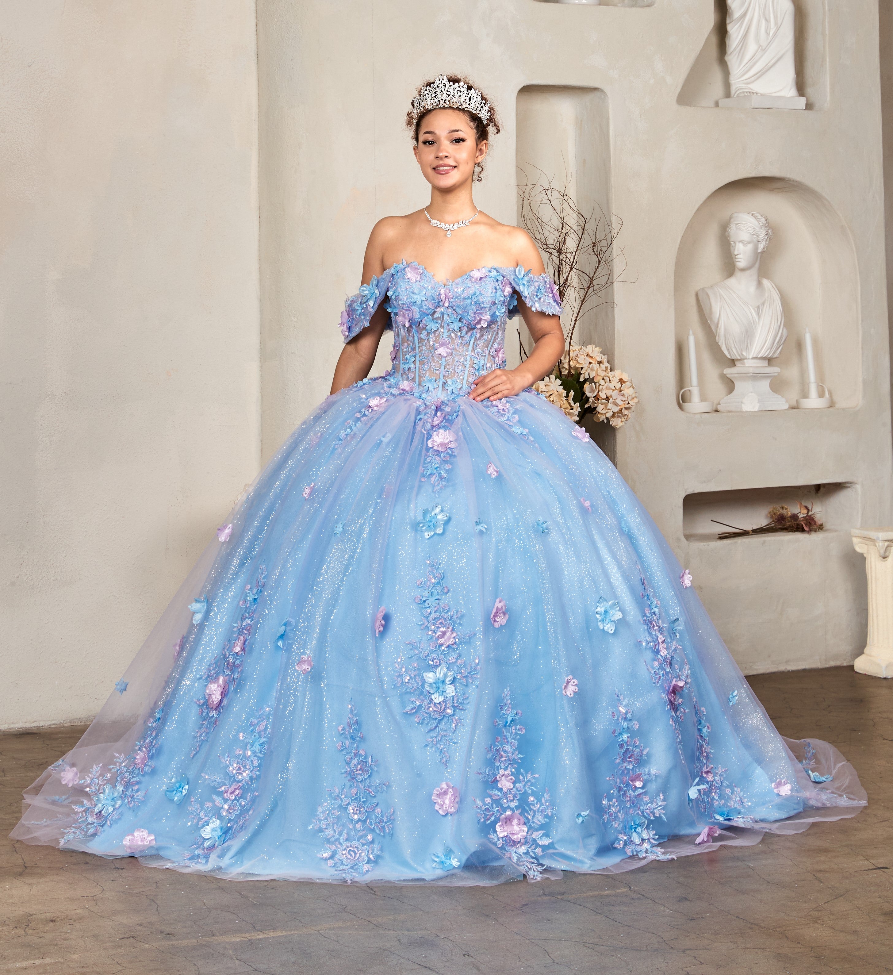 Step into a magical dream in the Aralyn Dreamlight Gown, a breathtaking quinceañera dress designed to captivate. This sparkling blue ballgown is adorned with whimsical lilac and pastel floral appliqués, cascading over layers of glitter tulle that shimmer with every movement. The off-the-shoulder neckline and illusion corset bodice bring soft romance and structure, while the full skirt and chapel-length train add drama and enchantment. Perfect for quinceañeras, Sweet 16s, or any grand celebration where fairy-tale elegance is a must.