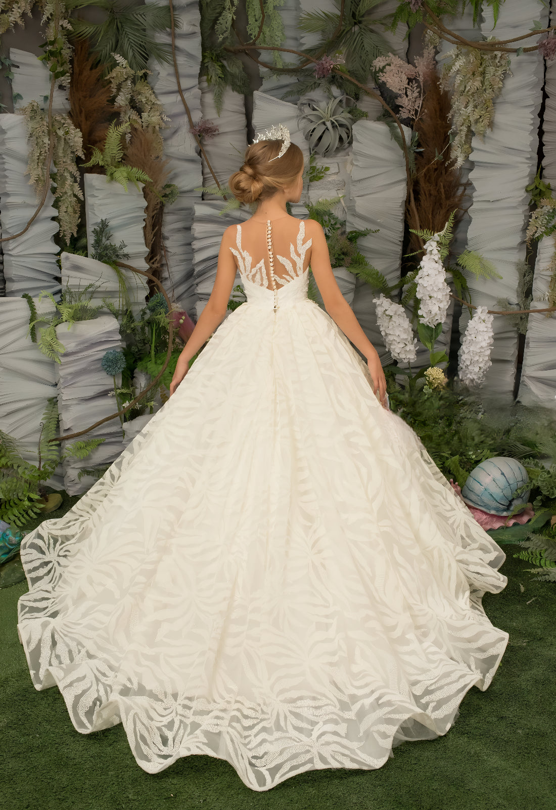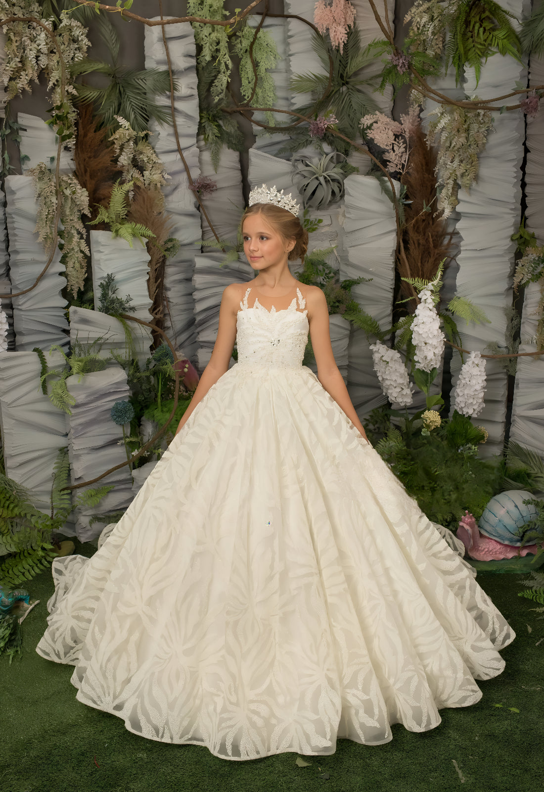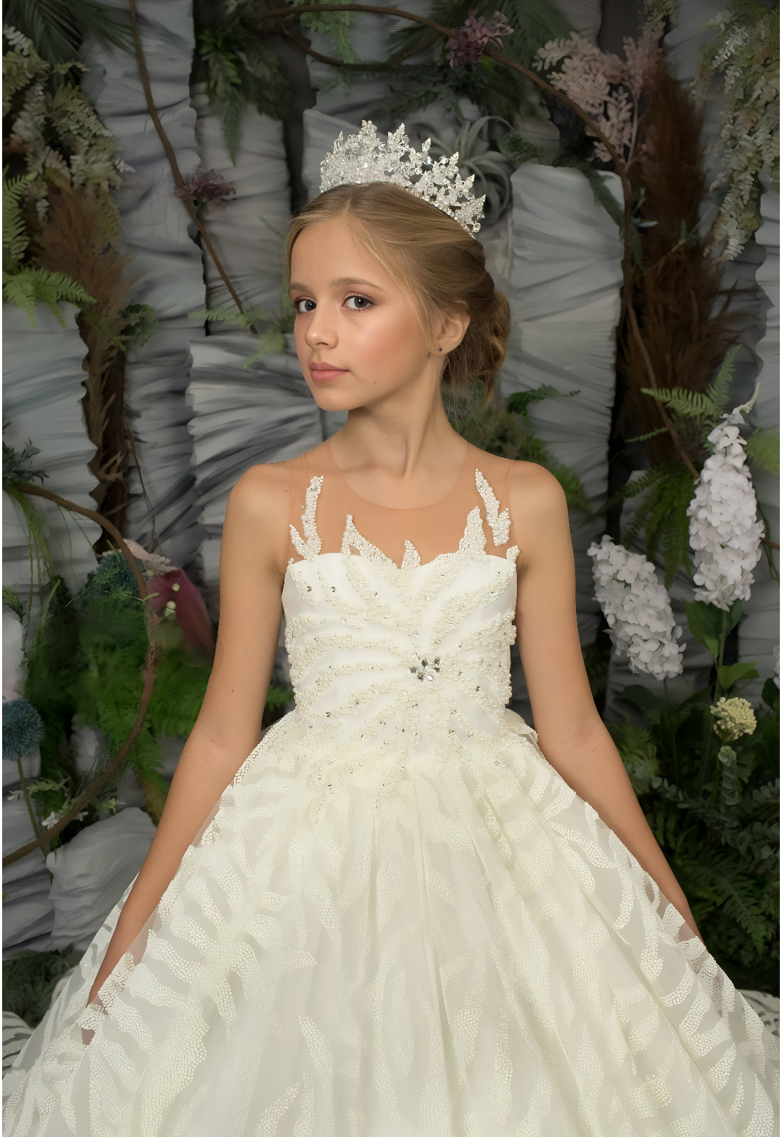 Unveil the true essence of royalty with the Athena Regal Couture Gown, a mesmerizing masterpiece designed for the most extravagant occasions. This breathtaking ball gown features an intricately embroidered bodice with pearl-encrusted detailing that gracefully extends into sheer illusion straps, offering an ethereal touch. The full, voluminous skirt boasts a luxurious textured design, creating a regal silhouette fit for a princess. A stunning illusion back with cascading pearl buttons completes this show-stopping look. Whether for pageants, galas, or high-fashion celebrations, the Athena Gown guarantees a moment of pure grandeur and elegance.