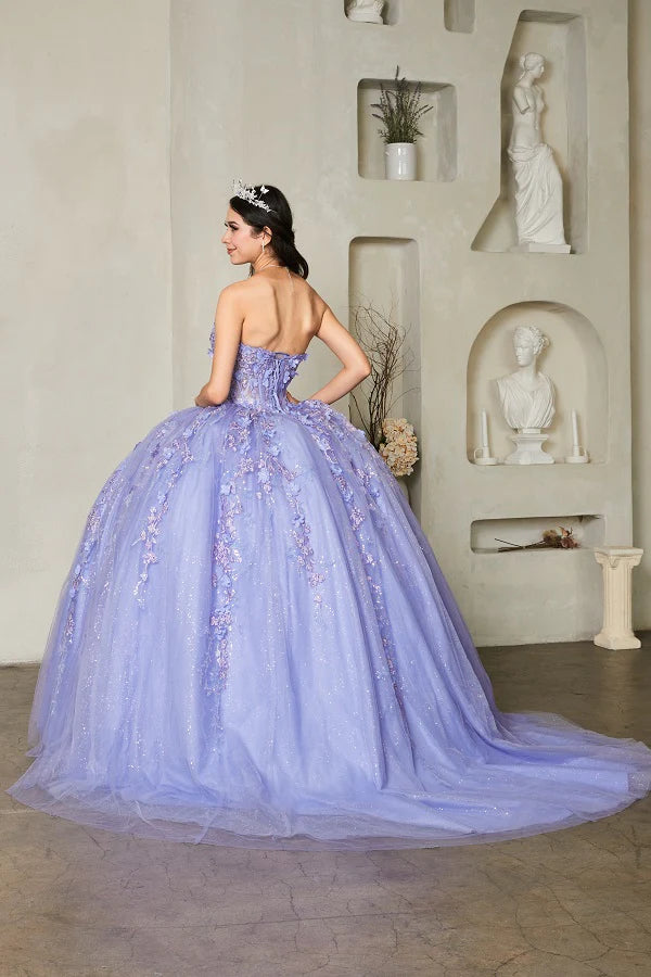 Turn heads in the Aurelia Belle Gown, a breathtaking blush pink quinceañera dress adorned with delicate 3D floral appliqués and sparkling sequin accents. The sheer structured bodice creates a captivating silhouette, while cascading blossoms trail down the voluminous ball gown skirt for a truly romantic feel. Perfect for the modern princess, this gown combines timeless charm with fairytale elegance—ideal for quinceañera celebrations, sweet 16s, or any special milestone event.