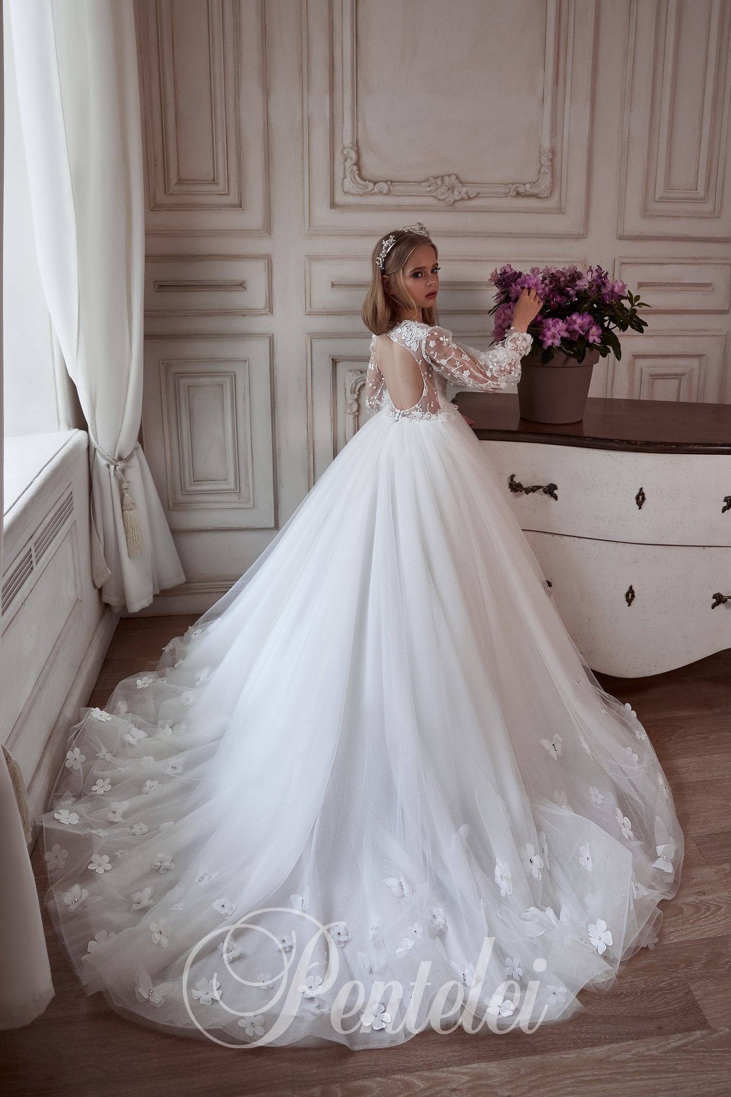 The Aurélie Gown by Pentelei Couture is a true work of art—designed for girls who deserve nothing less than breathtaking elegance. This custom-made couture gown showcases a voluminous tulle train scattered with dimensional floral appliqués, delicate pearl embellishments, and shimmering accents. The sheer long sleeves, illusion neckline, and open back create a regal silhouette, blending timeless sophistication with modern charm. Ideal for 1st communion, flower girl moments, and high-end special occasions, this gown is made to measure and handcrafted for those once-in-a-lifetime memories.