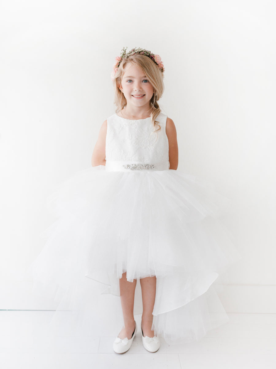 The Aurélie Ruffle Baby Dress is designed to captivate from every angle. Featuring a floral lace bodice and a cascade of soft tulle ruffles, this high-low silhouette brings a dramatic yet graceful flair to any special occasion. The satin waistband with crystal embellishment adds a hint of sparkle, while the full lining ensures comfort for little ones on the move. Perfect for birthdays, baby pageants, or elegant family celebrations. Finished with a back zipper and tie for a secure fit. Available in blush, champagne, ivory and white.
