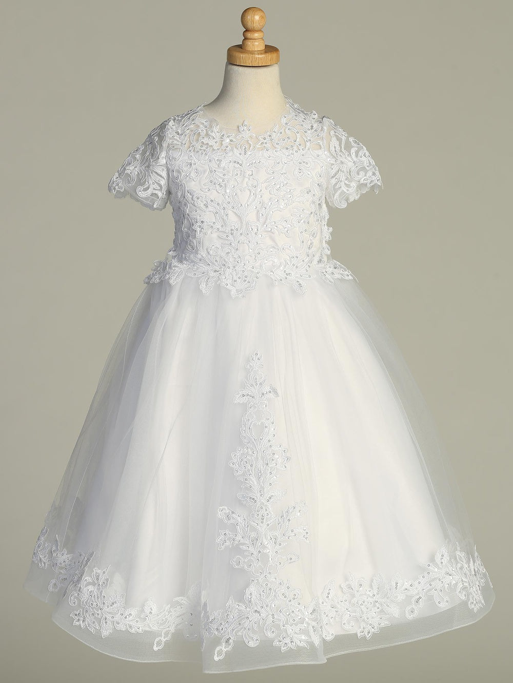 A breathtaking tea-length communion dress designed for your little one's special day. The Aurora Grace Dress features intricate lace appliqués on a sheer illusion neckline, a delicately adorned bodice, and a full tulle skirt with lace trim. A satin sash ties at the back for a perfect fit. This dress radiates charm, making it ideal for first communion, flower girls, and other special occasions.