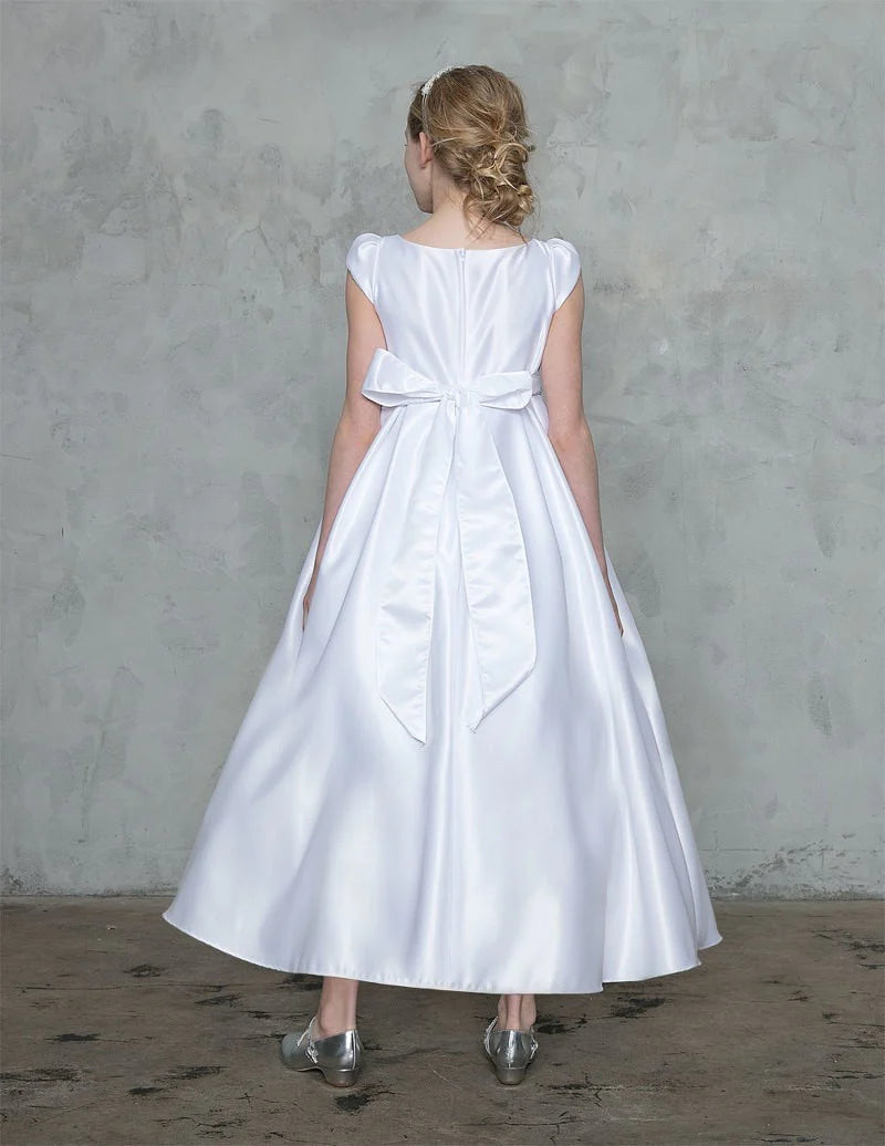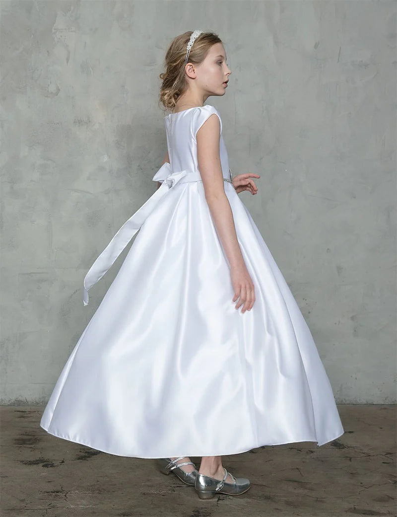 The Aurora Grace Satin Gown is a stunning vision of refined luxury, designed for young girls who appreciate sophistication. Crafted from luminous satin, this A-line gown flows gracefully, enhanced by a delicately beaded waistline featuring an intricate bow embellishment. The cap sleeves offer a classic touch, while the flowing skirt creates an effortlessly regal look. Perfect for 1st communion, flower girl, or any cherished occasion, this gown is a statement piece of pure grace and timeless beauty.
