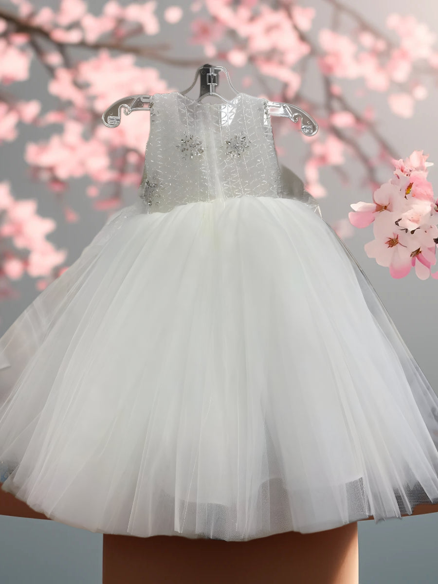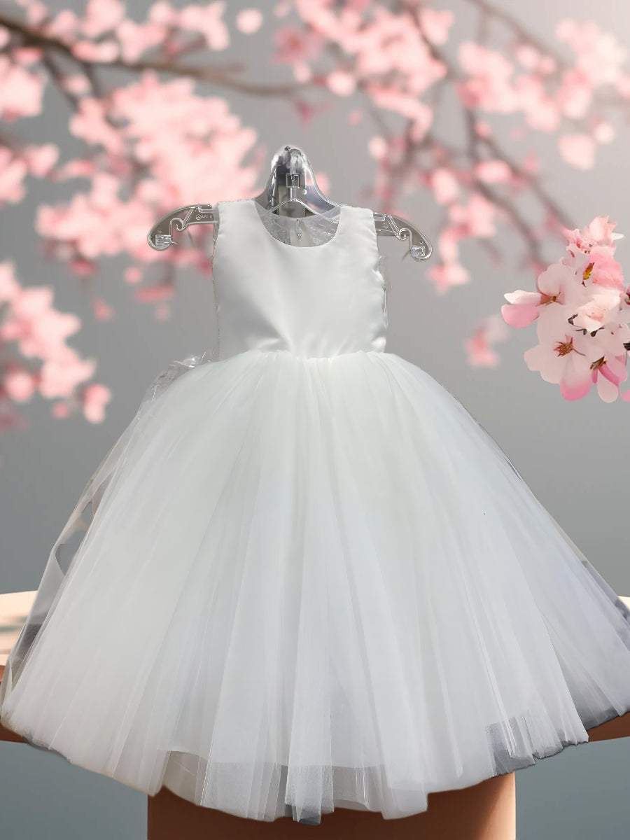 The Aurora Crystal Back Tulle Dress by Amalee Couture is a dazzling choice for the modern princess. This sleeveless design features a clean satin bodice paired with a voluminous layered tulle skirt that floats with every step. The true standout is the back: a sheer illusion panel adorned with shimmering crystal beading in a graceful floral arrangement, adding a delicate sparkle and couture finish. Available in White or Ivory, this dress is ideal for First Communion, flower girls, portraits, birthdays, or any special celebration. Designed with the perfect balance of simplicity and glamor. Custom sizing available for a picture-perfect fit.