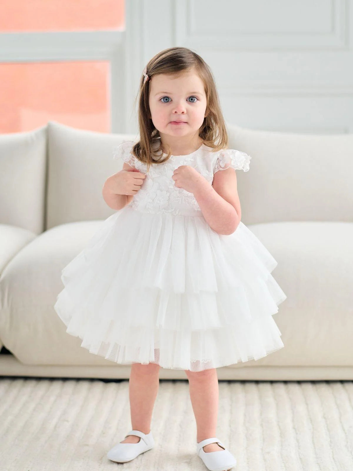 Dress your baby in timeless beauty for their christening with the Baby Christening Tulle and Lace Dress. Featuring an off-white lace bodice and a dreamy 3D lace tulle skirt, this dress is a vision of elegance. The round neckline and semi-cap sleeves create a classic, feminine silhouette, while the back zip closure ensures a secure and easy fit. This dress is a keepsake that will be cherished for years to come.