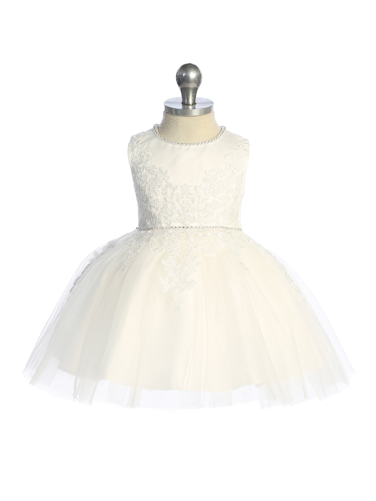 The Emilia Bow Lace Dress is the perfect blend of timeless elegance and baby sweetness. Designed for little girls ages 6–24 months, this beautifully crafted baby lace dress features a delicate lace bodice adorned with a subtle rhinestone neckline and matching waist detail for a soft, luminous finish. The full tulle skirt creates gentle volume while remaining lightweight and comfortable for babies. A rear center zipper with bridal-style button detailing adds a refined touch, while the oversized bow sash at the back makes this dress unforgettable from every angle. Fully lined for comfort, it’s available in classic white or ivory for versatile styling. Perfect for birthdays, special occasions, portraits, and flower girl moments, this baby party dress captures that precious milestone charm parents love.