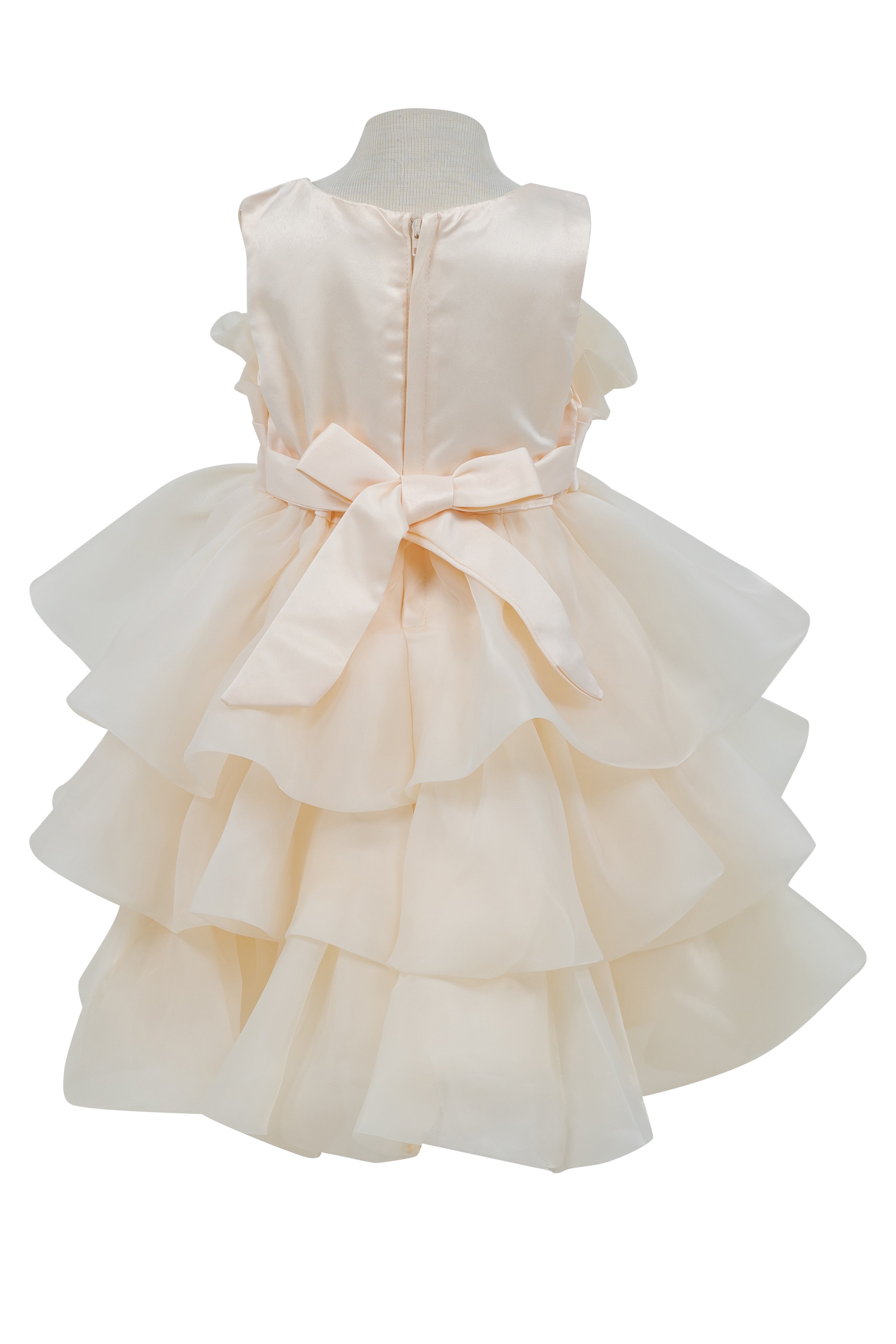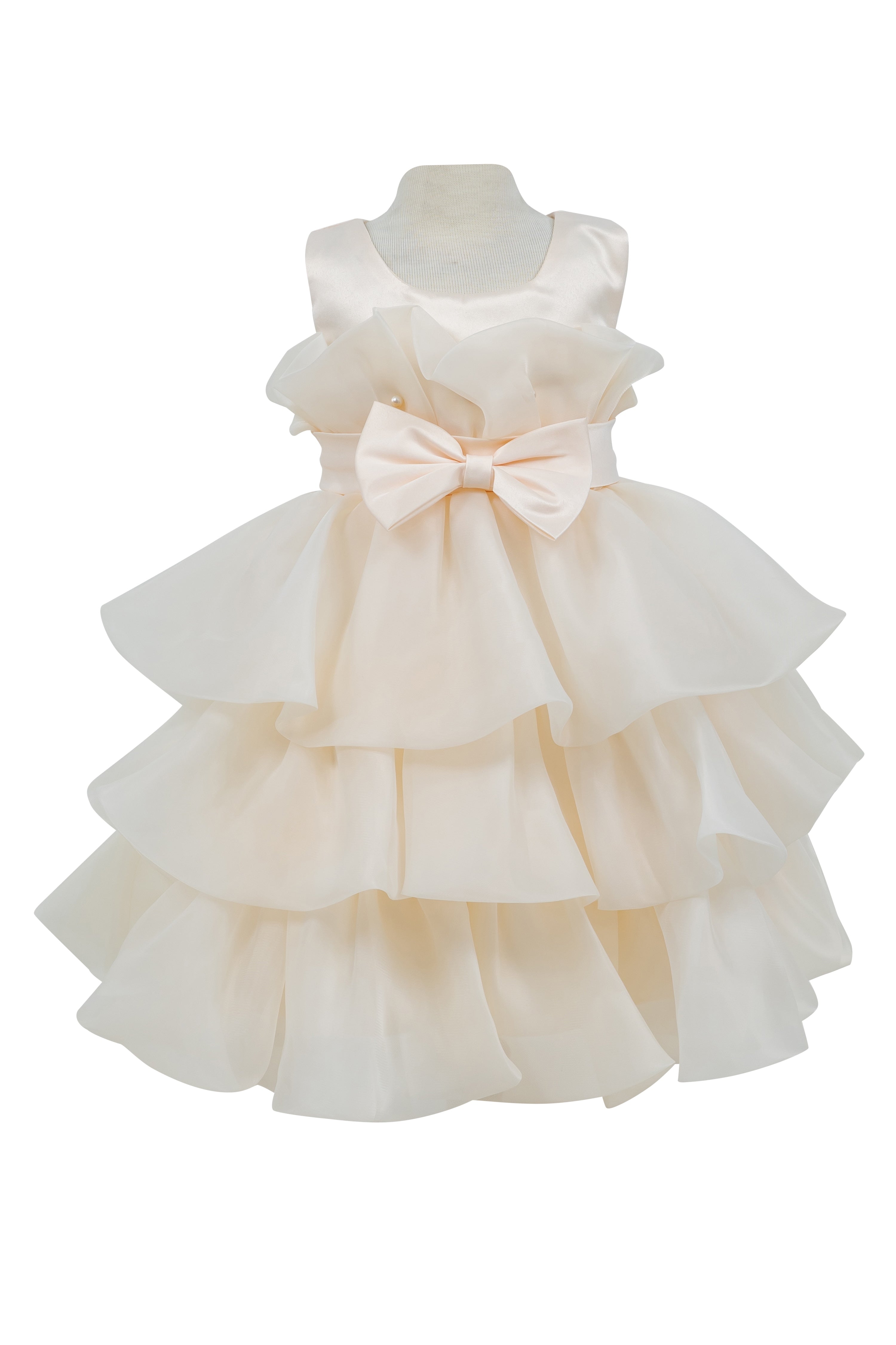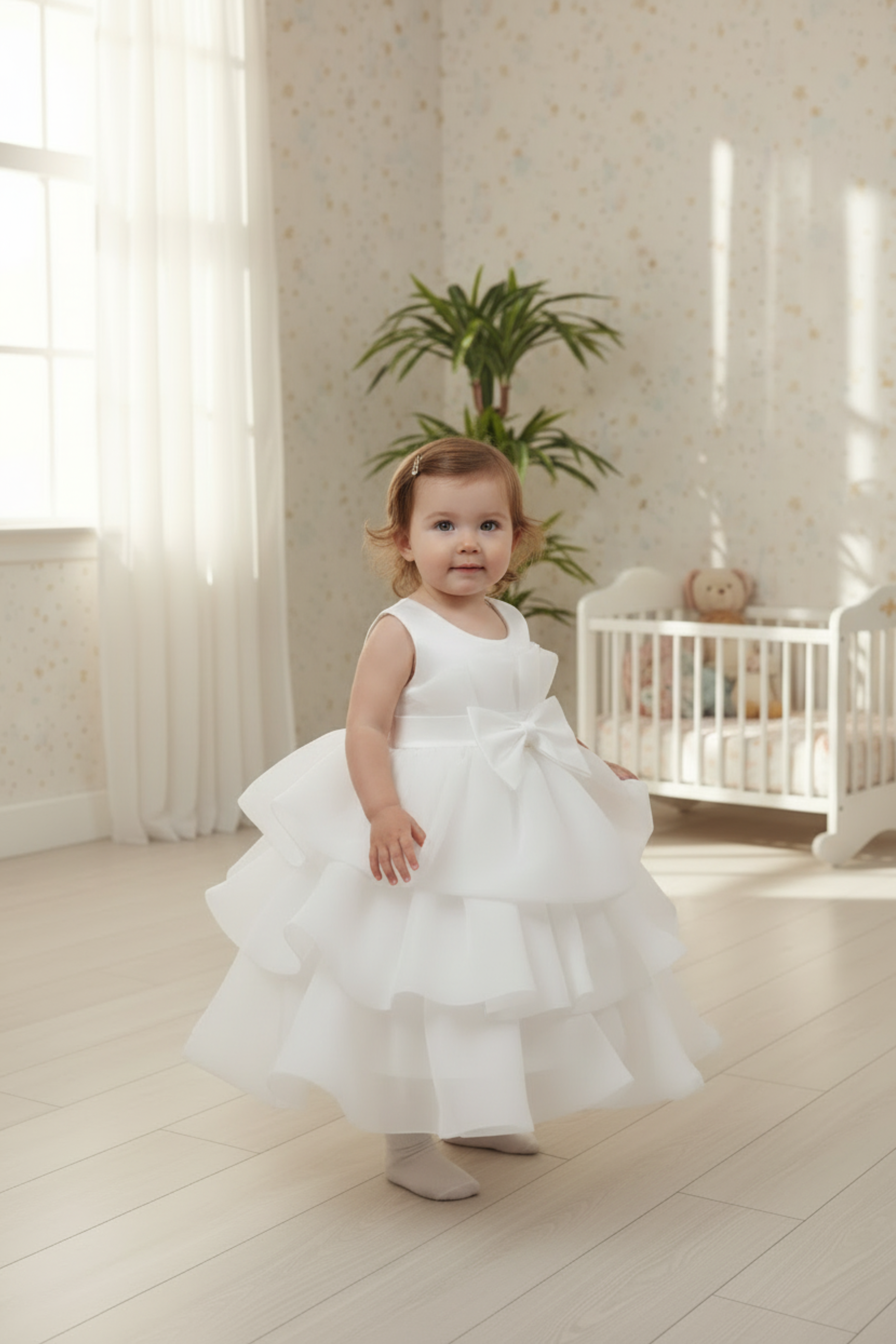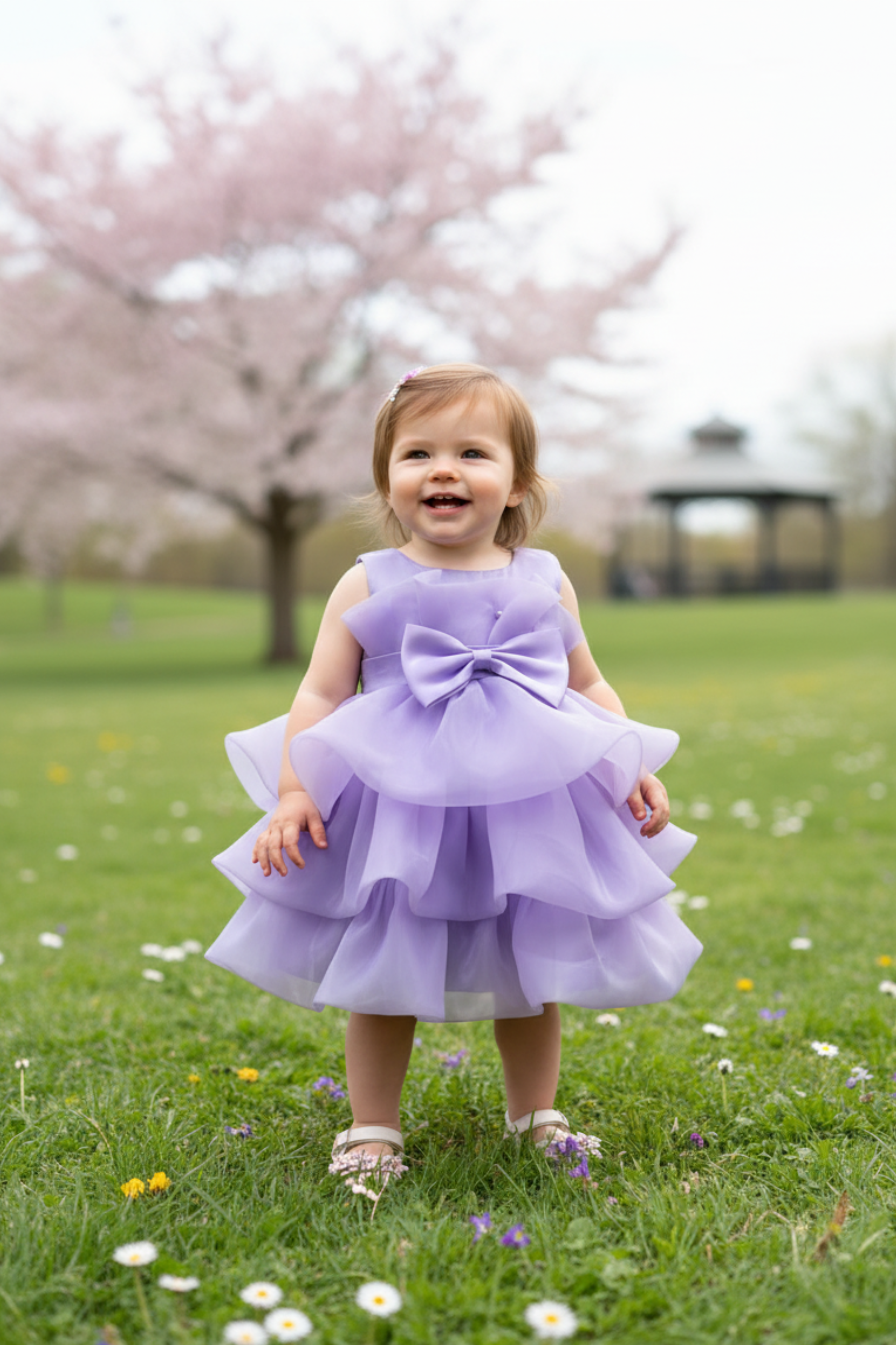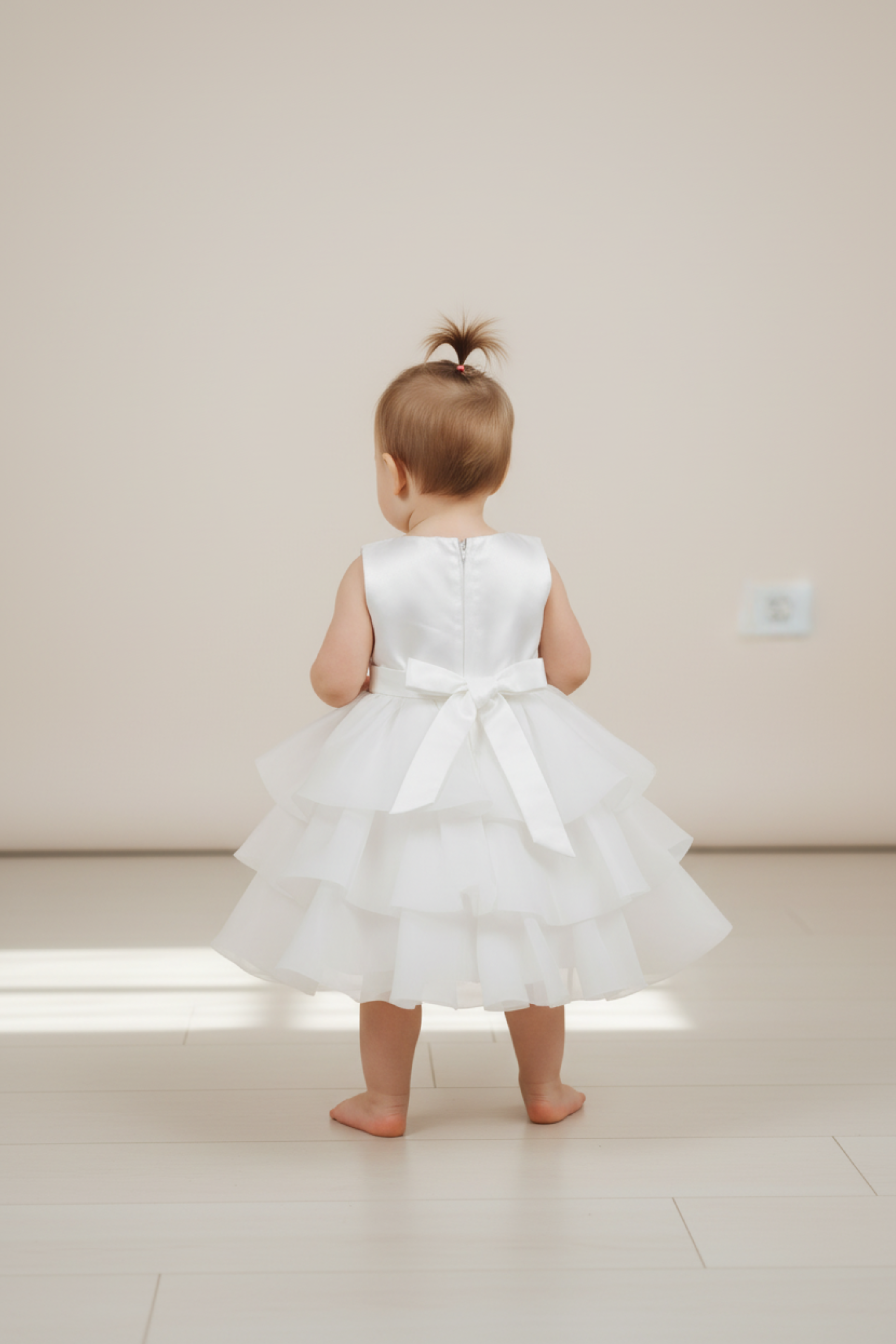 The Blossom Tier Baby Dress is a picture-perfect party dress designed to make her shine at every celebration. Available in peach, lilac, champagne, and white, this beautifully layered silhouette brings soft elegance and playful charm together in one unforgettable look. The sleeveless satin bodice offers a smooth, classic finish, while the multi-tiered organza skirt creates stunning movement and fullness. A statement satin bow at the waist adds a sweet, polished touch, making this dress ideal for birthdays, cake smash sessions, portraits, weddings, and special occasions. The lightweight layered construction gives the dress beautiful volume without feeling heavy, allowing little ones to move comfortably while looking absolutely adorable. The back zipper closure ensures easy dressing for busy parents. Whether she’s celebrating her first birthday or attending a family gathering, this baby special occasion dress delivers charm, elegance, and affordability in one magical design.