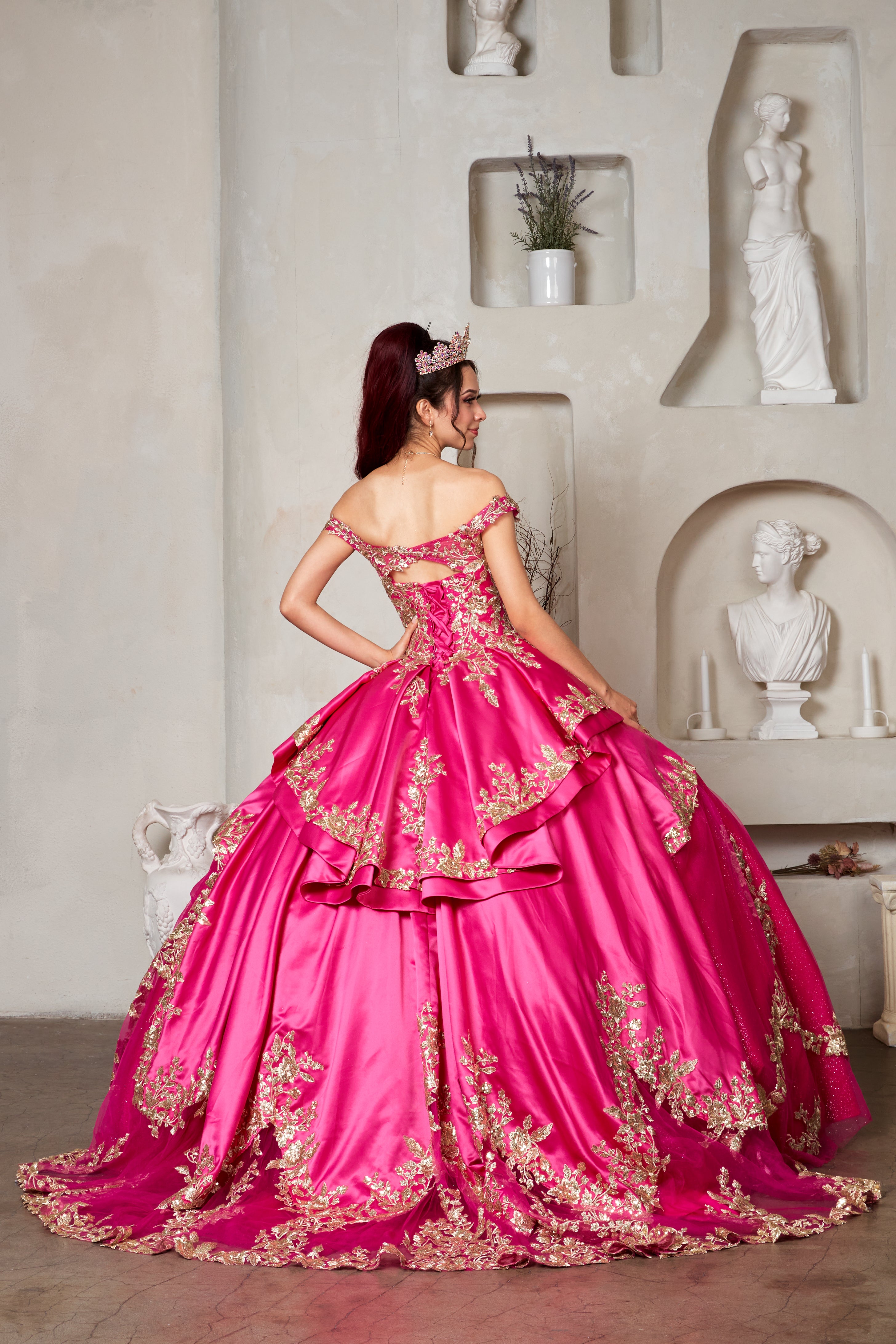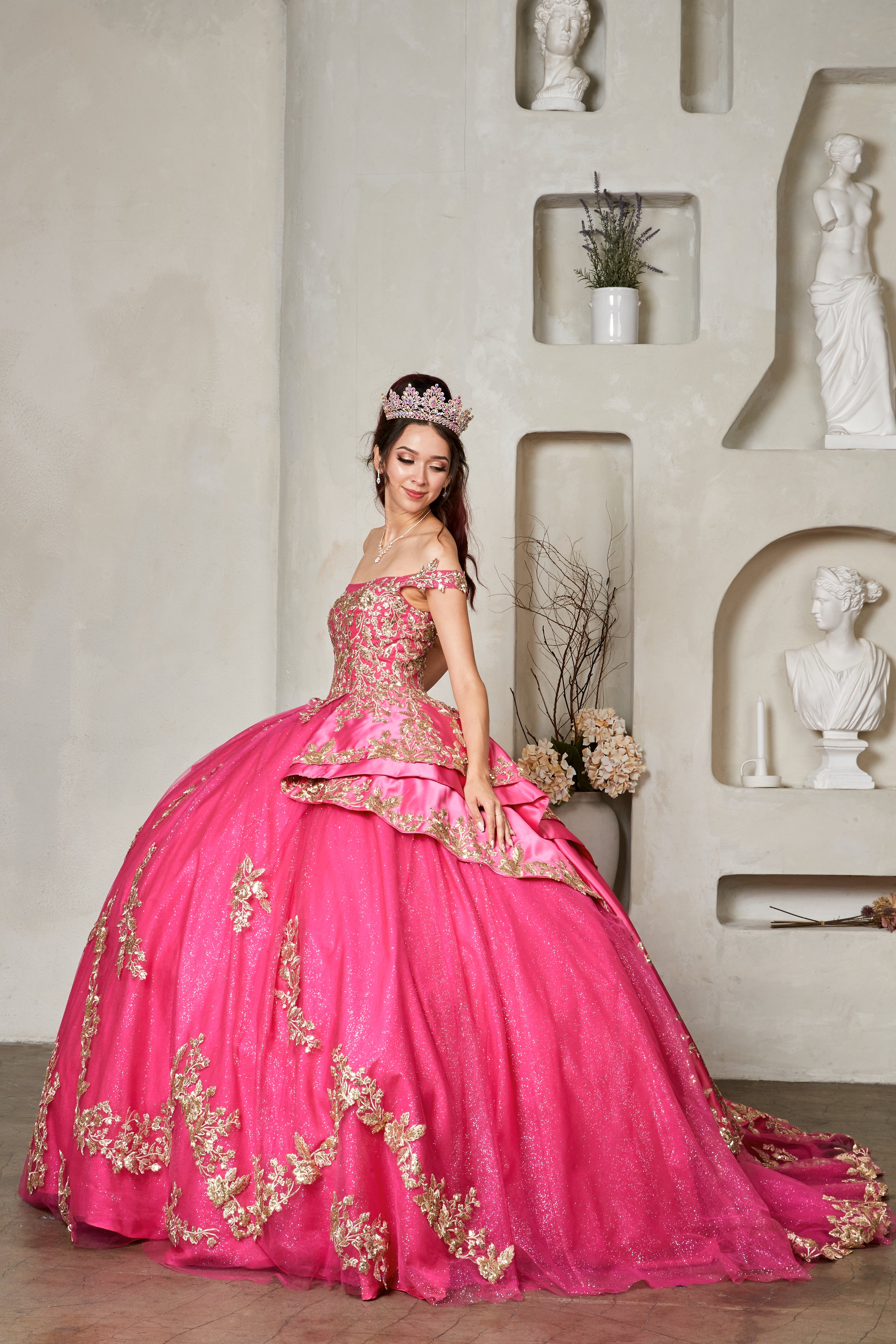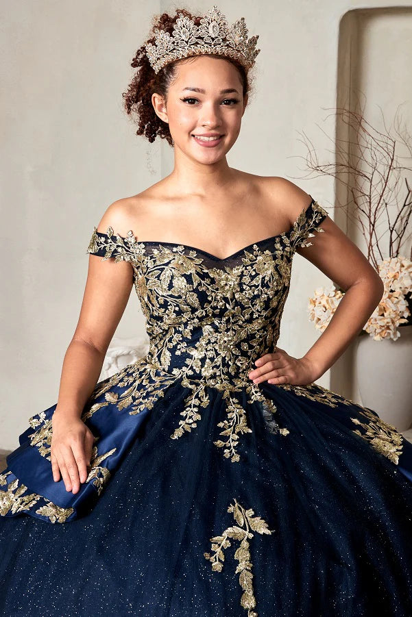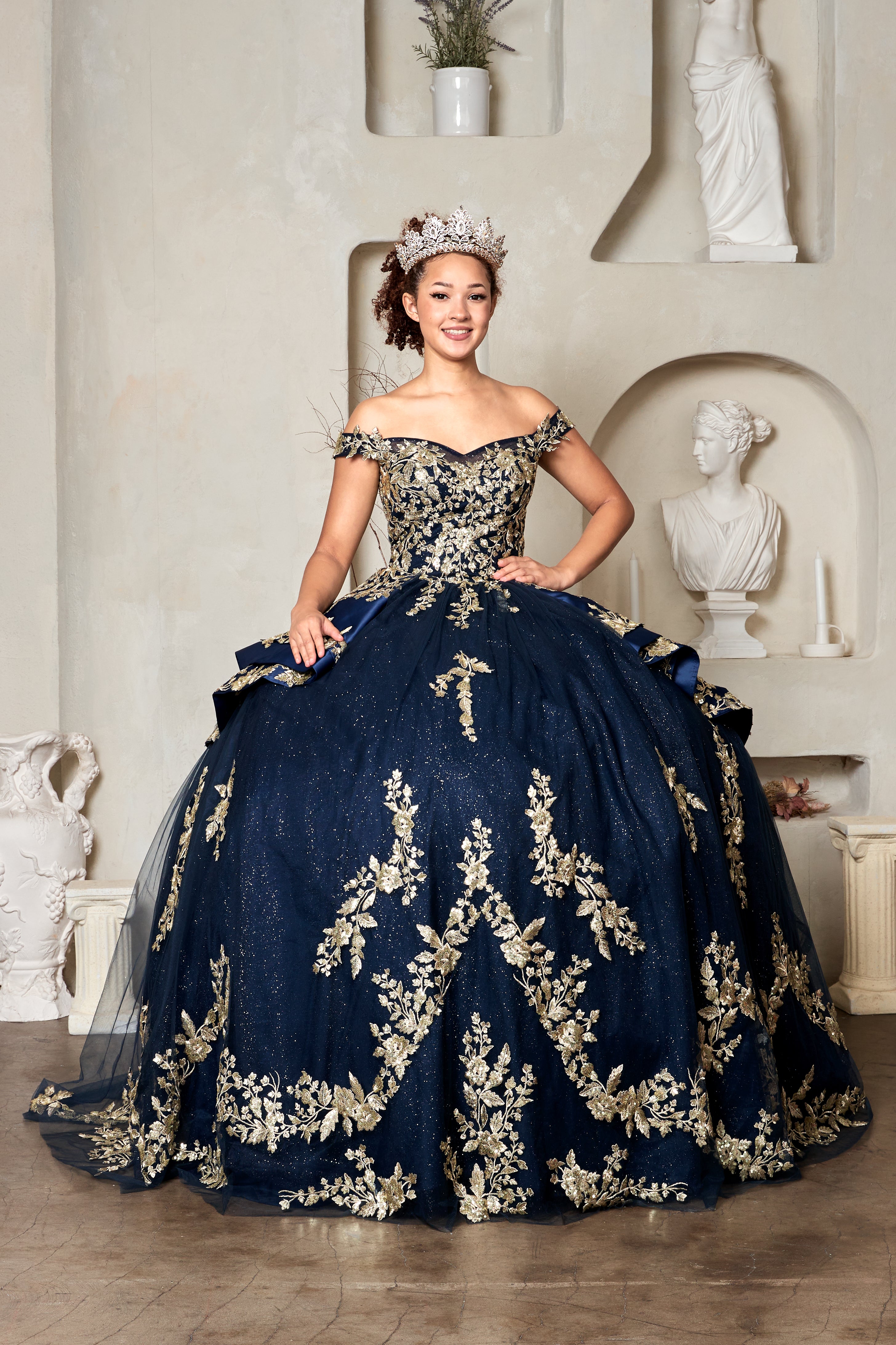 Bold, majestic, and dripping in opulence—the Bellarose Royale Gown is the ultimate showstopper for a modern-day queen. Available in fuchsia/gold, navy/gold, and black/gold, this quinceañera ballgown features rich glitter tulle layered with luxe metallic floral embroidery. A structured off-the-shoulder bodice and dramatic satin peplum waistline create a regal silhouette, while the sweeping skirt ensures a grand entrance from every angle. Whether you choose radiant fuchsia, deep navy, or classic black, this gown delivers unforgettable glamour for your quinceañera, Sweet 16, or royal celebration.