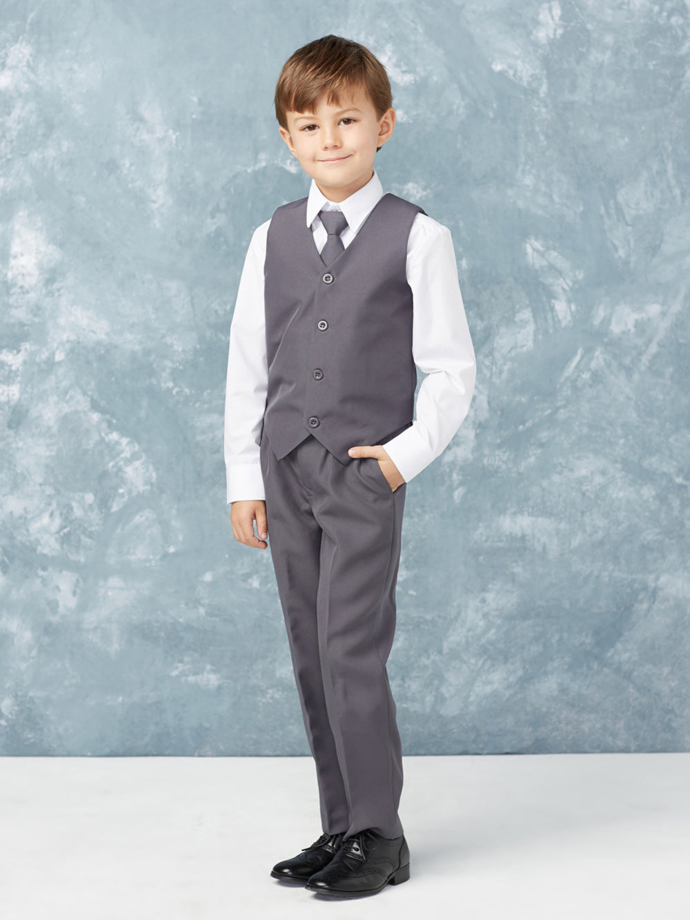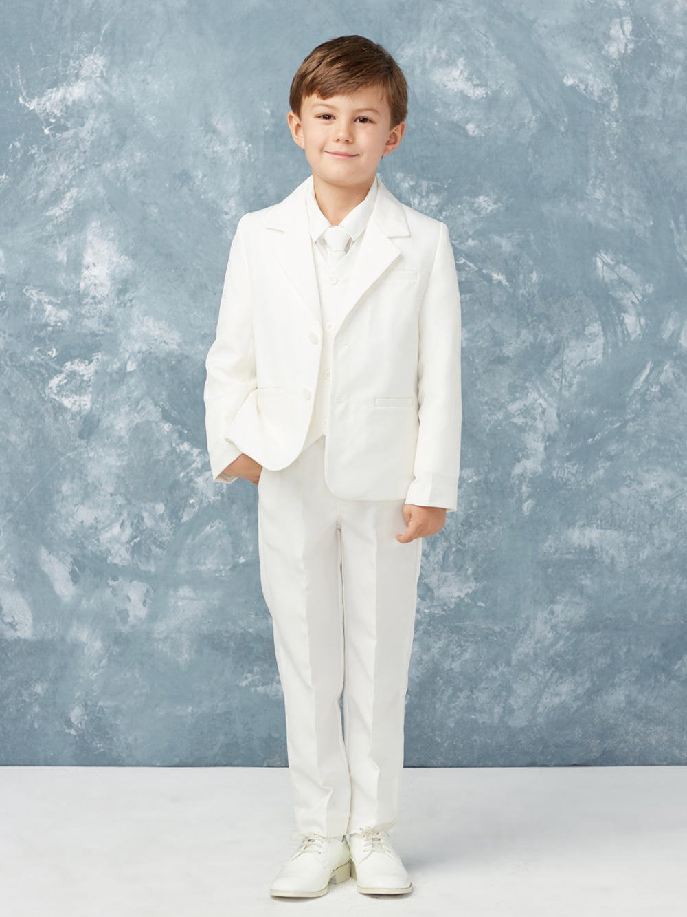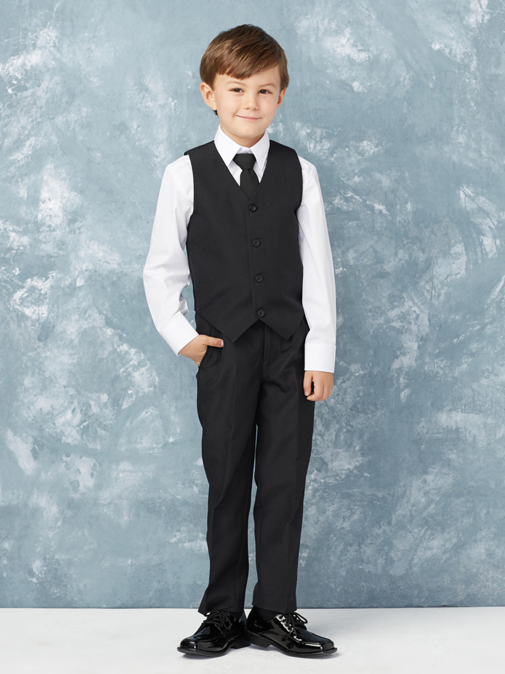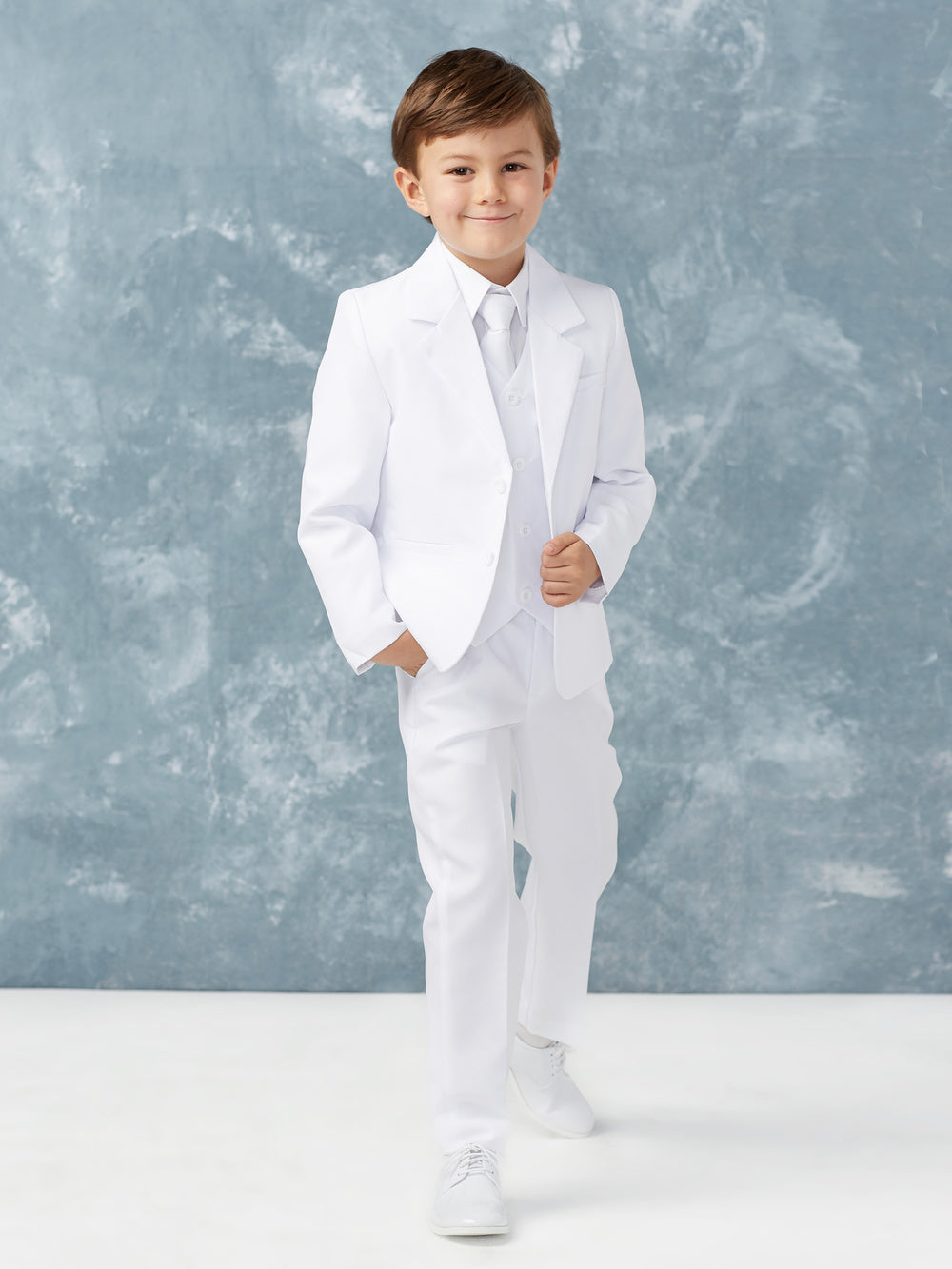 Dress him to impress with this classic 5-piece boys' vest suit, perfect for weddings, communions, and formal events. This sophisticated set includes a tailored vest, matching trousers, a crisp white dress shirt, a coordinating tie, and a sleek jacket, creating a polished and refined look. Available in black, gray, white, and navy blue, this suit is designed for comfort, durability, and timeless elegance. Whether he’s a ring bearer, attending a family celebration, or making a stylish statement, this suit ensures he looks his best for any formal occasion.