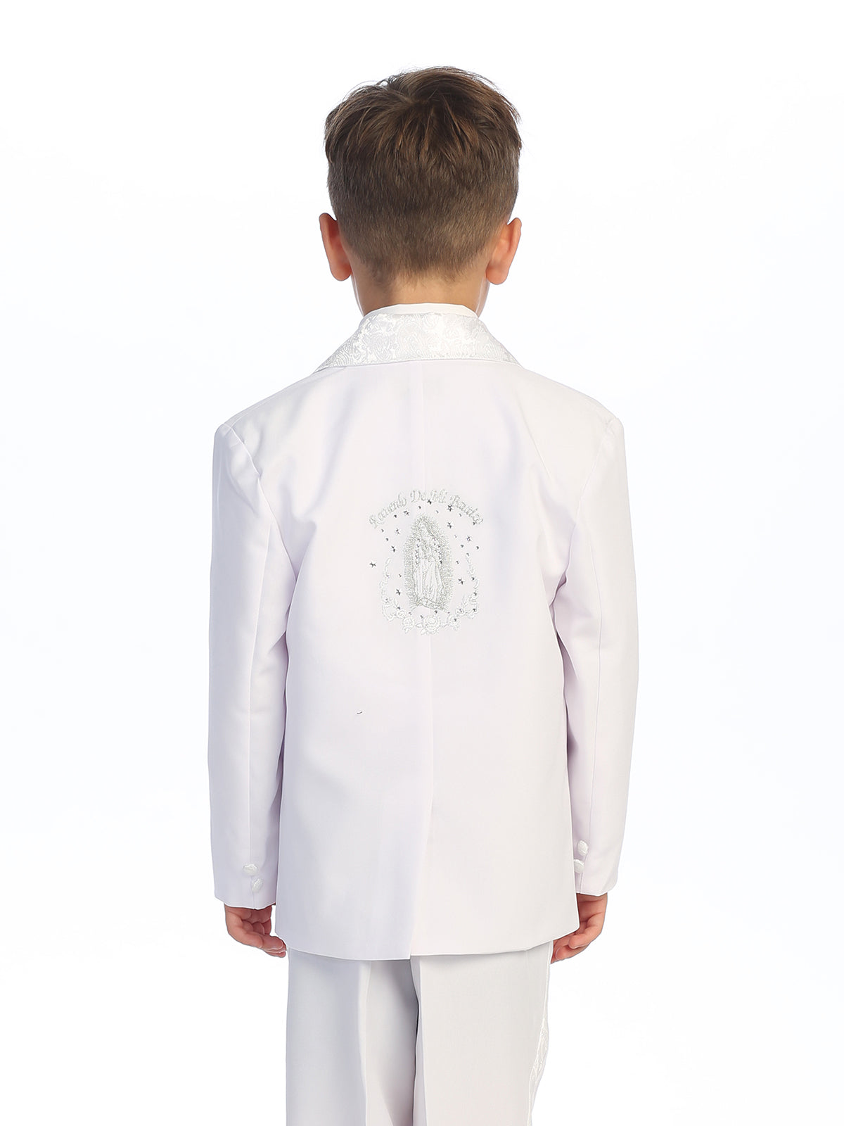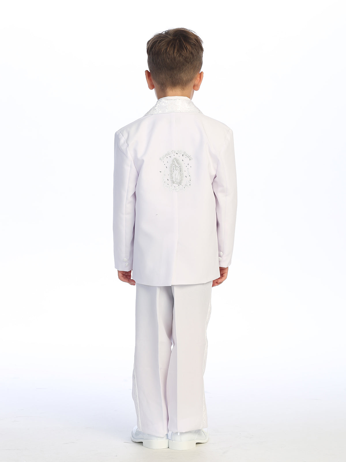 Celebrate his special day with this elegant boys' baptism suit, designed for christenings, first communions, and religious ceremonies. This 5-piece ensemble features a white jacket with intricate embroidery of a cross and Maria on the back, a matching vest, pants, dress shirt, and bow tie, creating a timeless and angelic look. Tailored for both babies and kids, this suit ensures a comfortable and stylish fit for any sacred occasion. Made from high-quality fabric for softness and durability, it's the perfect choice for a memorable and cherished moment.