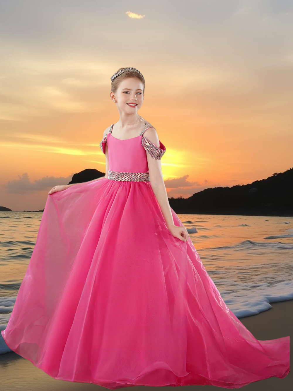 Radiate elegance and charm in this Brydealo Couture pink pageant gown, designed to dazzle at any special event. Featuring an exquisite off-shoulder strap design with sparkling rhinestone embellishments at the waist and sleeves, this full-length gown flows into a voluminous organza skirt that glimmers with every twirl. The rich pink hue paired with couture detailing makes it a breathtaking choice for pageants, birthdays, flower girl moments, or father-daughter dances. Shown in pink; also available in multiple colors from our Brydealo Couture color chart.