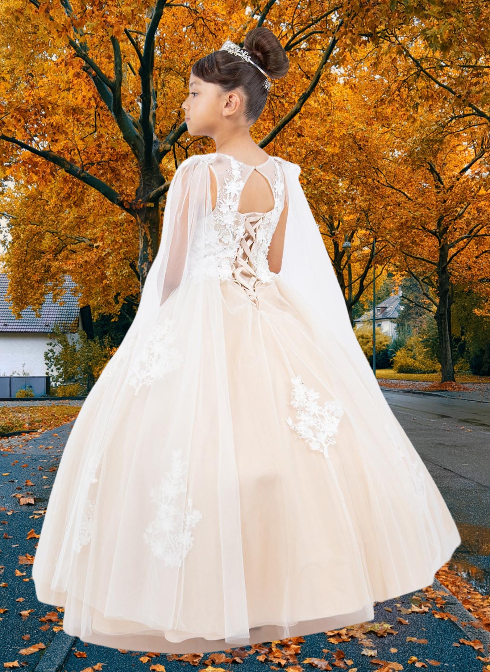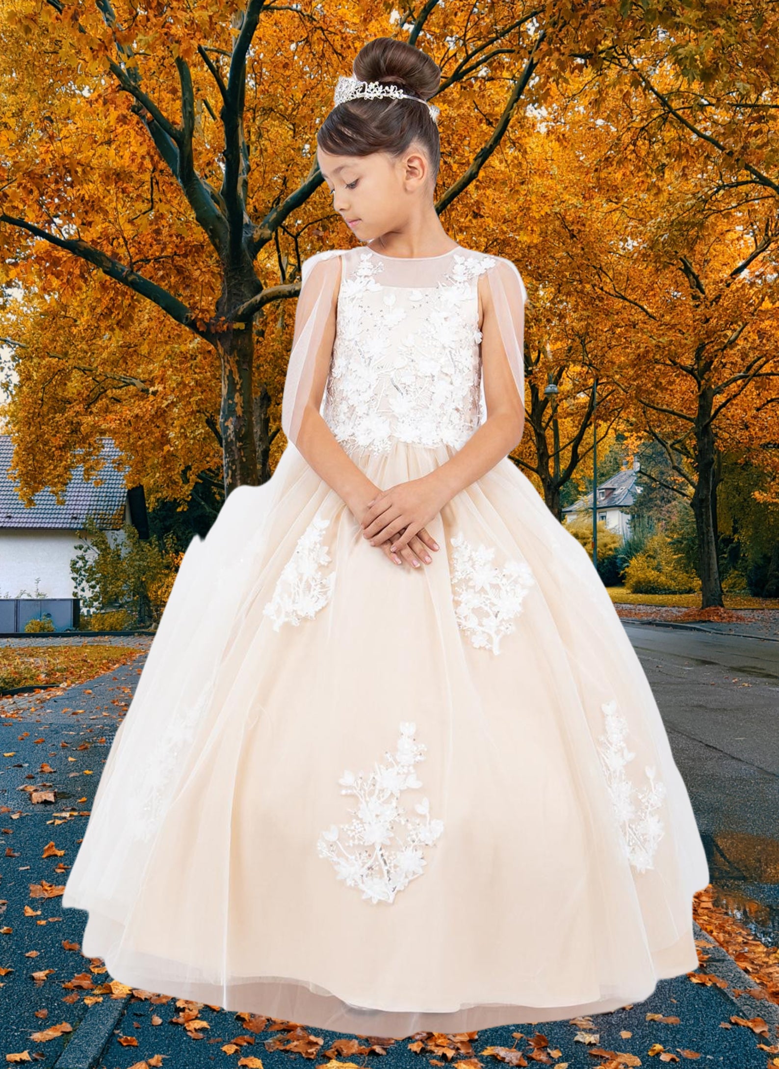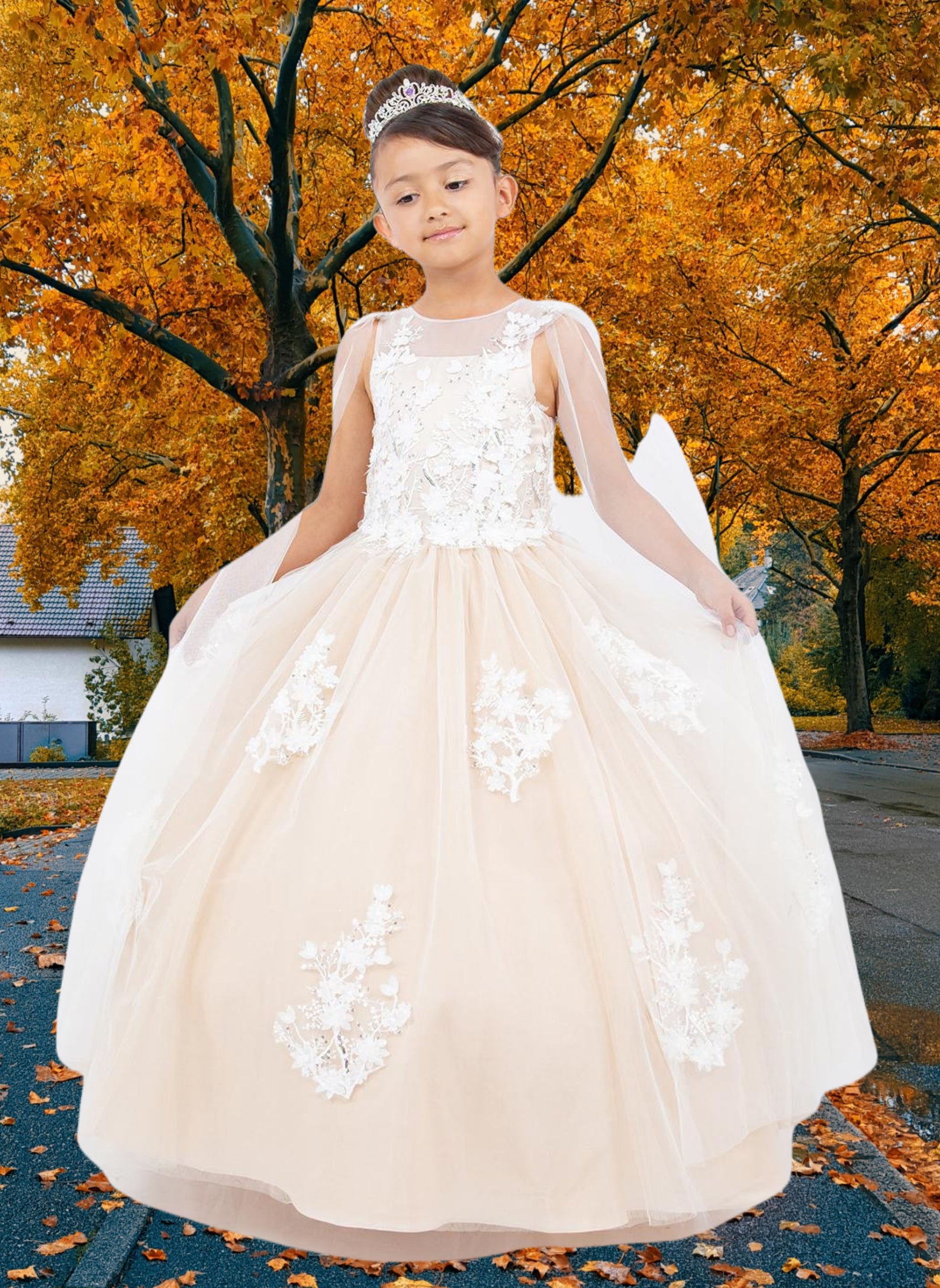 A breathtaking choice for communion or any elegant occasion, the Cambria Gown stuns in soft champagne or classic white. Designed with cascading cape-style sleeves and a beautifully structured bodice adorned in 3D floral lace appliqué, this ball gown silhouette offers a dreamy finish from every angle. The back features a refined lace-up design for adjustable comfort, while the illusion neckline adds a touch of ethereal charm. Perfect for communion, flower girl, portraits, or luxury celebrations.