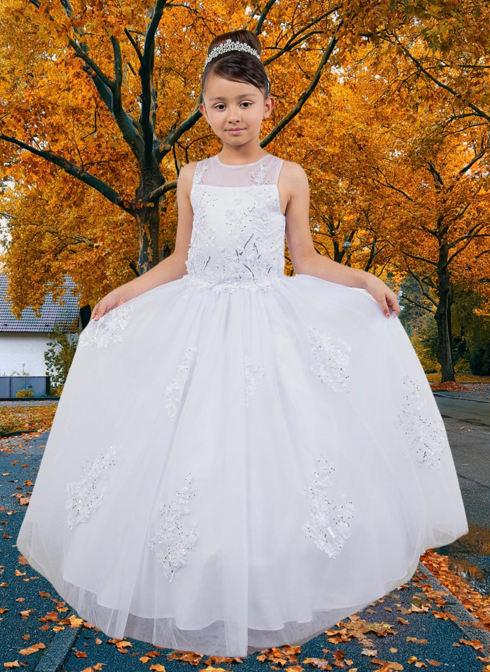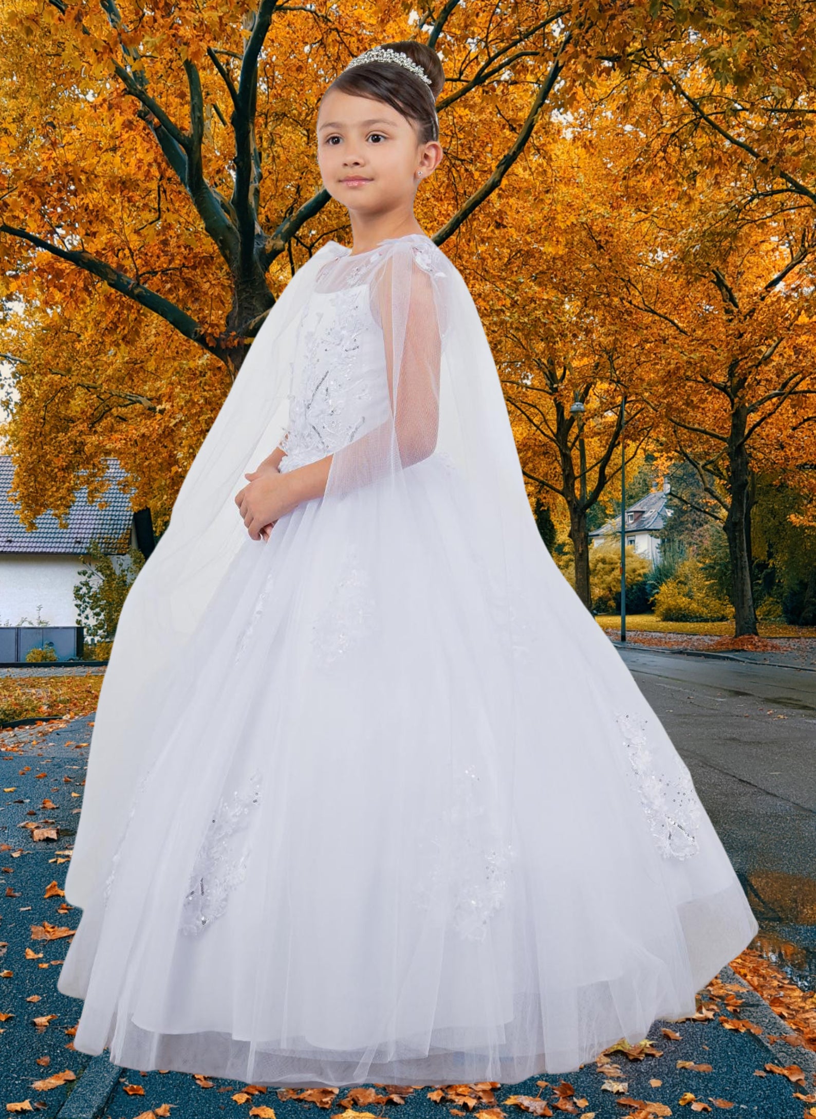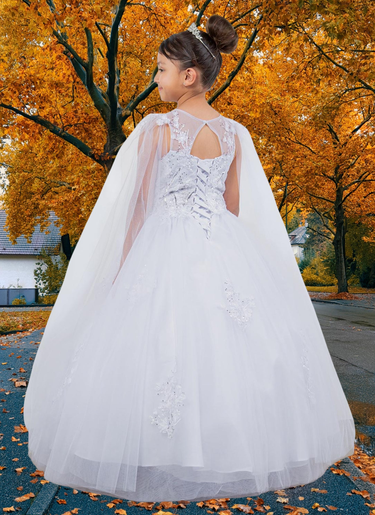 A breathtaking choice for communion or any elegant occasion, the Cambria Gown stuns in soft champagne or classic white. Designed with cascading cape-style sleeves and a beautifully structured bodice adorned in 3D floral lace appliqué, this ball gown silhouette offers a dreamy finish from every angle. The back features a refined lace-up design for adjustable comfort, while the illusion neckline adds a touch of ethereal charm. Perfect for communion, flower girl, portraits, or luxury celebrations.