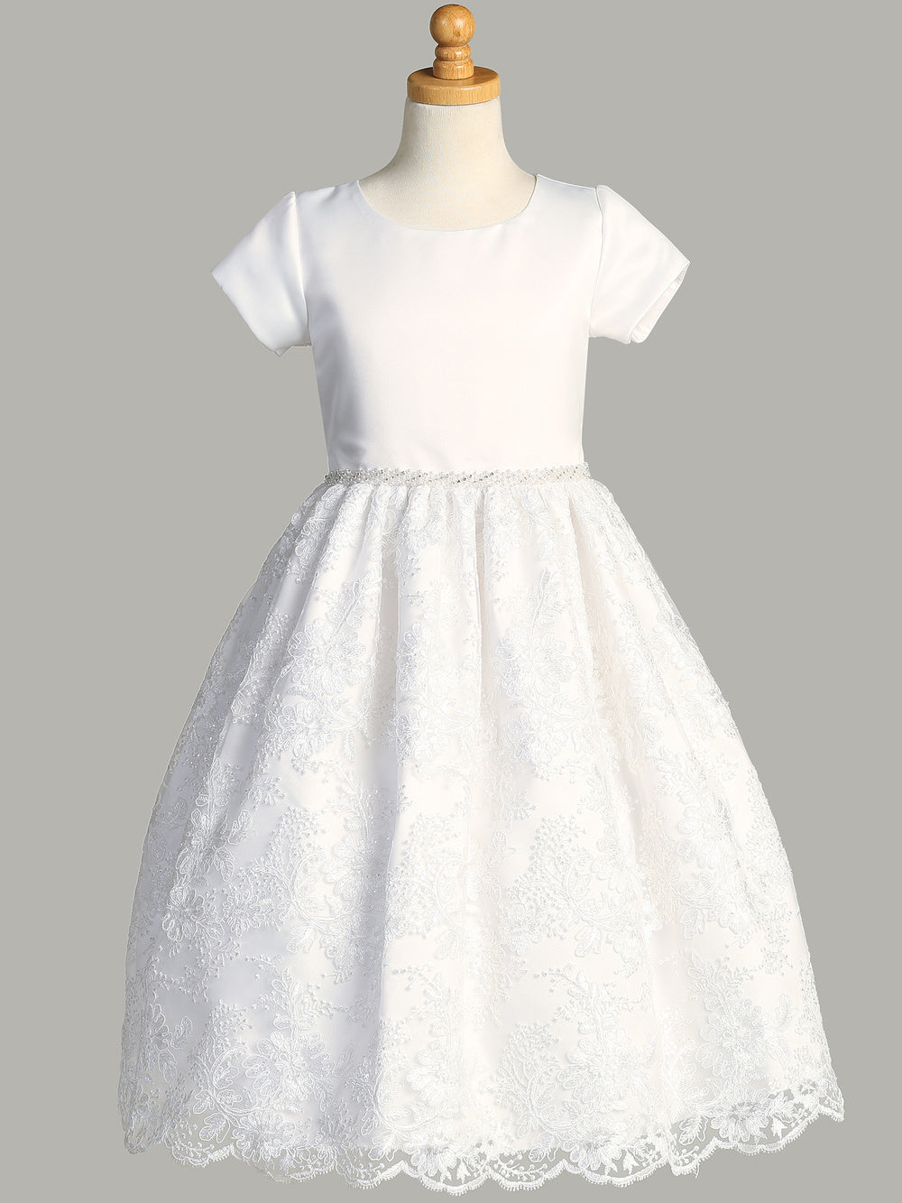 Timeless beauty meets delicate craftsmanship in the Camila Lace Communion Dress. This tea-length gown features a soft satin bodice paired with a breathtaking lace-embroidered skirt, perfect for First Communion, flower girl, or special occasions. The short sleeves and a satin waistband with an oversized bow at the back add a graceful touch. Designed for comfort and style, this dress ensures she looks and feels her best.