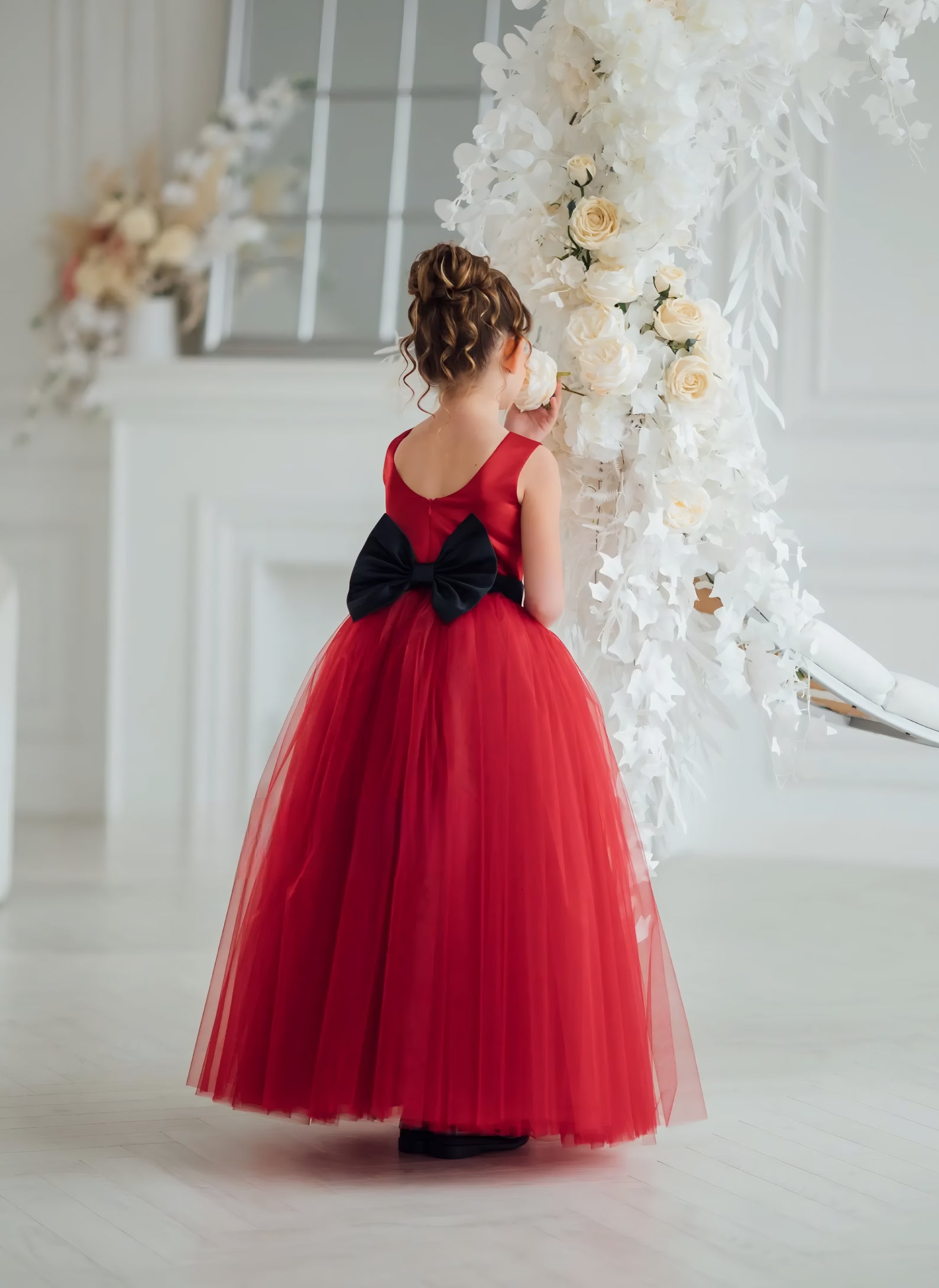 Make a bold statement with the Carmella Rouge Gown, a stunning red dress designed for unforgettable entrances at pageants, birthdays, and special occasions. Featuring a sleeveless satin bodice and a voluminous tulle skirt, this gown is finished with a dramatic black bow at the back for a striking contrast. Crafted from premium satin and soft tulle, this dress is 100% handmade with no glue, no chemical odors, and absolutely no itchy or skin-irritating materials, ensuring all-day comfort. Perfect for flower girls, holiday parties, or any event where your little one wants to shine.