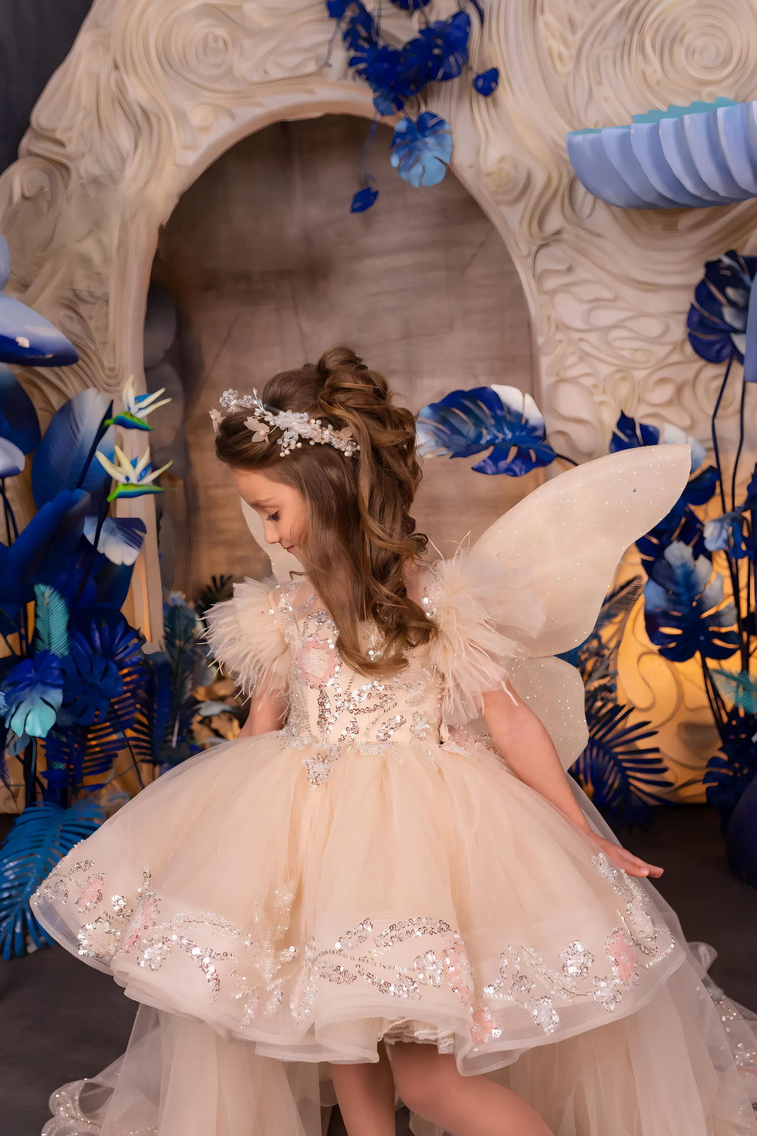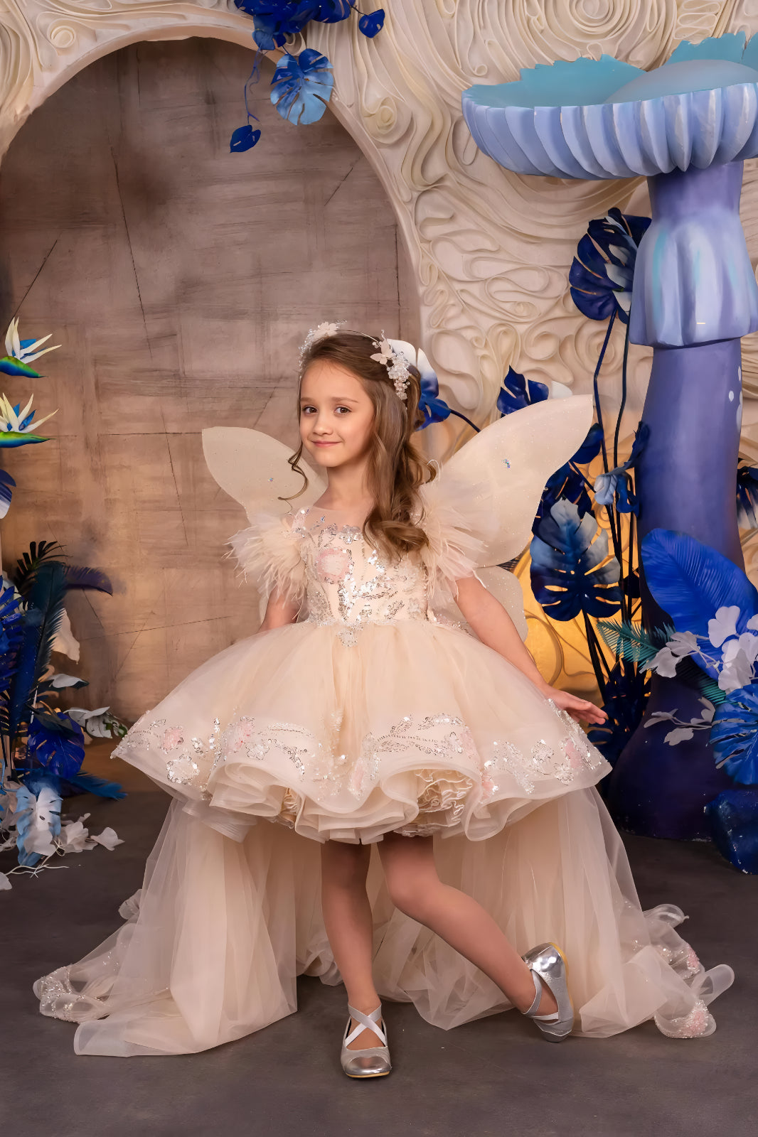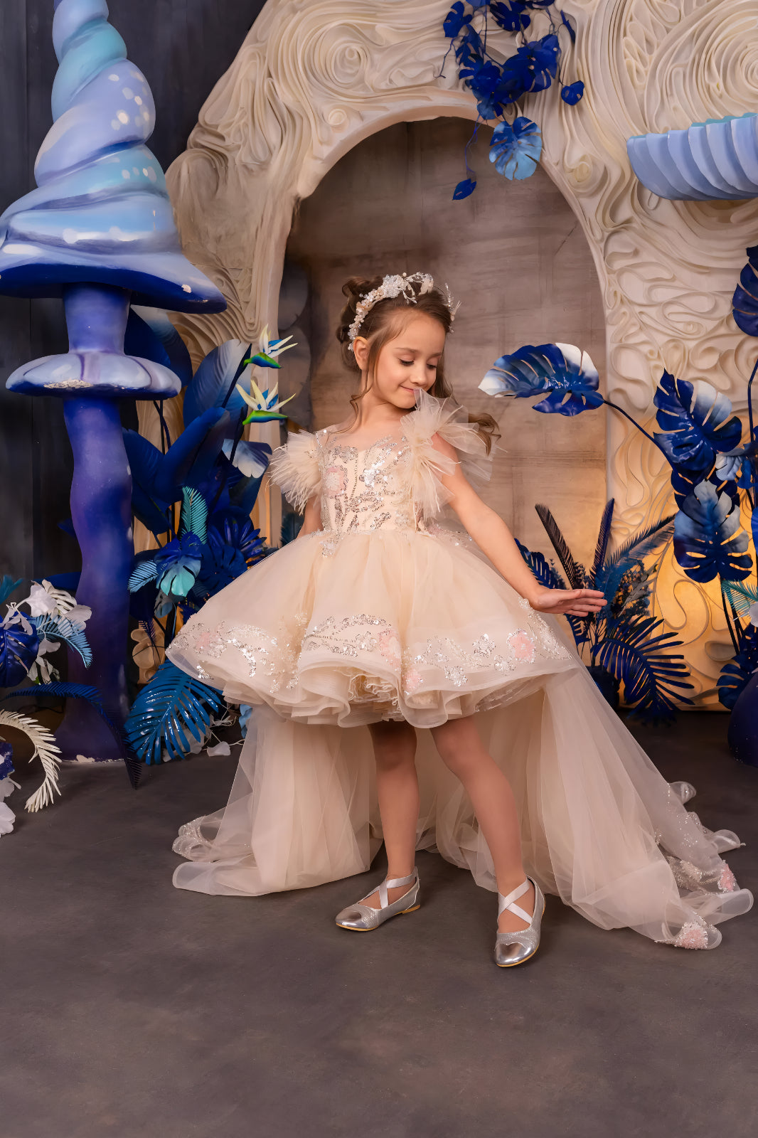 A dream in motion, the Celene girls pageant gown enchants with its cappuccino hi-lo silhouette, dramatic detachable train, and whisper-soft tulle puff sleeves. Sparkling with delicate sequin floral embroidery and fine couture craftsmanship, this dress is a stunning choice for luxury birthdays, pageants, and special celebrations. A showstopper of elegance and whimsy in one timeless design.