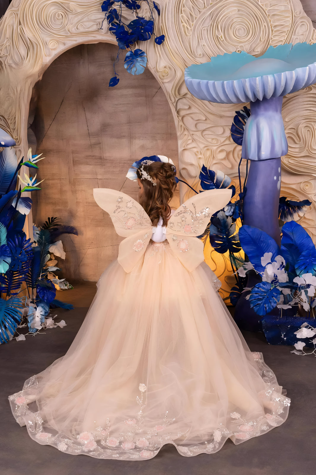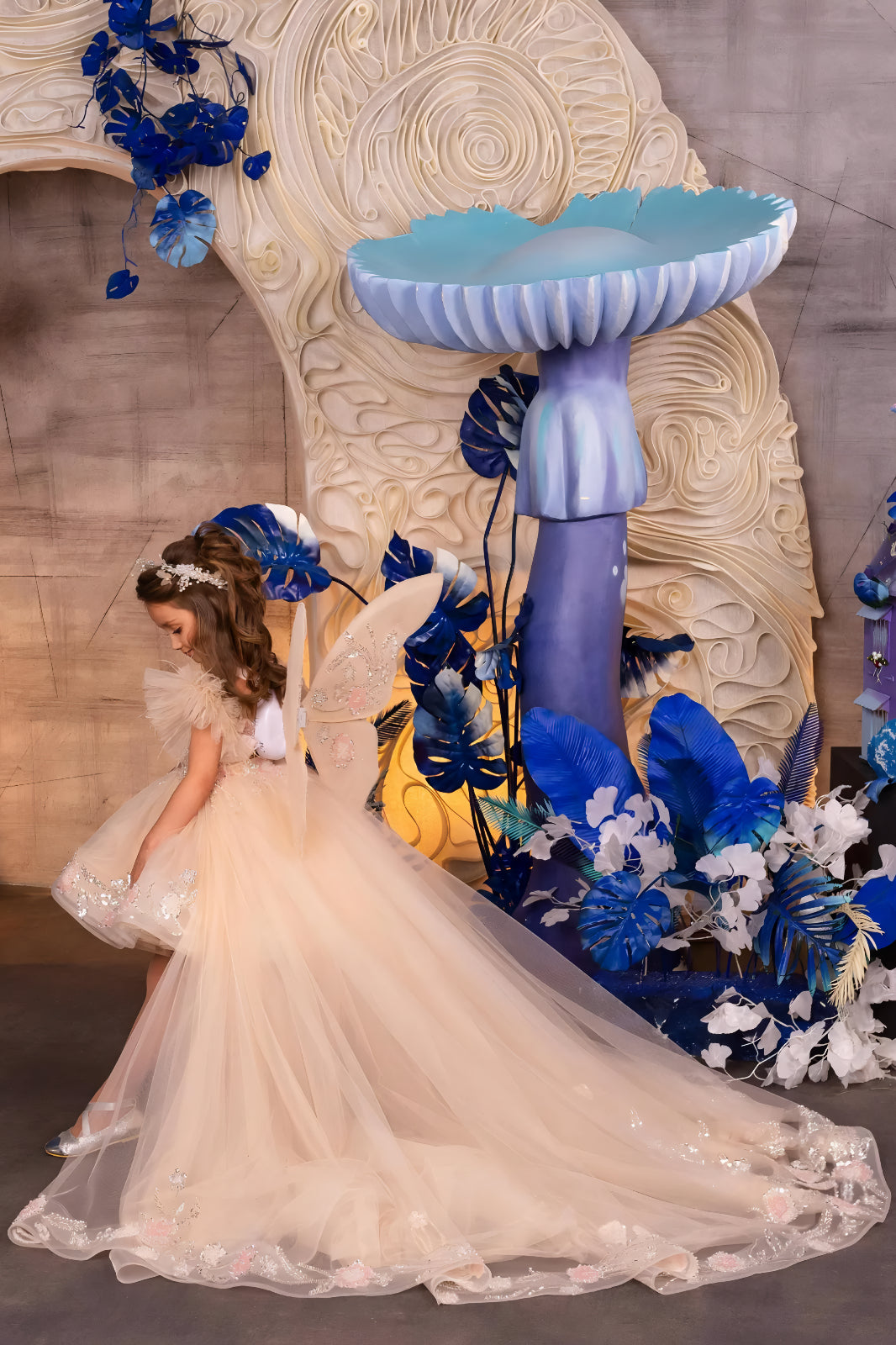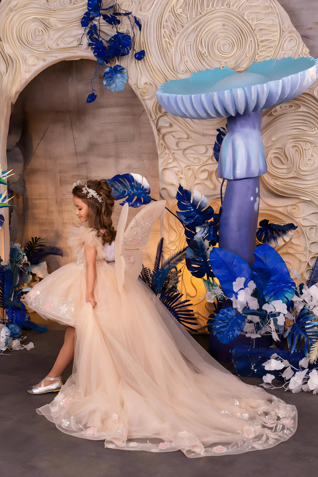 A dream in motion, the Celene girls pageant gown enchants with its cappuccino hi-lo silhouette, dramatic detachable train, and whisper-soft tulle puff sleeves. Sparkling with delicate sequin floral embroidery and fine couture craftsmanship, this dress is a stunning choice for luxury birthdays, pageants, and special celebrations. A showstopper of elegance and whimsy in one timeless design.