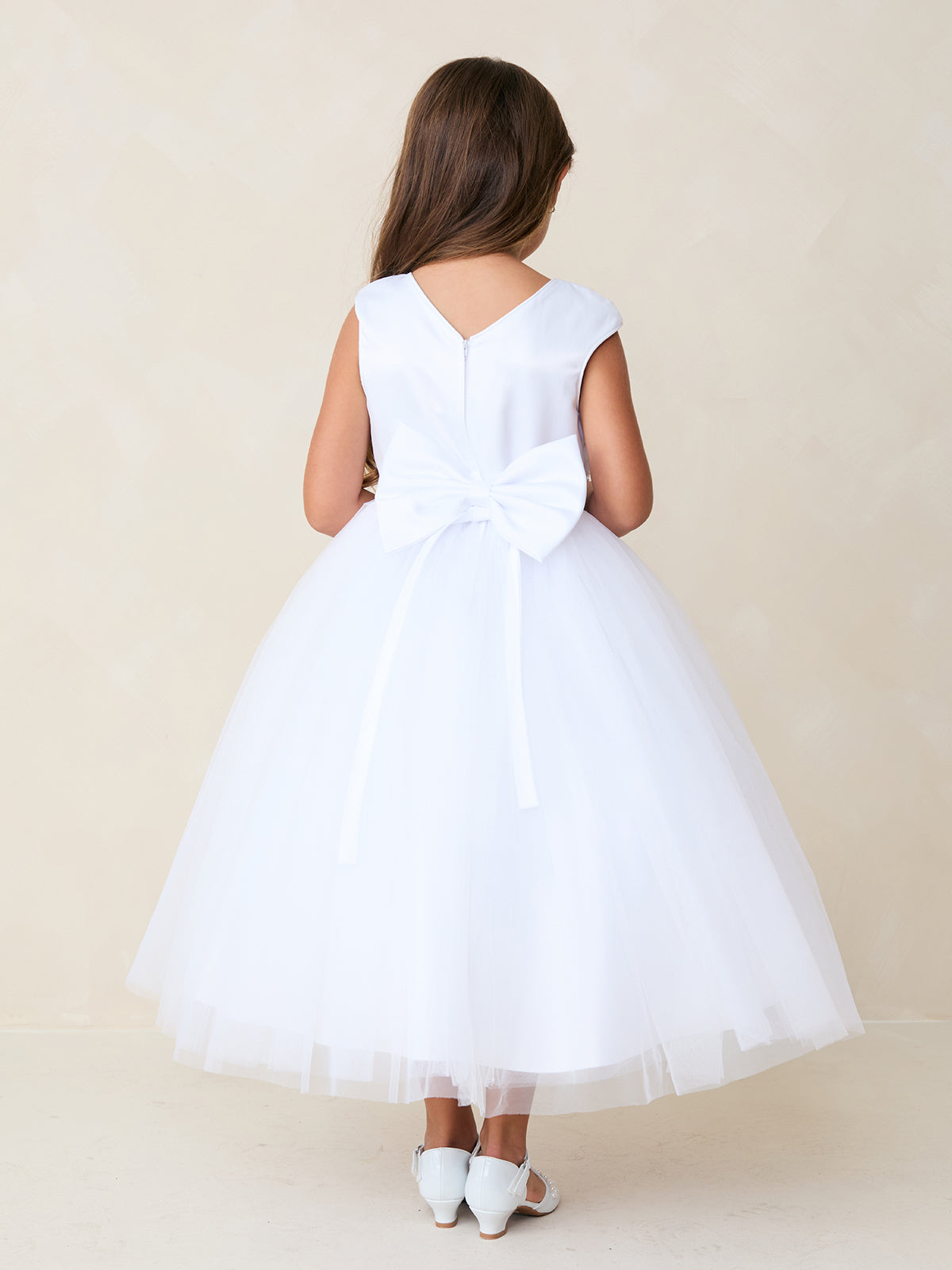 Elevate her elegance with the Celeste Luxe Tulle Gown, a timeless masterpiece designed for special occasions. This exquisite dress features a delicate satin bodice adorned with shimmering beadwork, flowing gracefully into a voluminous tulle skirt for a princess-like charm. The back boasts a statement bow, adding a touch of sophistication to this enchanting ensemble. Perfect for first communions, flower girl duties, and other memorable celebrations, this gown ensures she shines with grace and beauty. Customizable for the perfect fit, the Celeste Gown is a symbol of elegance and charm for your little one.