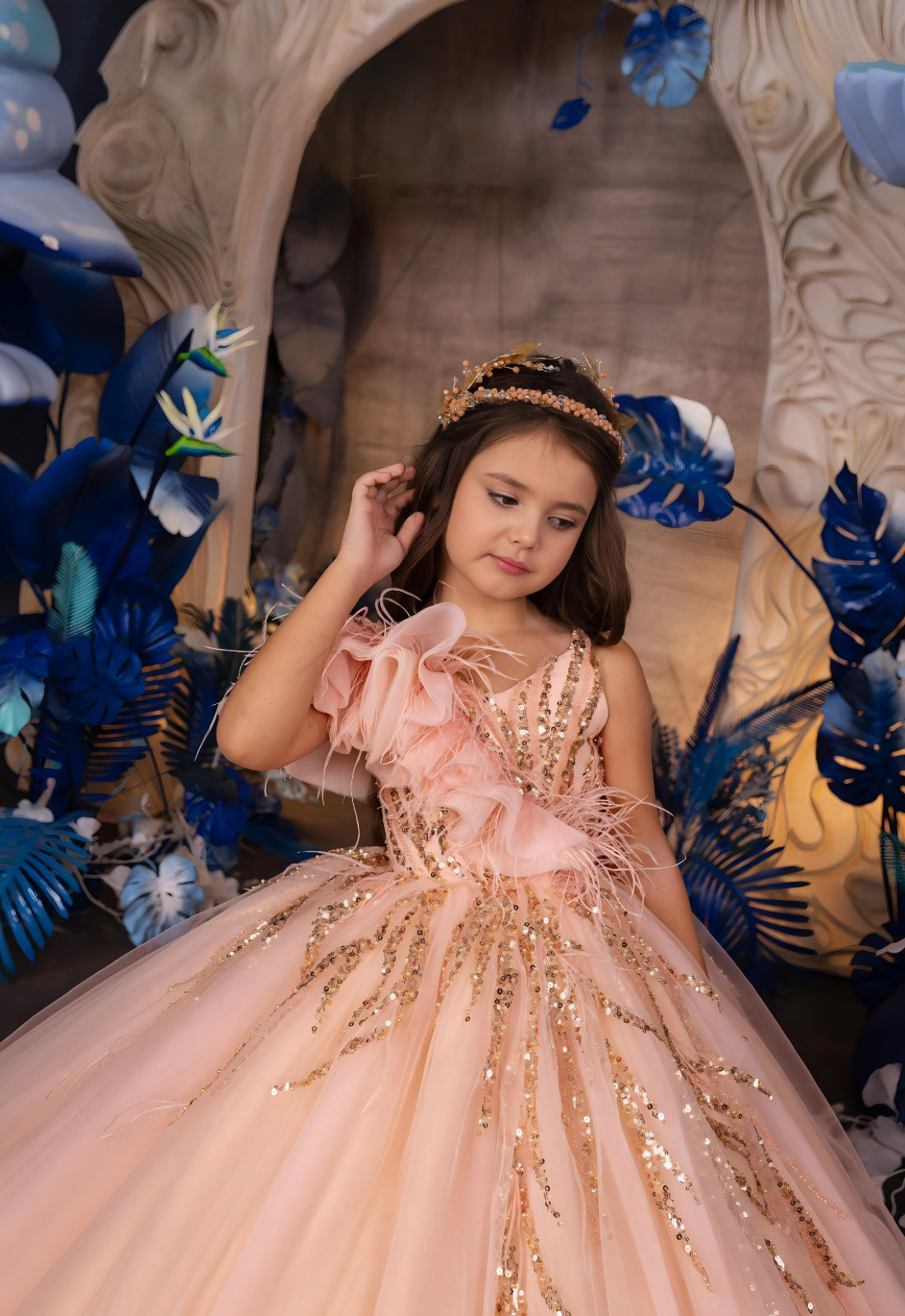 Step into a world of fantasy with the Celestia Enchanted Fairy Gown, a breathtaking custom couture masterpiece designed for the most magical occasions. This ethereal gown features cascading layers of soft blush tulle, adorned with golden sequined embellishments that shimmer like stardust. The intricately detailed bodice, with delicate feathered accents and hand-placed sequins, exudes regal elegance. Completing the look, sparkling fairy wings add a whimsical touch, making this dress perfect for pageants, galas, high-end events, or any unforgettable celebration. Designed to captivate, the Celestia Gown is a true work of art, ensuring your little one feels like a real-life fairy princess.