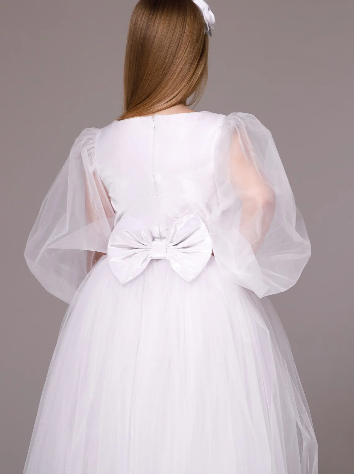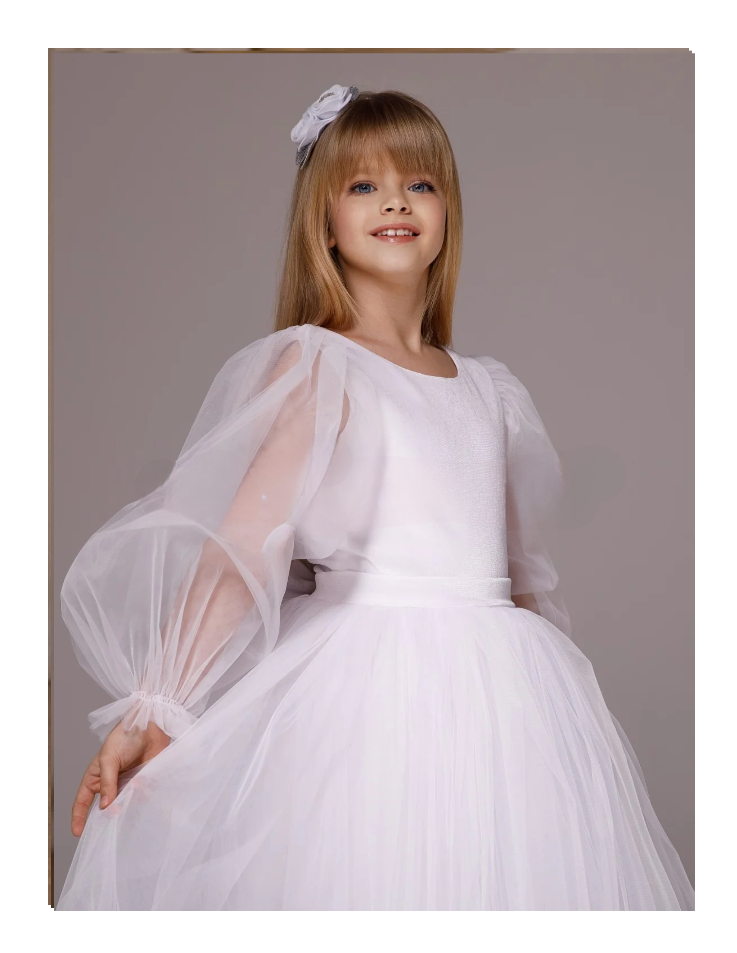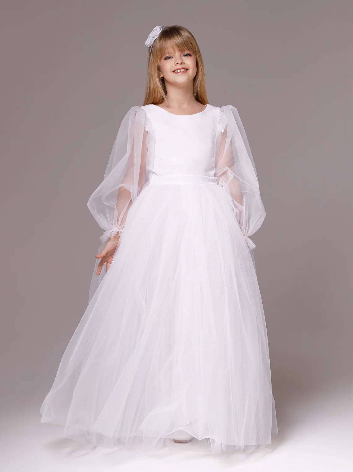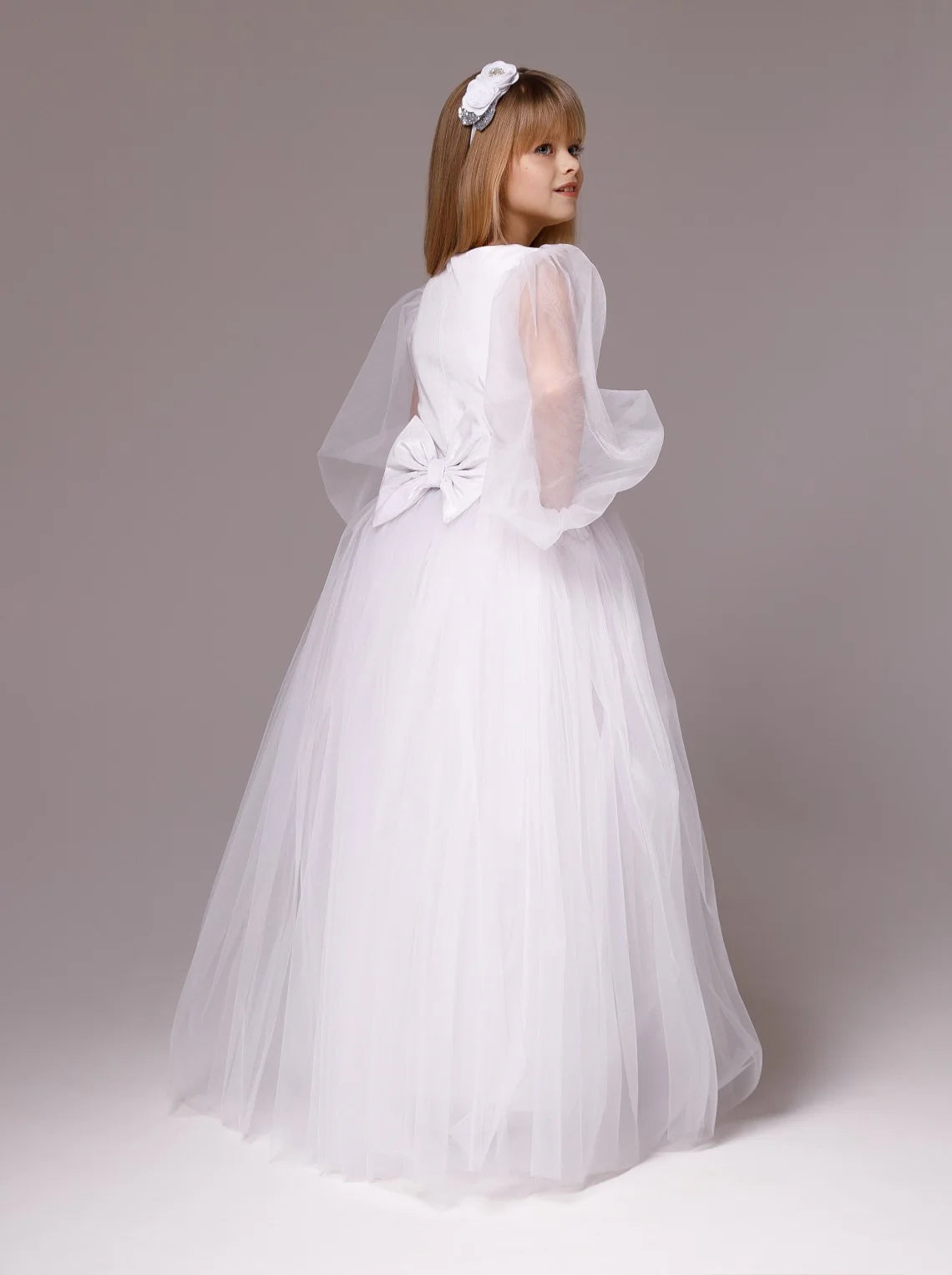 Make her special day unforgettable in the Celestine Dream Gown—a breathtaking couture dress crafted for little girls with big dreams. This enchanting white gown features ethereal balloon sleeves, a full tulle skirt, and a graceful bow at the back, blending classic charm with modern elegance. Perfect for first communion, flower girl duties, pageants, or any grand celebration, this dress is designed to make your child feel like a princess. Its soft, layered tulle ensures twirl-worthy moments, while the delicate details provide comfort and style for every special occasion.