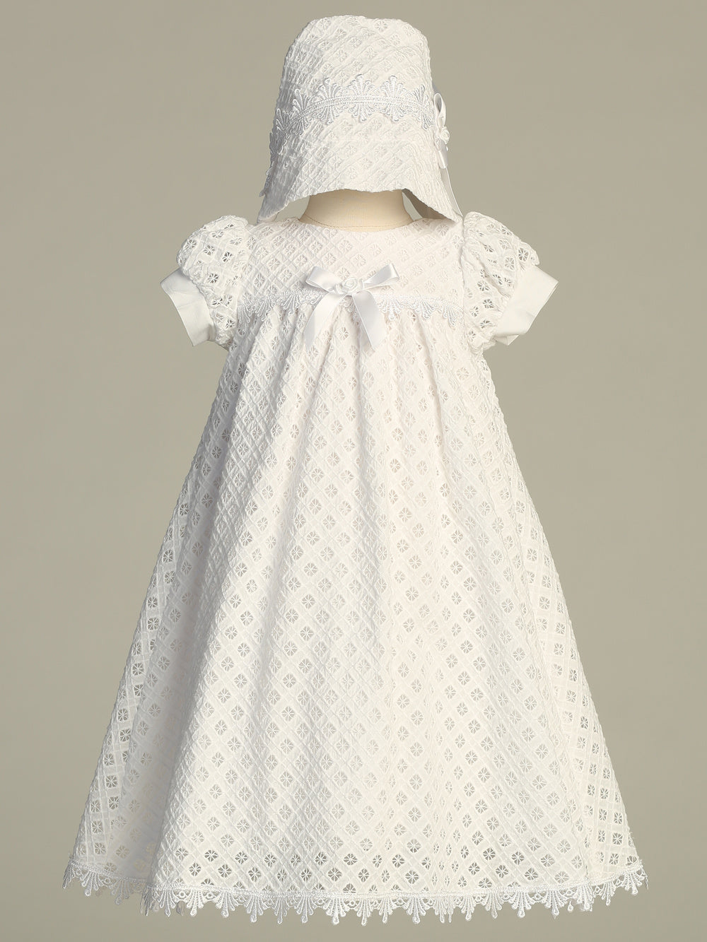 A breathtakingly delicate choice for your little one's special day, the Celestine Grace Christening Gown is adorned with intricate embroidered lace and a charming diamond-patterned overlay. Featuring dainty cap sleeves, pearlescent buttons, and a matching quilted lace bonnet, this heirloom-quality dress is a vision of grace and refinement. Made with the finest craftsmanship in the USA, this gown ensures your baby looks angelic while remaining comfortable. Bonnet included. Made in the U.S.A.