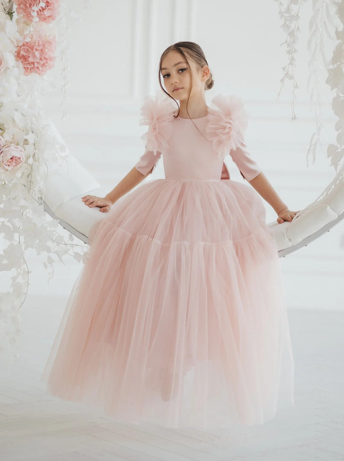 Elegant, modest, and utterly enchanting - the Celine Flower Girl Floor Length Tulle Dress is a show stopping look for your little one's special day. This luxurious couture dress will make your flower girl feel like a true princess. The soft blush hue and flowing tulle create an ethereal, romantic look that's perfect for weddings, formal events, and more. Crafted with premium materials and attention to every detail, this dress will have all eyes on your little one. Whether she's the star of the show or simply a cherished guest, the Celine Flower Girl Dress will make any girl feel beautiful, confident, and ready to celebrate in style.