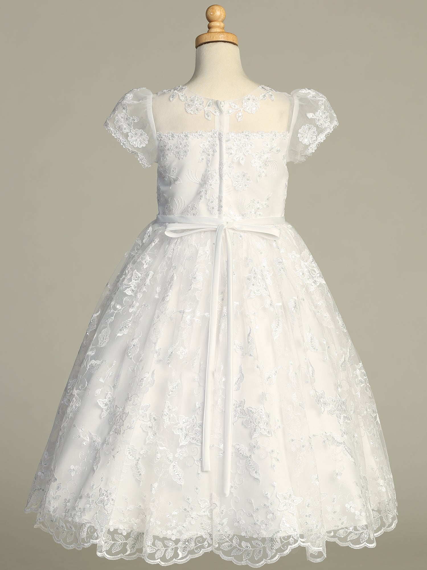 Celebrate her sacred milestone with the Chantilly First Communion Dress – a beautiful holy communion tea-length gown. This dress features intricate lace embroidery, sheer short sleeves, and a satin waist tie for a classic and elegant look. Designed for 1st communion and other special occasions, the tea-length style offers timeless charm and comfortable wear, ensuring she feels special on her big day. With a soft lining and delicate lace overlay, the Chantilly dress is a perfect blend of grace and sophistication.