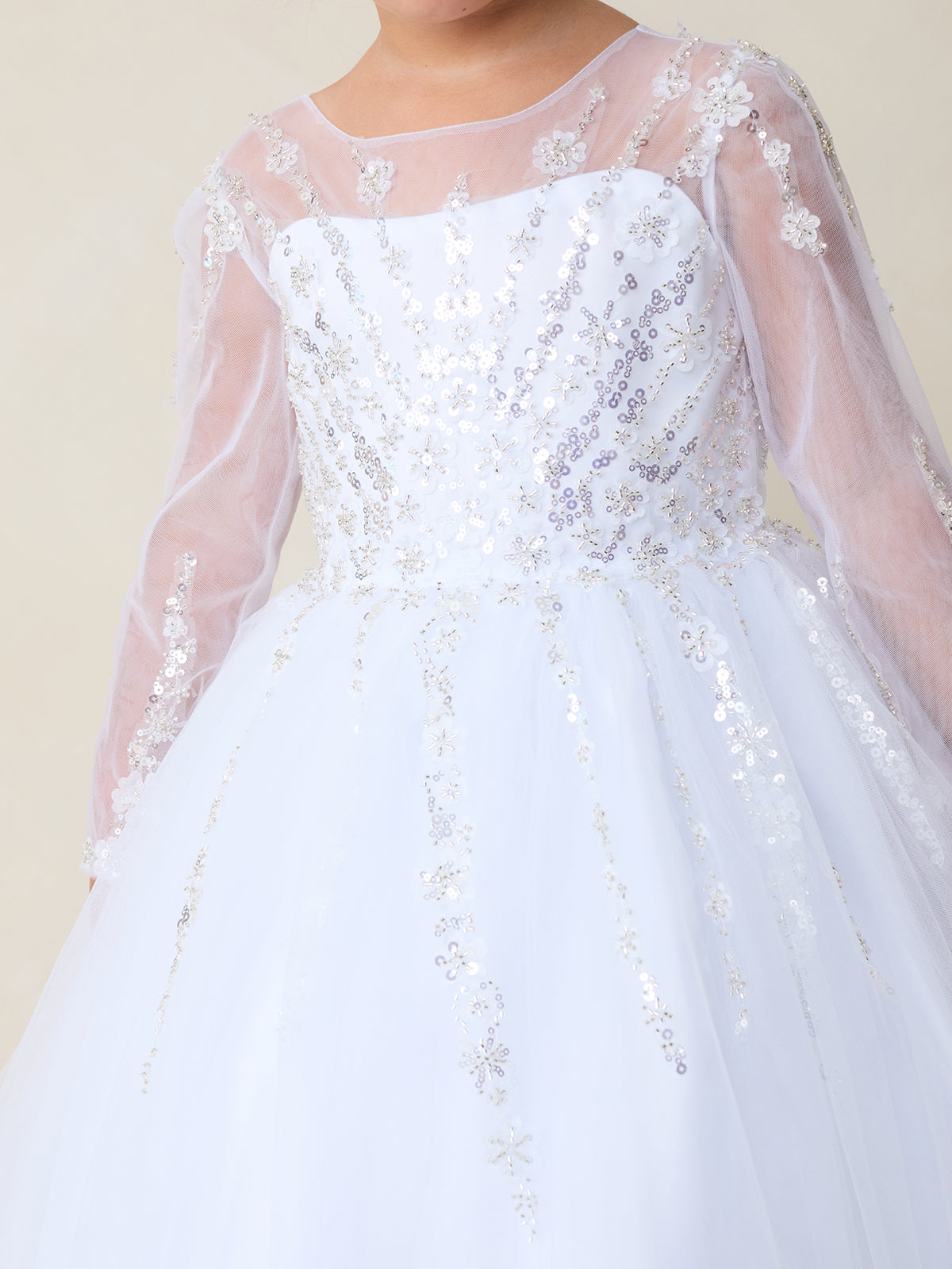 Let her shine in the Charlotte Bloom Communion Gown, a breathtaking masterpiece designed for First Communion, flower girl, and special occasions. This gown features a delicate illusion neckline and sheer long sleeves, adorned with intricate floral appliqués and shimmering sequin details that add a touch of magic. The voluminous layered tulle skirt creates an ethereal silhouette, making her feel like a true princess. Designed for elegance and comfort, this gown ensures she stands out on her special day.